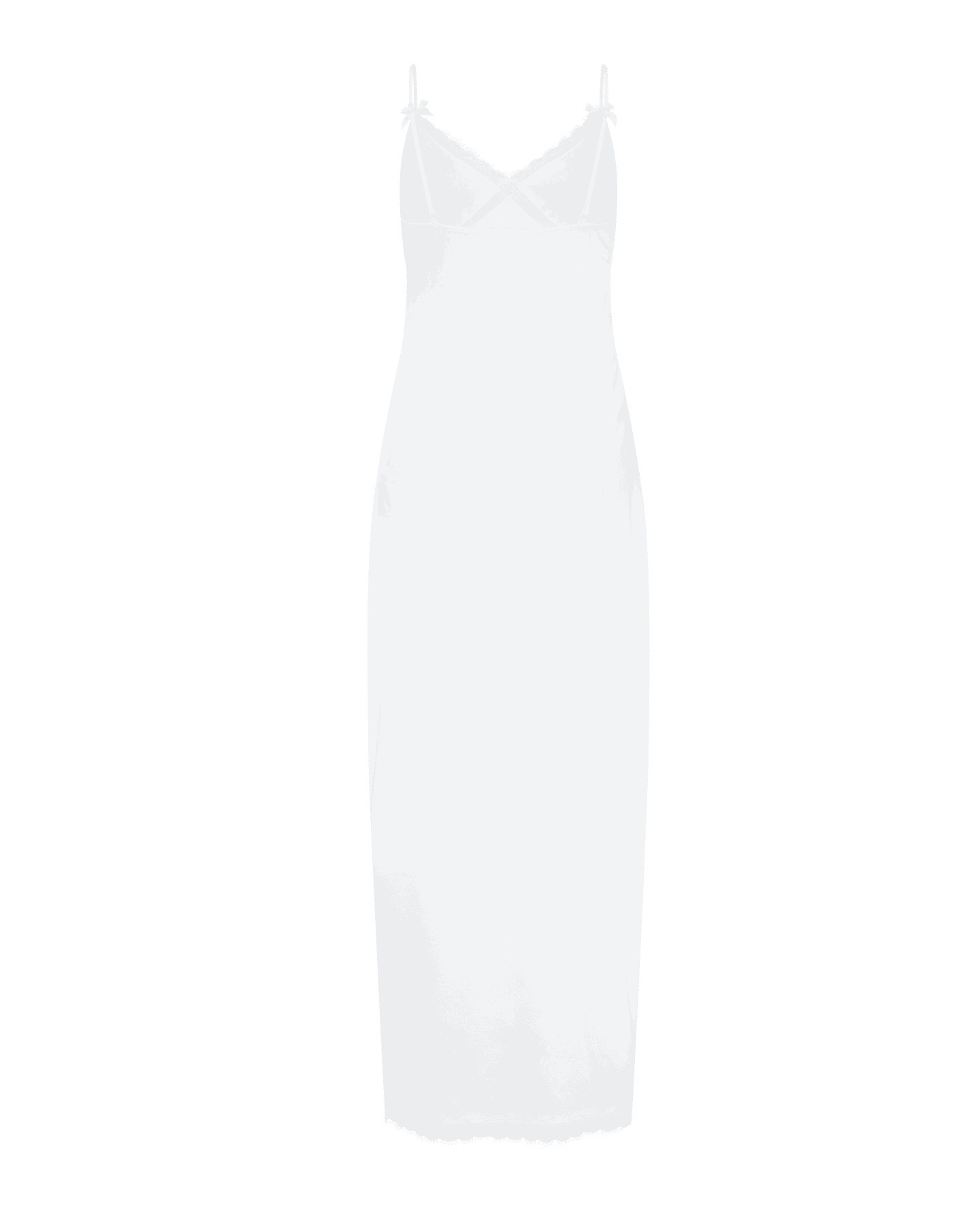 Длинная сорочка Gisele белого цвета из эластичного шелкового атласа отделана кружевом Leavers. Регулируемые бретели обеспечивают идеальную посадку. Идеальная основа для нежного лука с кимоно Gisele.