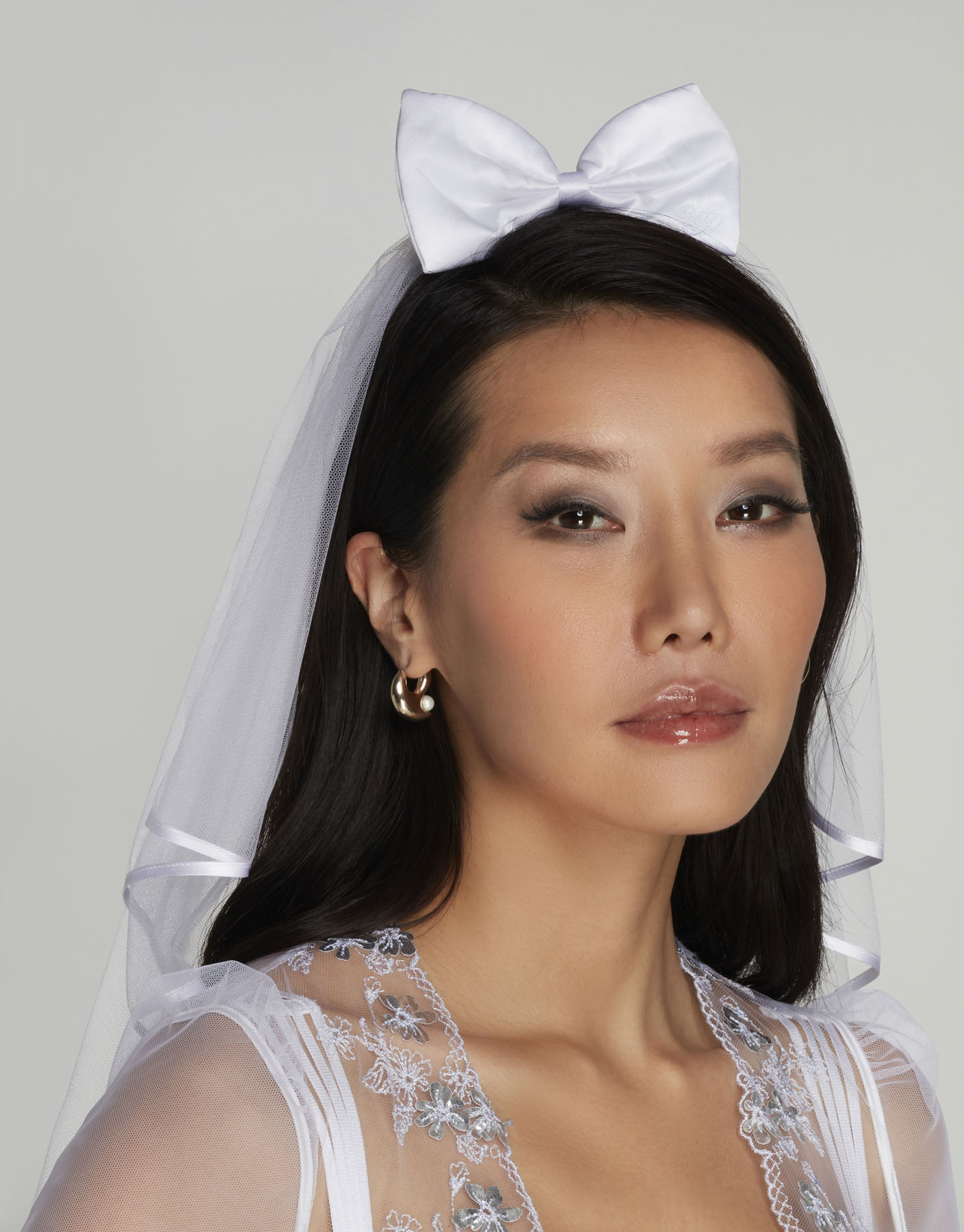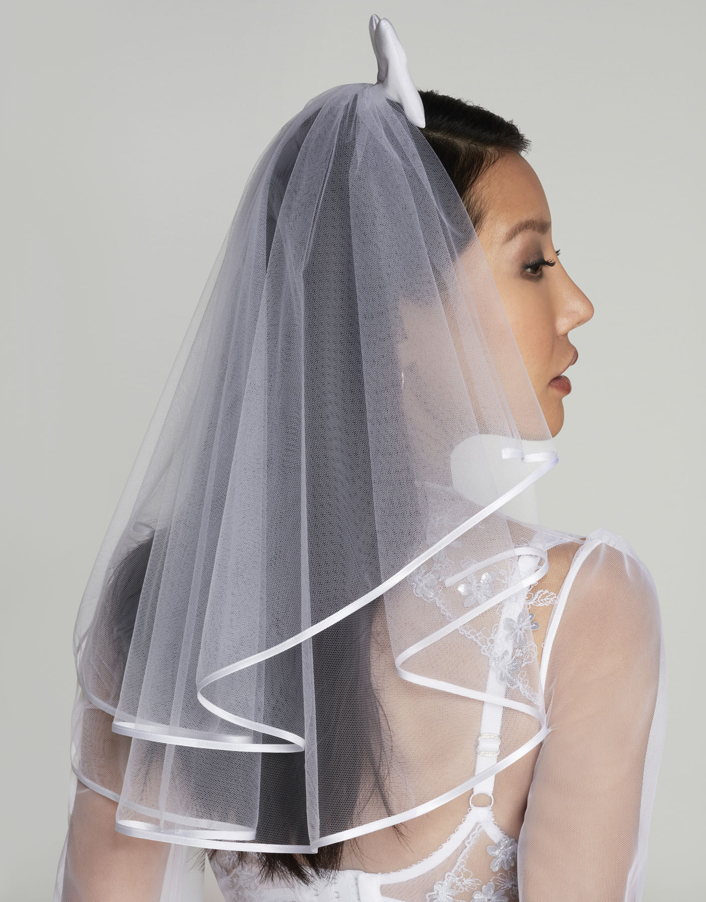 Фата Frannie с большим шелковым бантом на вершине и атласной отделкой по краю станет великолепным дополнением свадебного образа. Легко крепится к волосам благодаря серебристому гребню. Создайте завершенный образ, дополнив ее трусиками из коллекции Frannie.