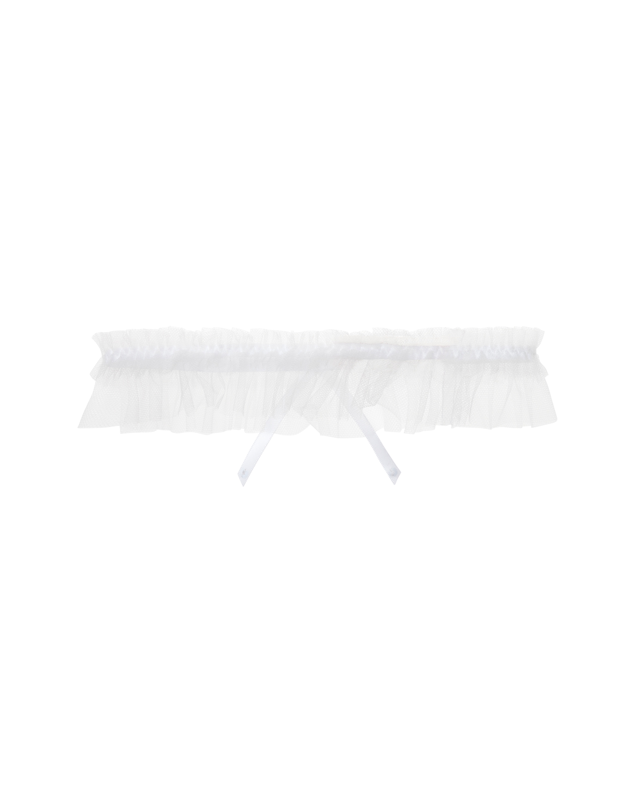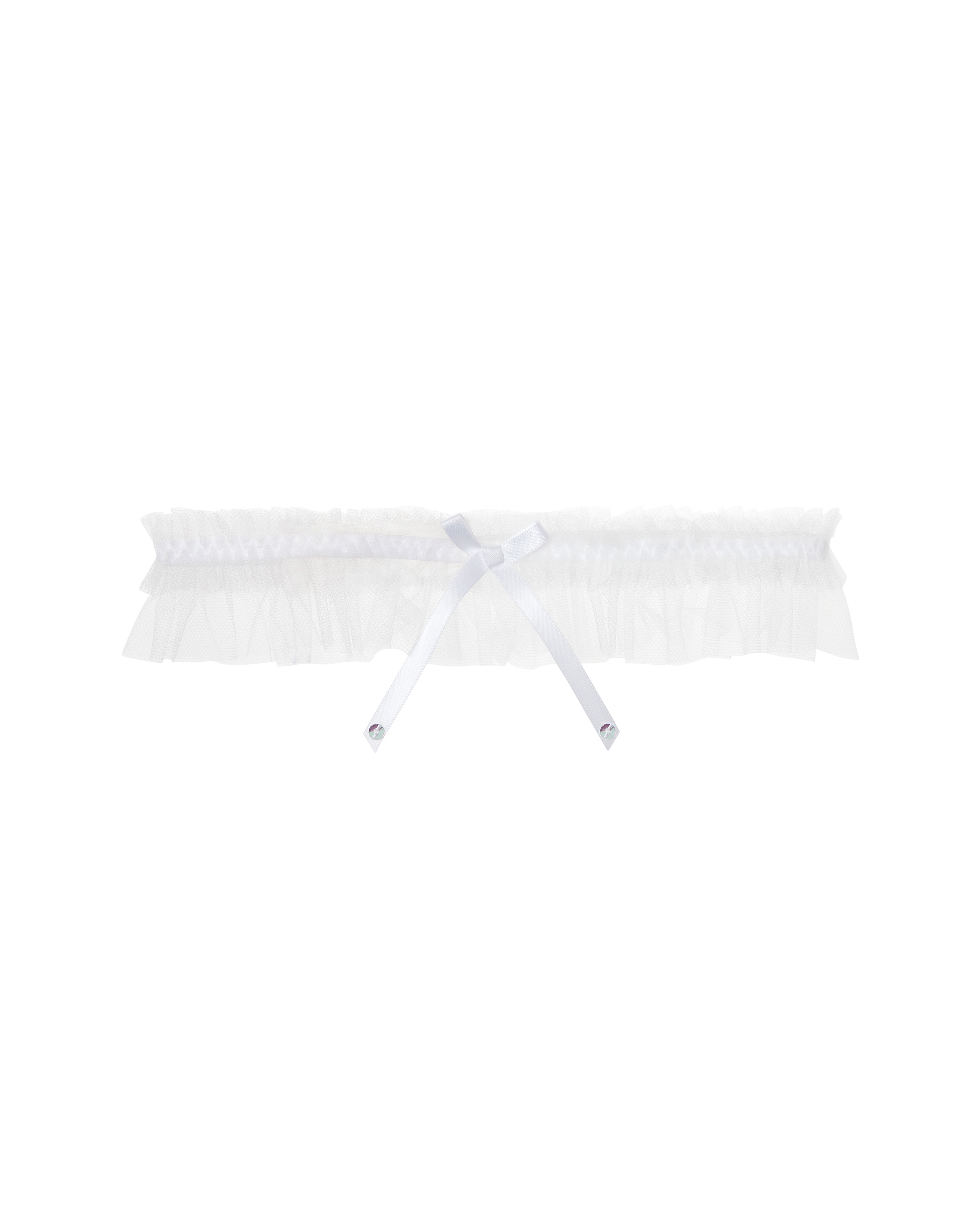 Подвязка Melle из белого итальянского тюля с нежными рюшами и атласным бантом, украшенным пайетками. Сочетайте с остальными изделиями из коллекции Melle, чтобы создать нежный образ.