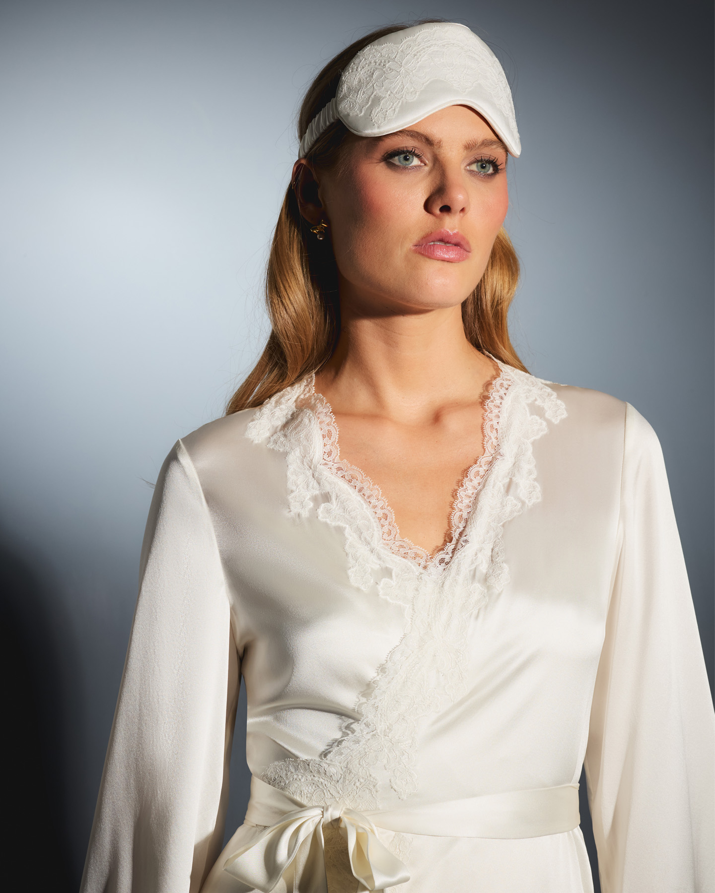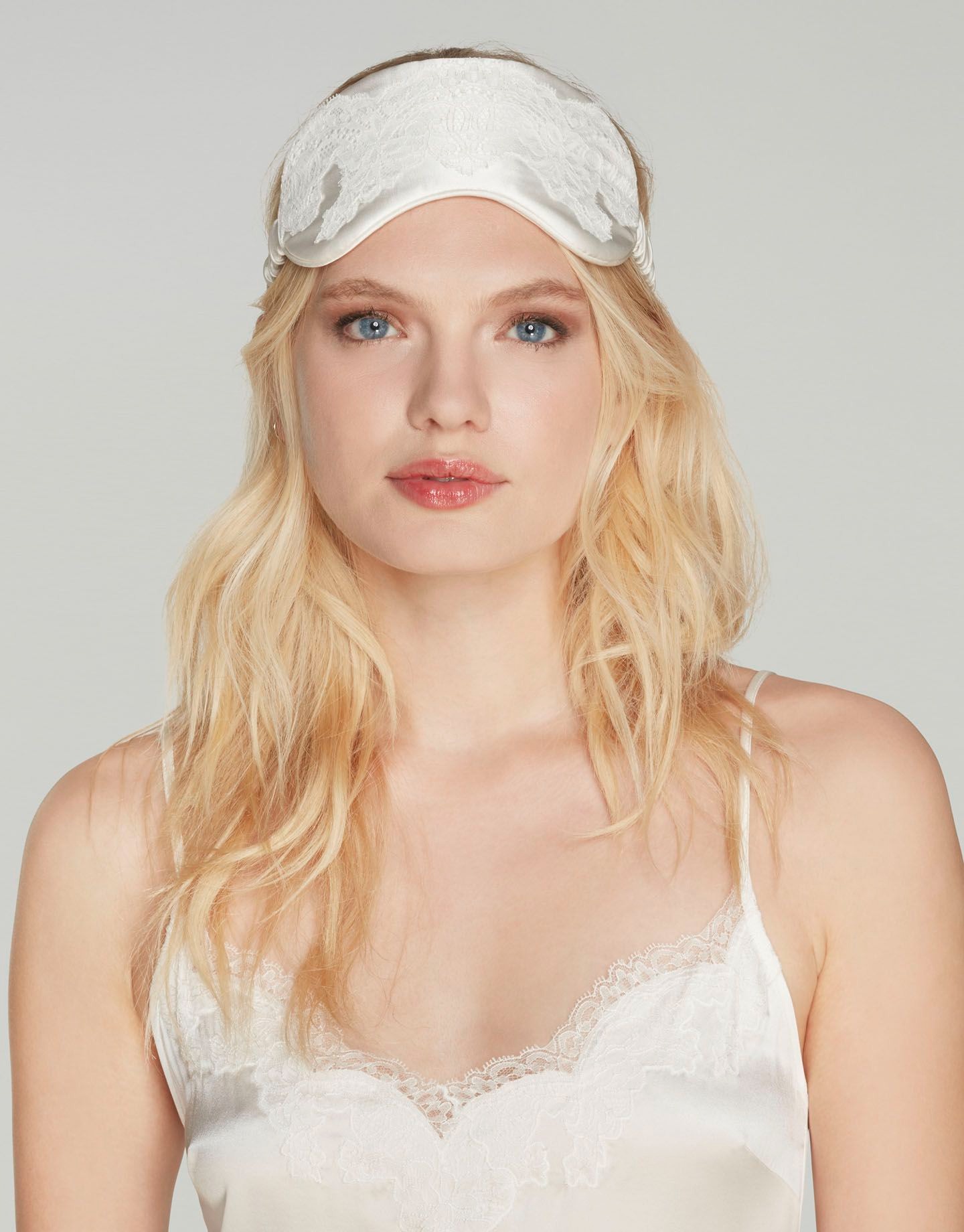 Amelea – роскошная коллекция одежды для дома в винтажном стиле, выполненная в классических цветах Agent Provocateur. Маска для сна из белого шелкового сатина дополнена резинкой с присборенной тканью. Спереди маска украшена нежным белым французским кружевом. Эластичная резинка для комфортной носки.