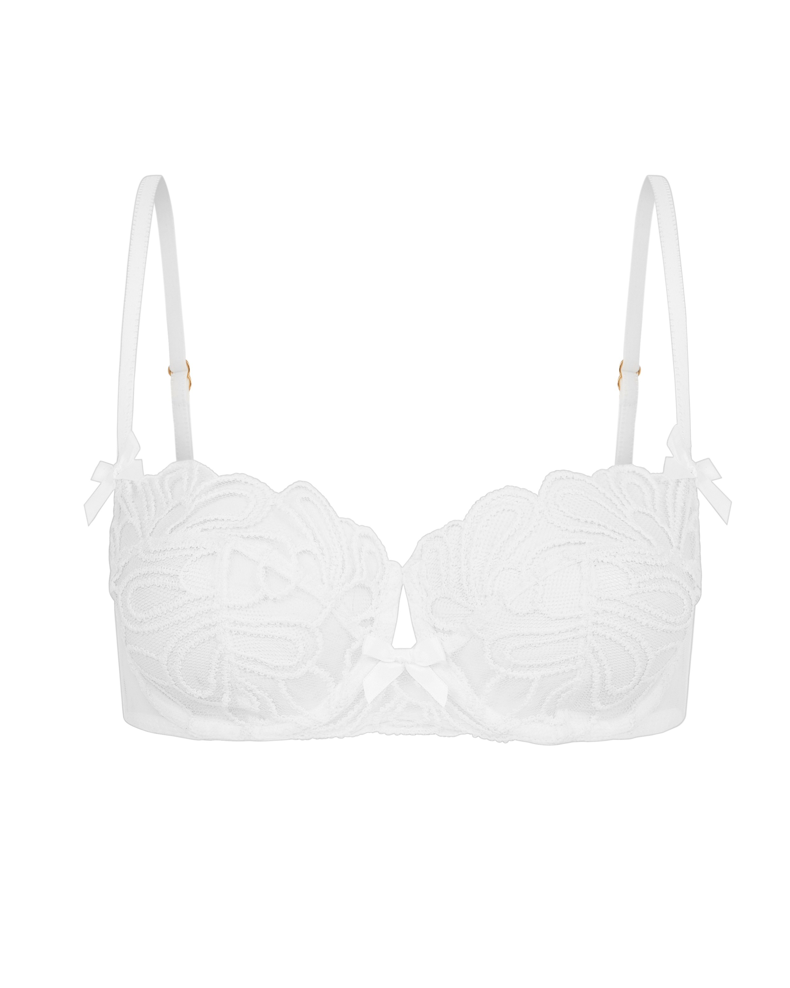 Бюстгальтер-балконет Nelle белого цвета выполнен из итальянского тюля с изящной вышивкой в виде ромашек. Дополнен нежными бантами и золотой фурнитурой. Сочетайте с коллекцией Nelle, чтобы ваши будни заиграли новыми, пикантными красками.