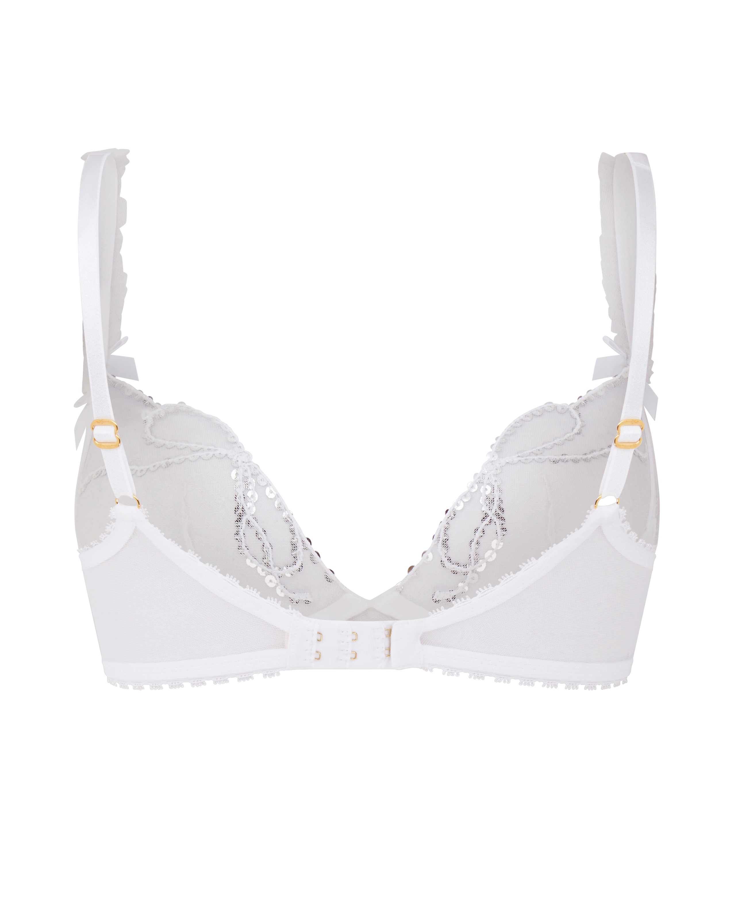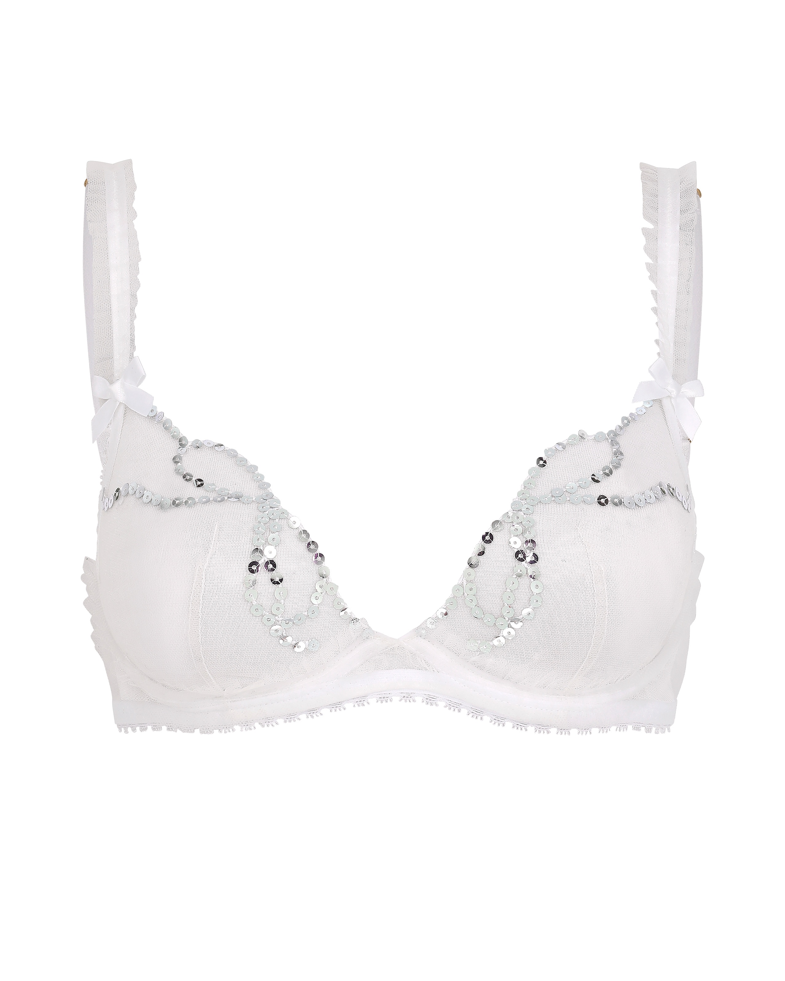 Бюстгальтер Melle в белом цвете с мягкими чашками выполнен из прозрачного итальянского тюля и украшен сияющими серебристыми пайетками. Рюши на бретелях и изящная отделка из кружева с ресничками придают образу нежности. Фурнитура с позолотой. Носите с остальными элементами коллекции Melle.