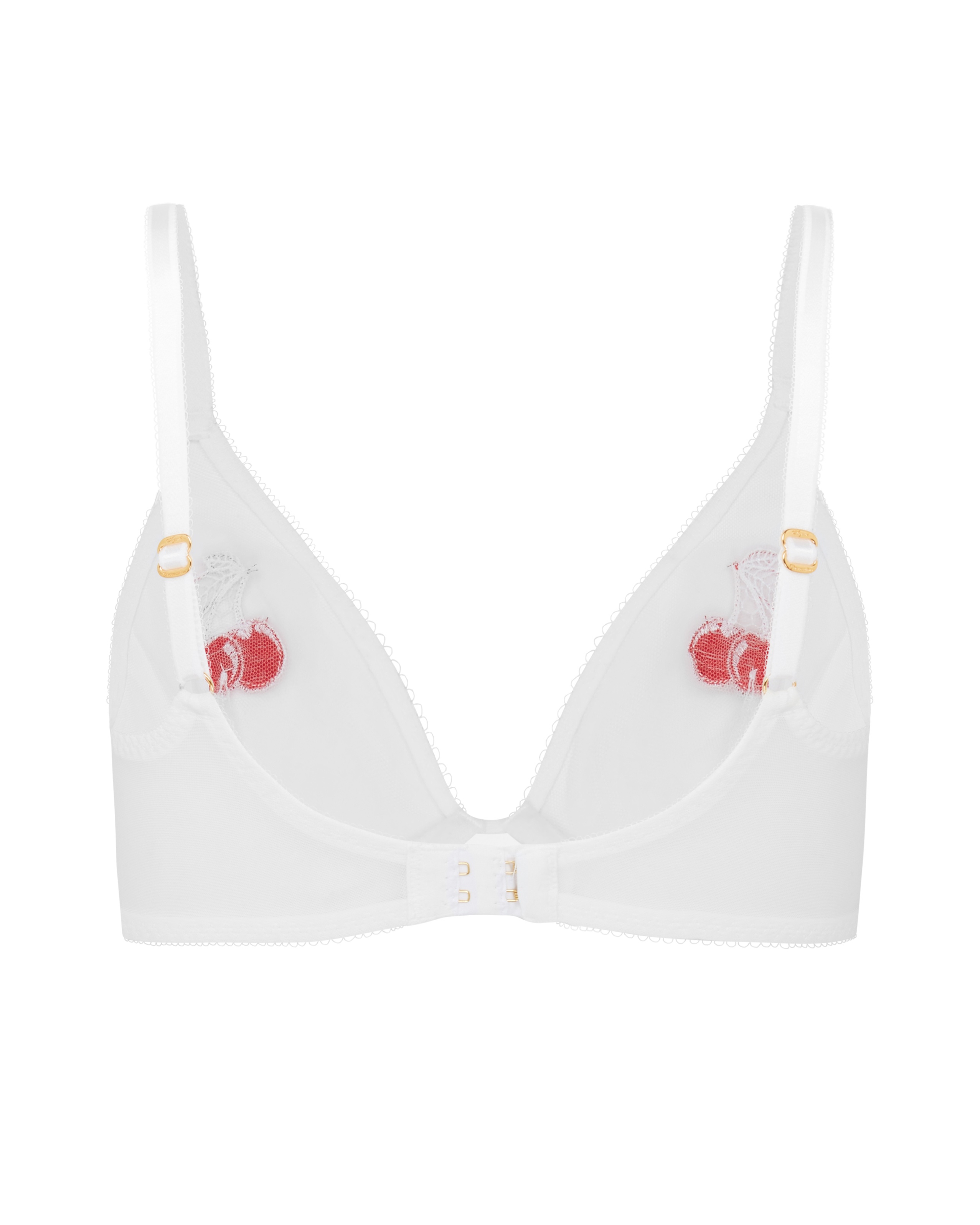 Бюстгальтер Perri белого цвета из прозрачного тюля украшен вышивкой в виде вишен, выполненной вручную. Боковые косточки, резинка пико и золотистая фурнитура обеспечивают безупречную посадку. Полный комплект Perri гарантирует, что все взгляды будут устремлены на вас.