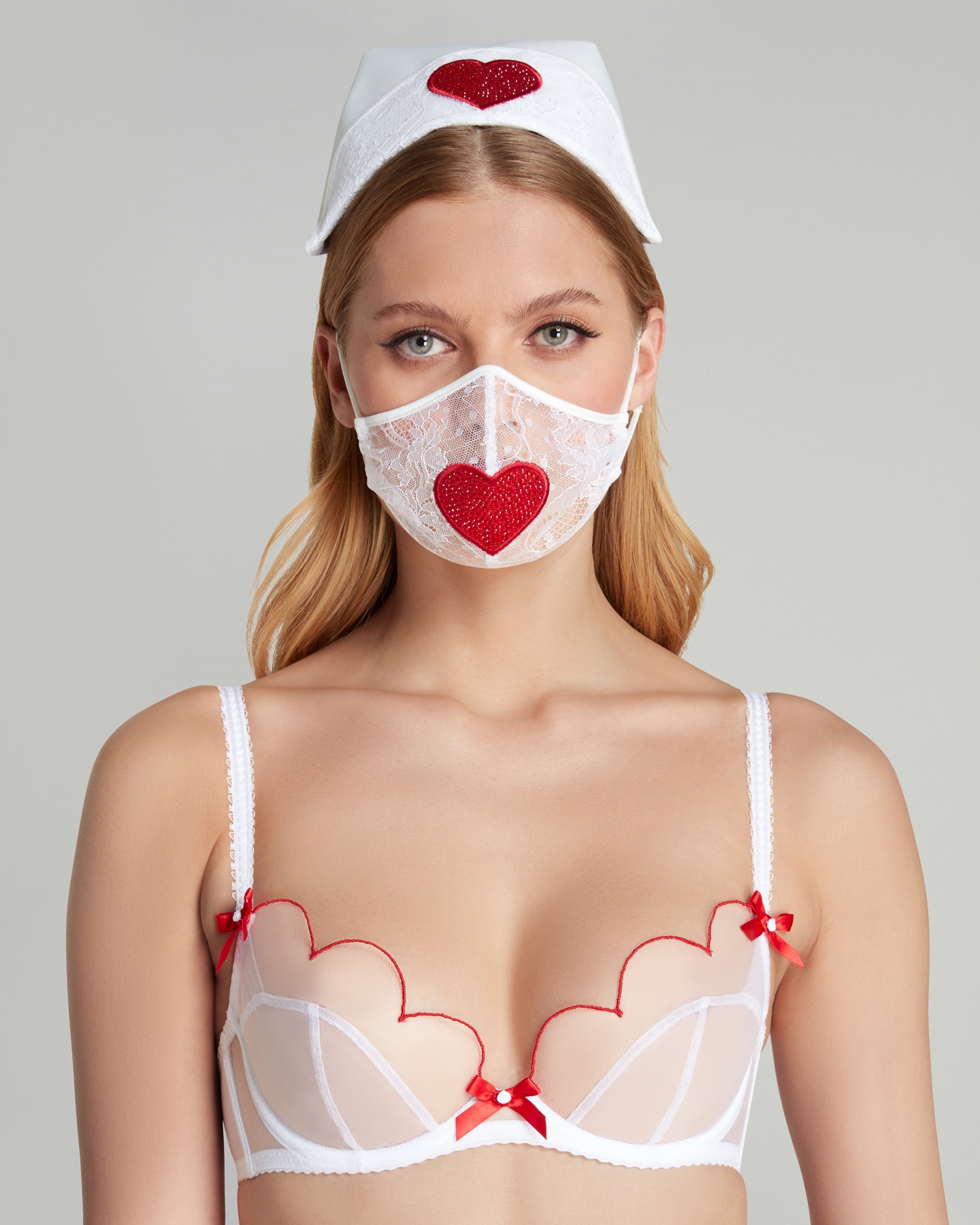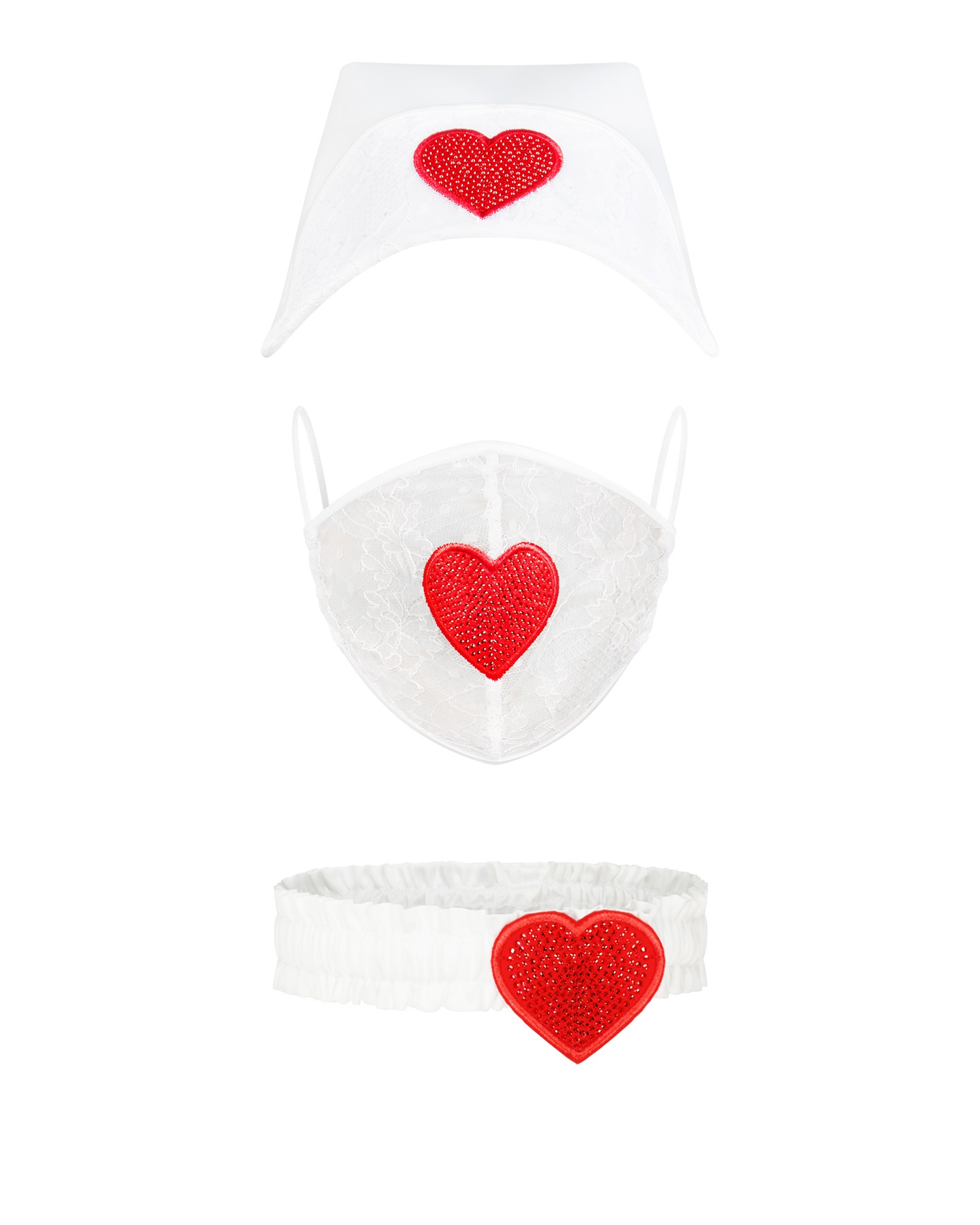 Белый набор Nurse: атласная шапочка медсестры с зажимами для волос, подвязка и полупрозрачная маска с красным декором. Тематический образ для игры.