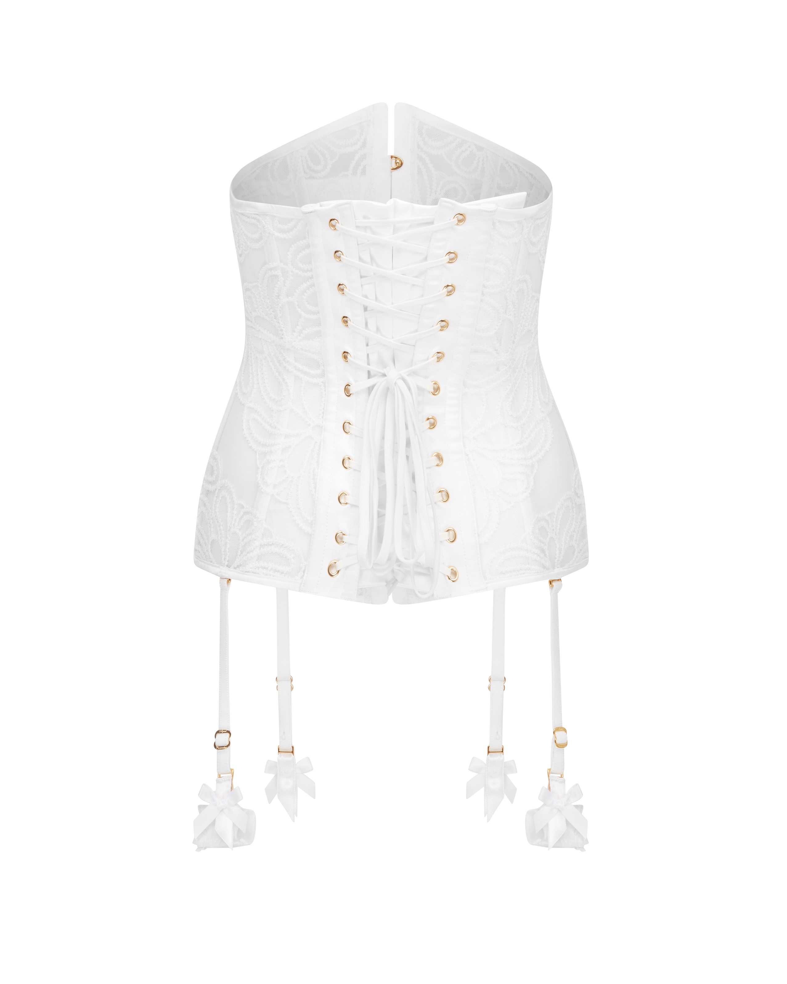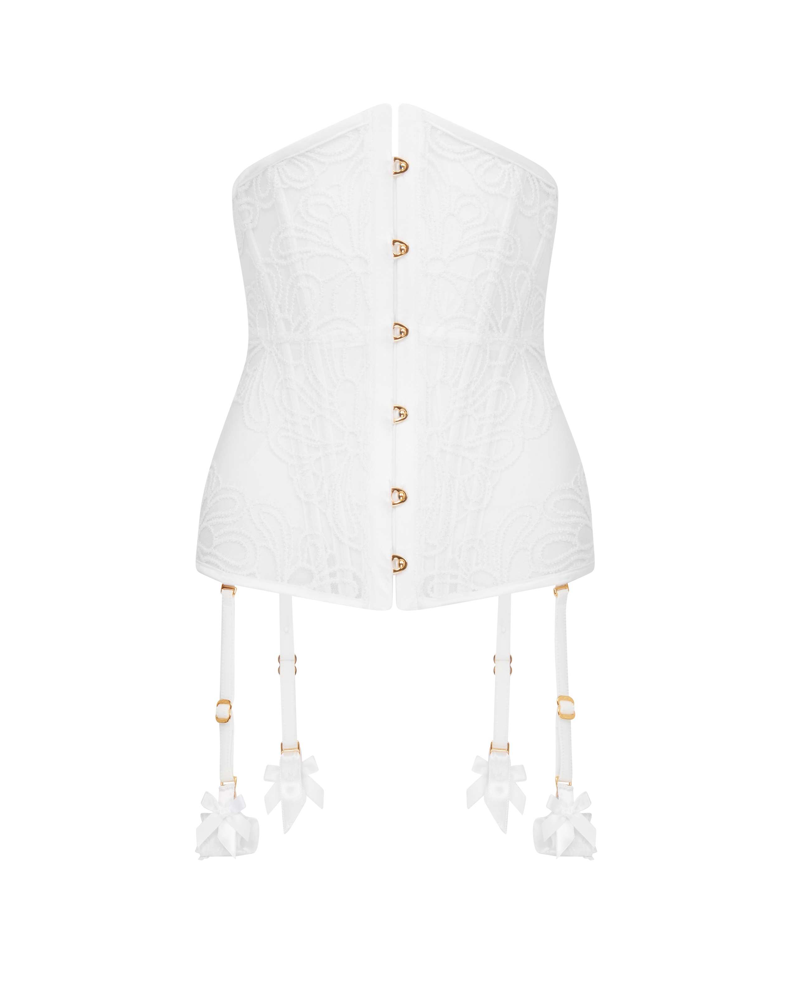 Корсет Nelle белого цвета с изящной вышивкой, прозрачными тюлевыми вставками и съемными подвязками. Дополнен золотой фурнитурой и атласным бантом — элегантный и соблазнительный.