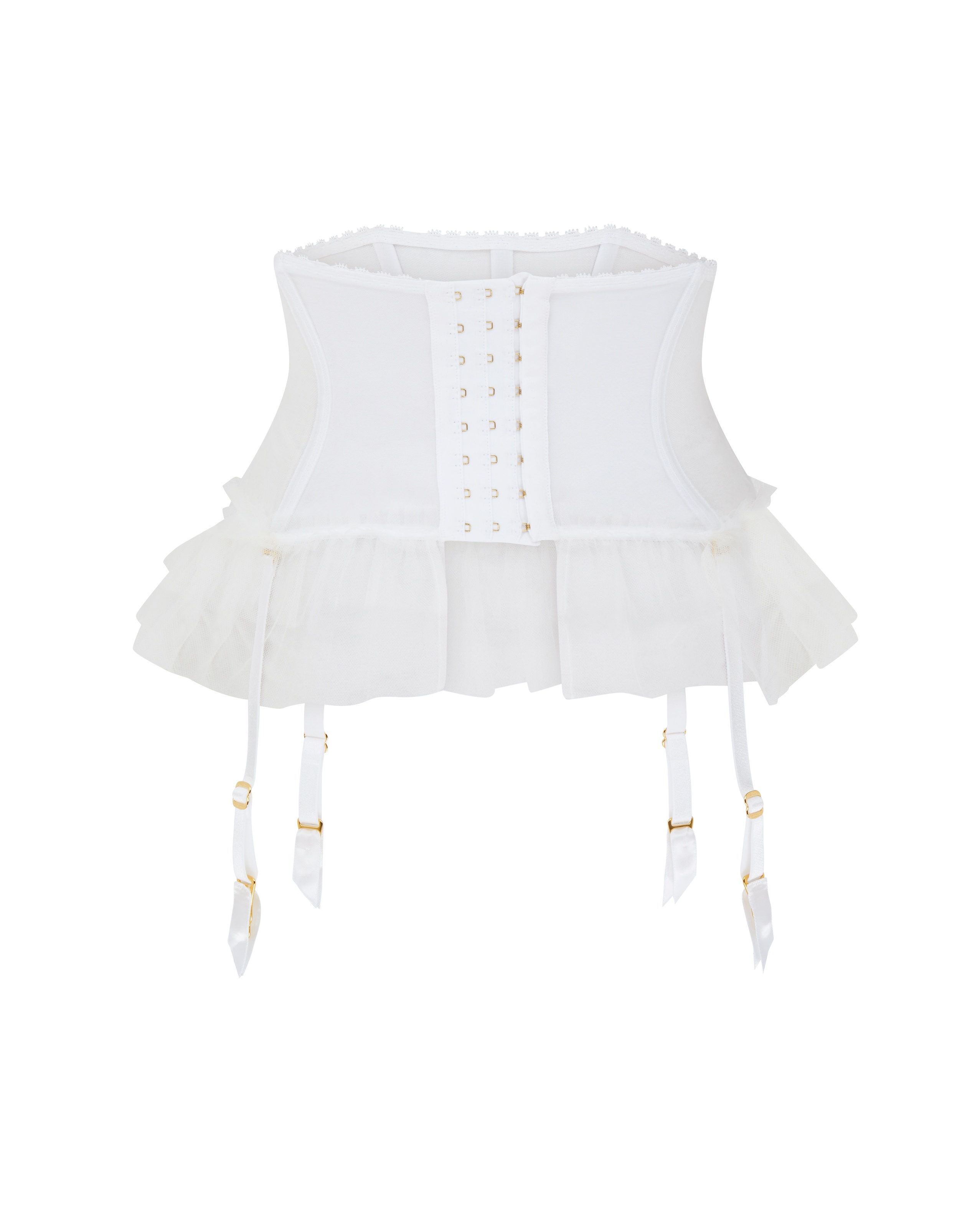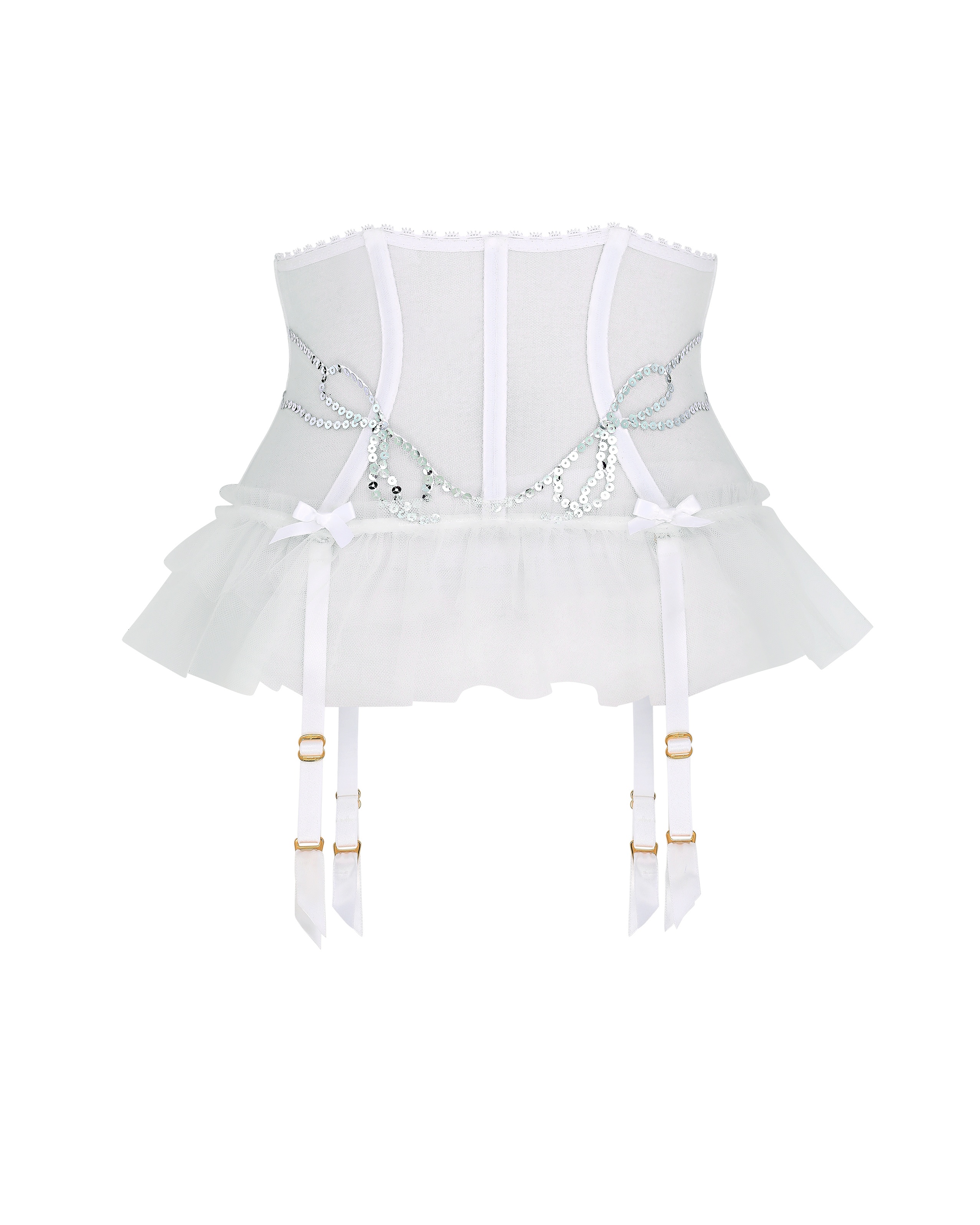 Белый корсетный пояс Melle создан из прозрачного тюля с пайетками и усилен косточками для создания эффектной линии талии. Съемные подвязки с позолоченной фурнитурой и воздушные рюши по краю добавляют нежности. Сочетайте с остальными изделиями из коллекции Melle для создания романтичного образа.
