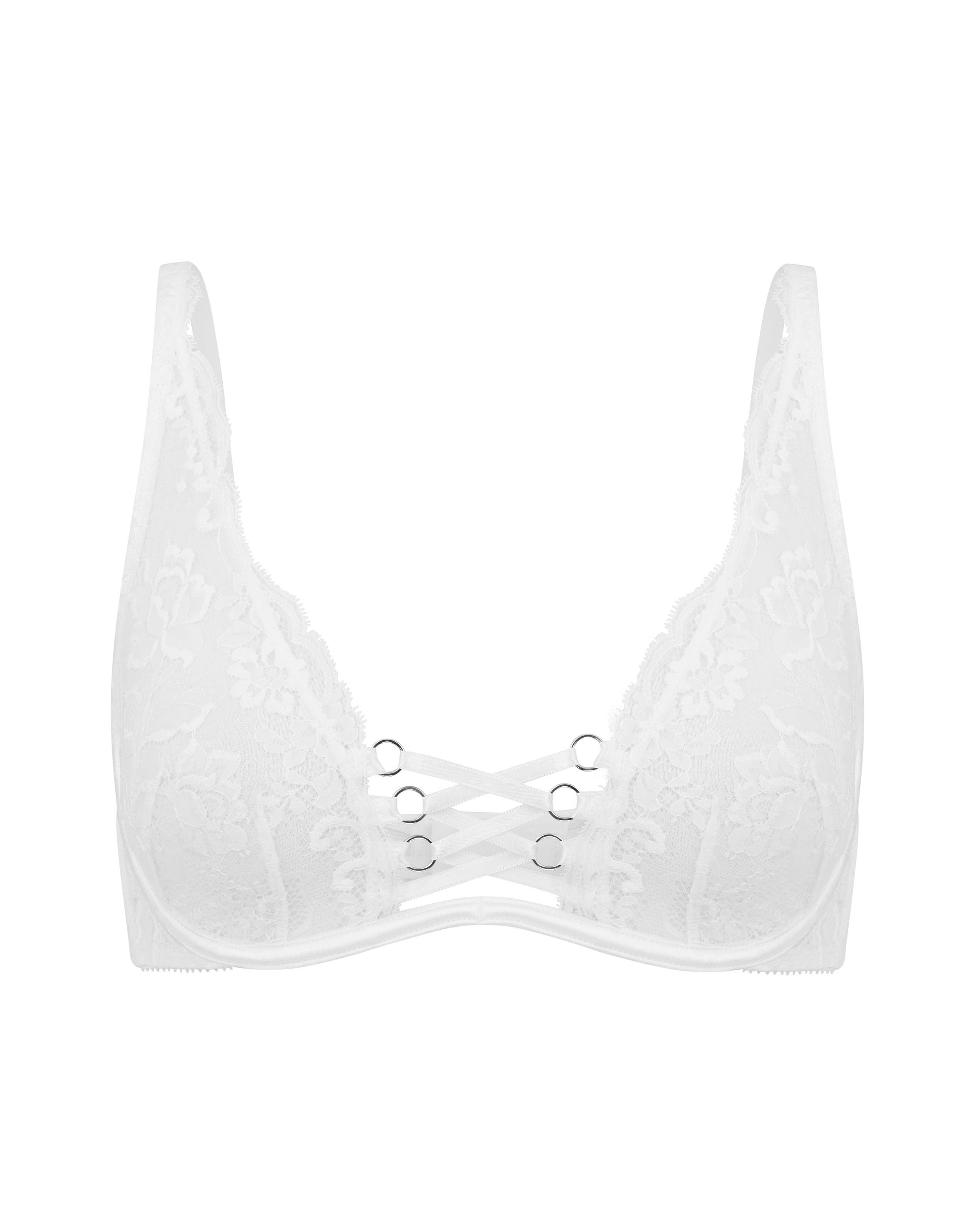 Нежный и романтичный характер бюстгальтера Essie создан за счет невероятно тонкого кружева с цветочными мотивами. Центральная часть глубокого декольте украшена атласной шнуровкой, которая стала одной из символичных для бренда деталей. Эта модель в паре с трусиками из этой же серии станет отличным вариантом для свадебного образа.