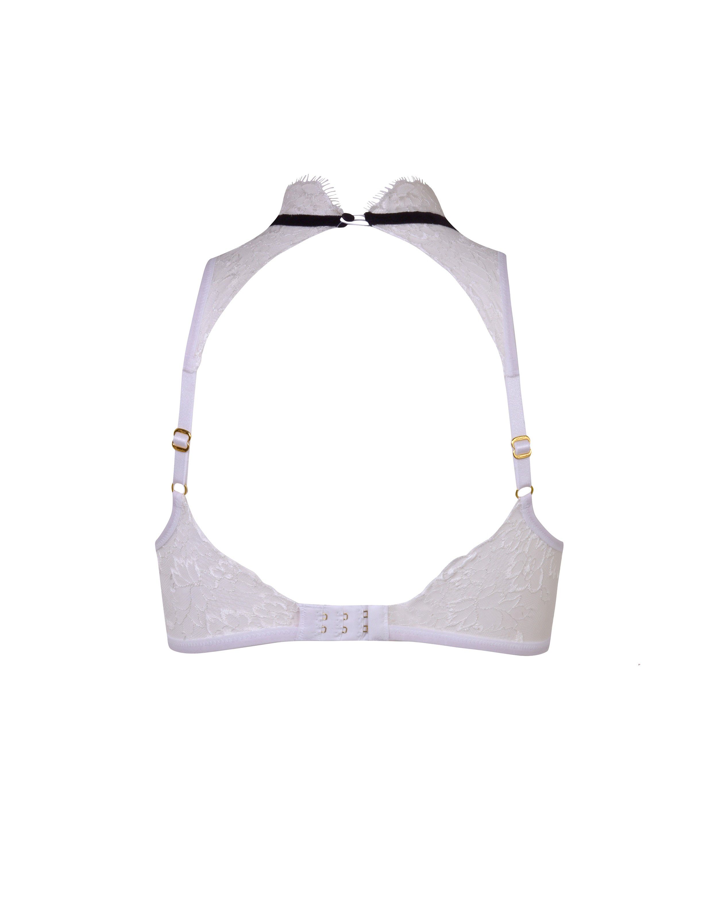 Для бюстгальтера Parker дизайнеры выбрали тончайшую дышащую сетку бежевого цвета, а декор белым кружевом шантильи поверх нее создает нюдовый эффект. Модель с закрытым декольте и «американской» проймой дополнена косточками по нижнему краю, что обеспечивает комфортную поддержку груди. В качестве акцента - черная лента с бантом на шее. Застежка на крючки.