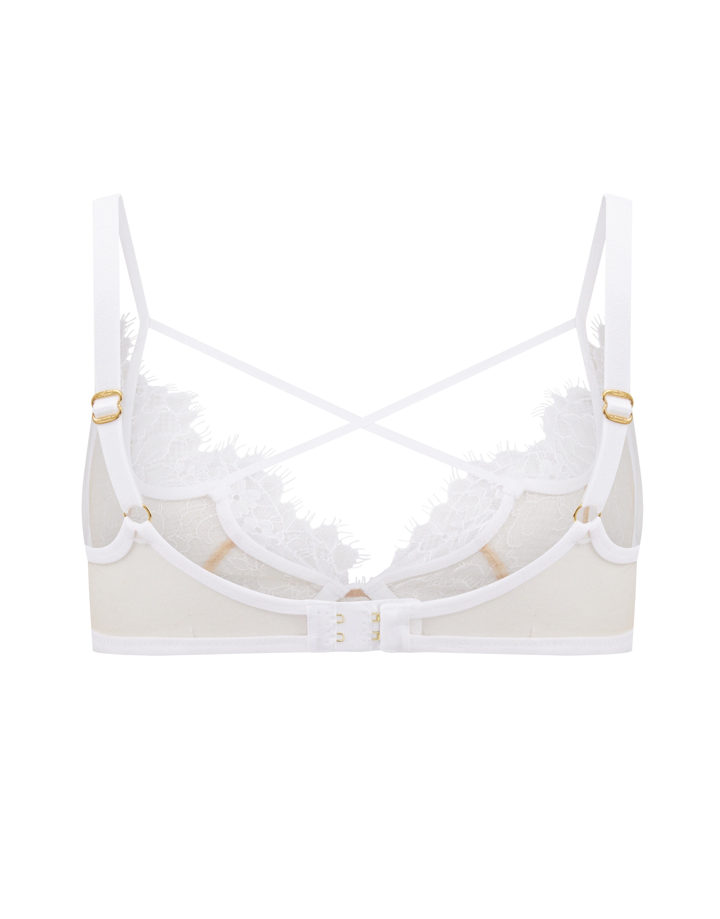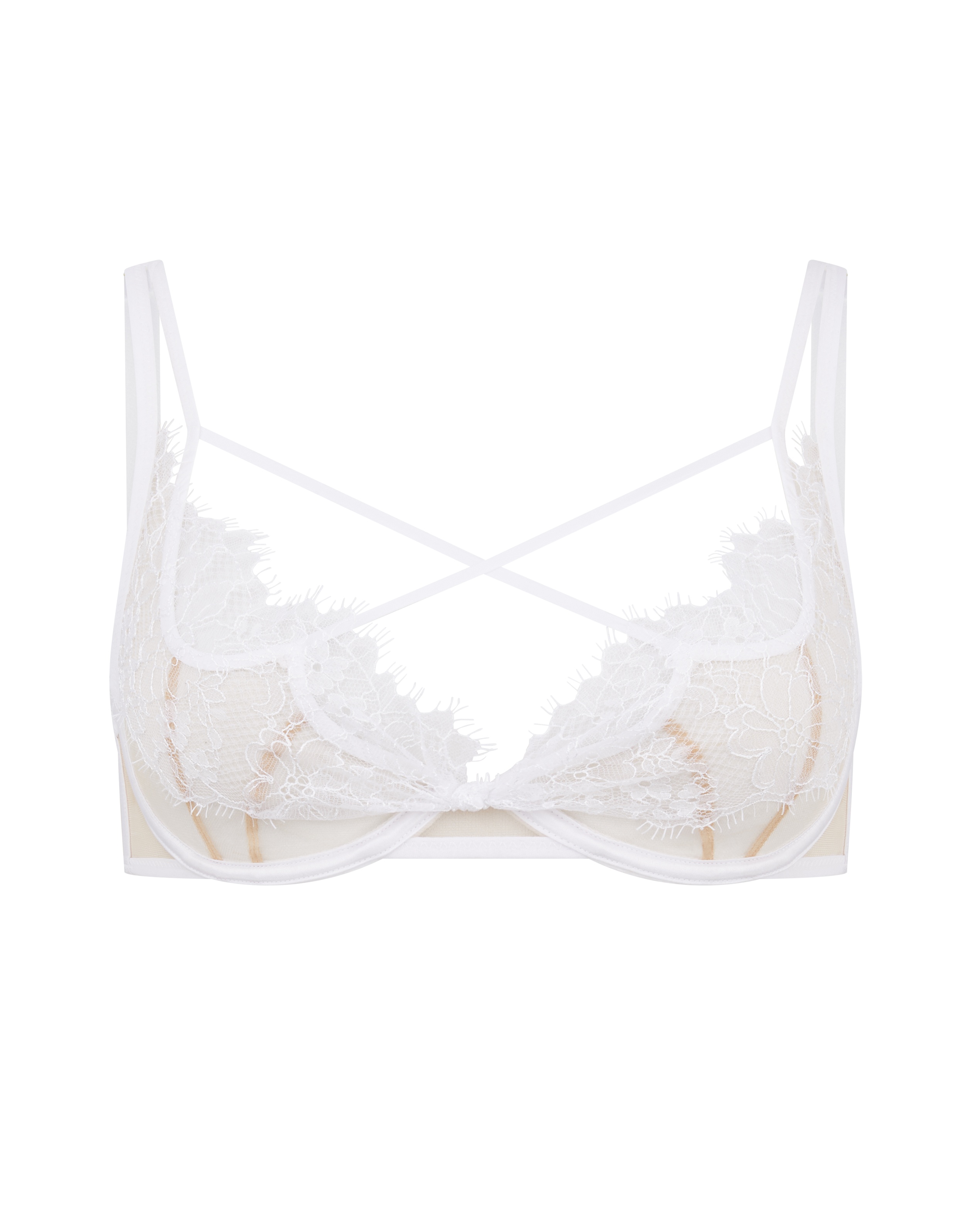 Чувственный бюстгальтер Palma выполнен из тонкого полупрозрачного тюля. Мягкие чашечки покрывает текстурное кружево с растительным мотивом. Передняя панель составлена из тонких лент, перевитых на манер шнуровки. Эта деталь привносит в романтичную модель ноту раскованной женственности. Золотистой фурнитурой регулируются цельнокроеные бретели и застежка на спине. Для завершения свадебного будуара подберите трусики из этой коллекции.