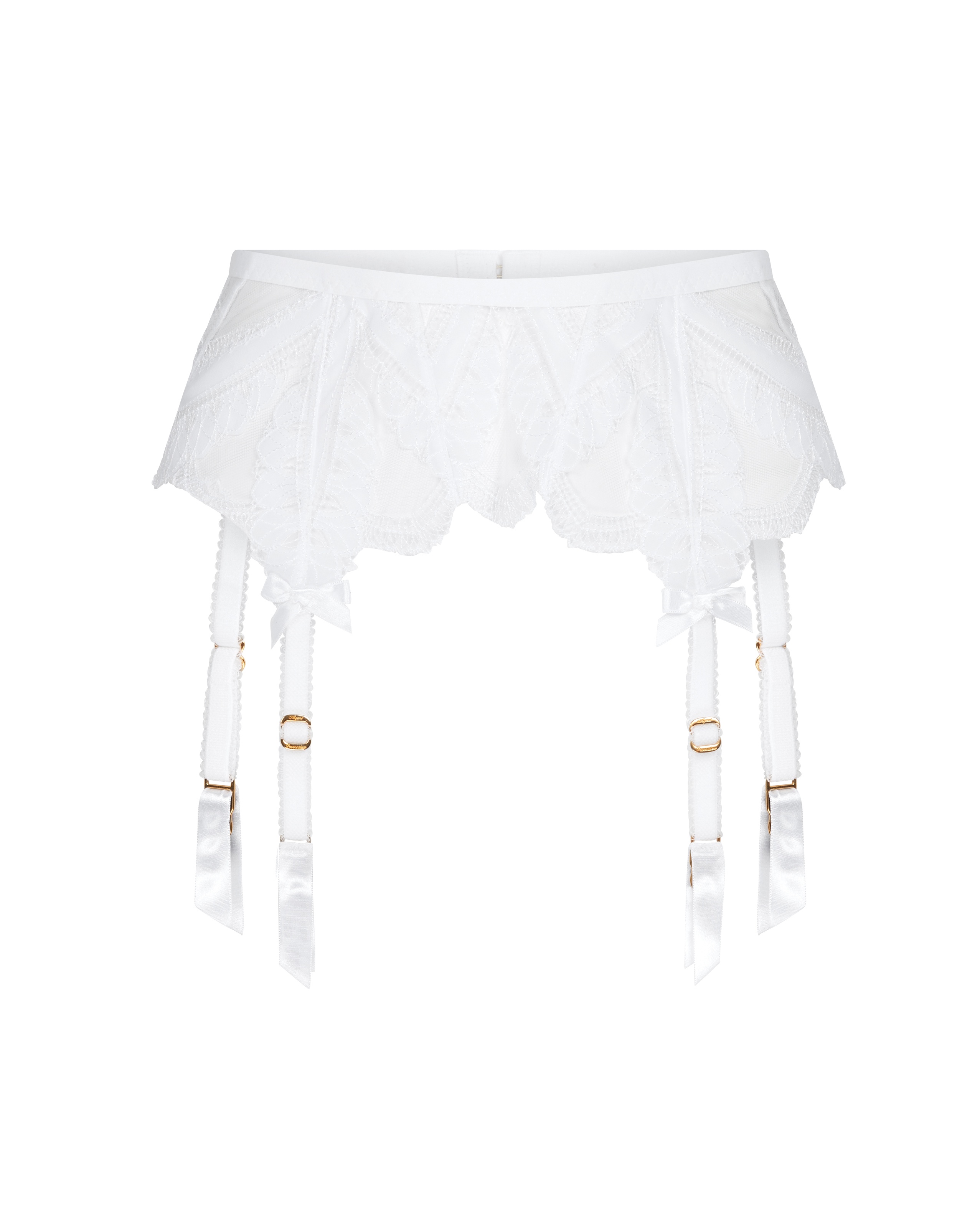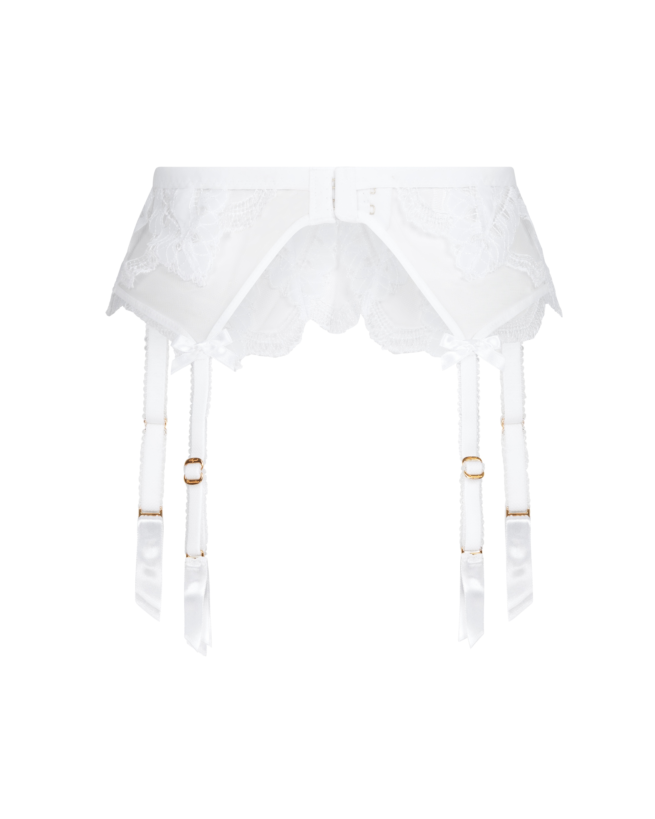 Пояс для чулок Alysia белого цвета украшен ажурной лазерной вышивкой. Фурнитура с покрытием из настоящего золота подчеркивает роскошь деталей. Дополните этот аксессуар комплектом Alysia, чтобы раскрыть его игривое очарование.