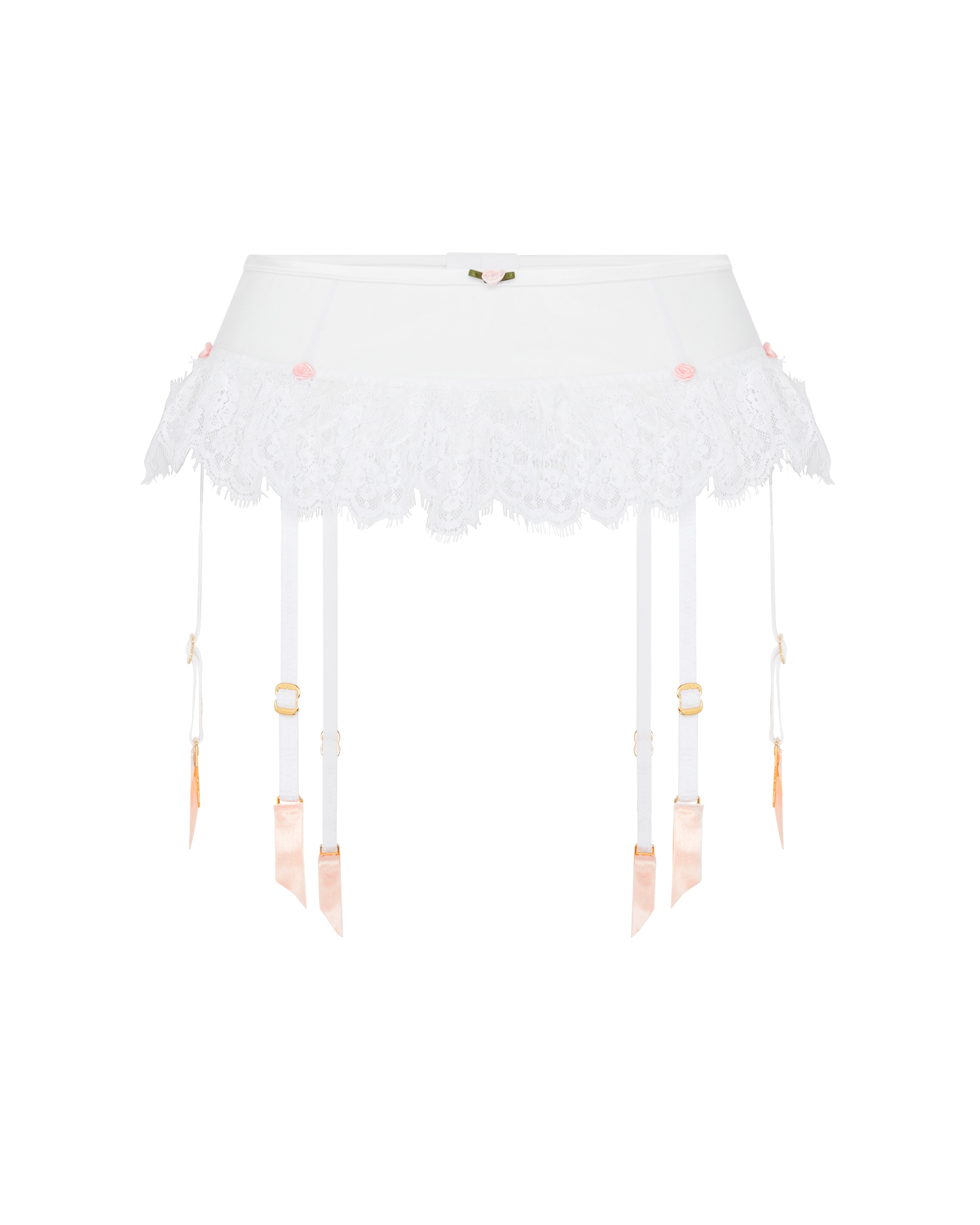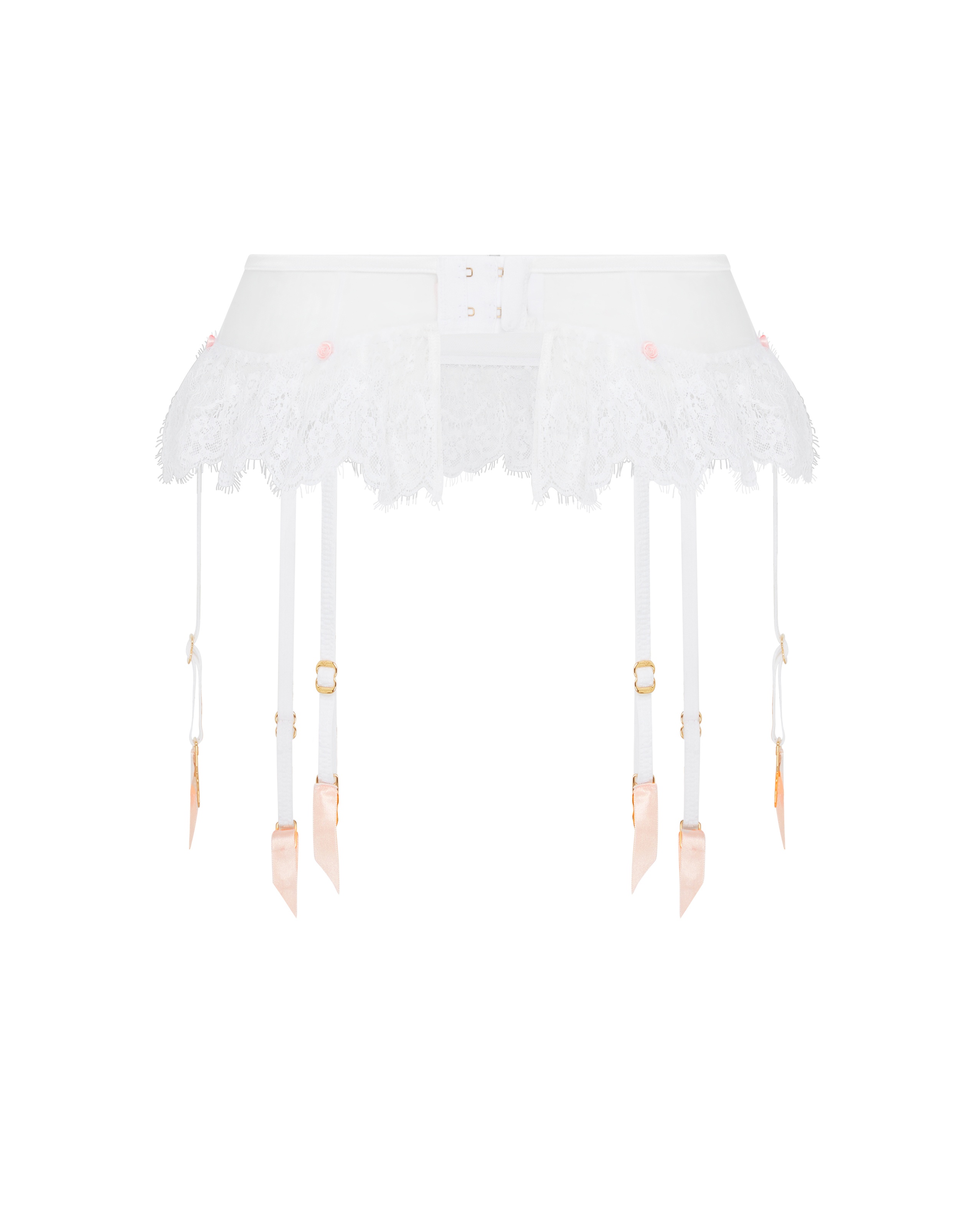 Белый пояс Clarissa: дерзкий силуэт балетной пачки из кружева с монограммой. Трио соблазна: французское кружево, итальянский тюль и шелк. Аксессуар, достойный быть выставленным напоказ. Коллекция Clarissa ждет, чтобы завладеть вашими мыслями.