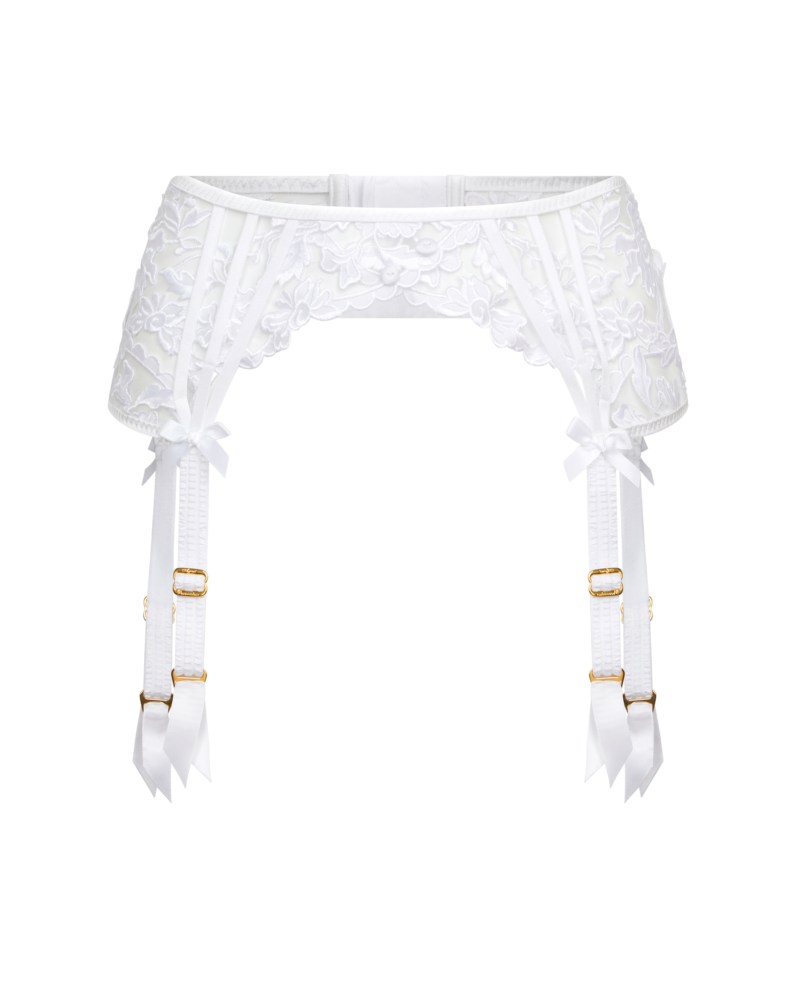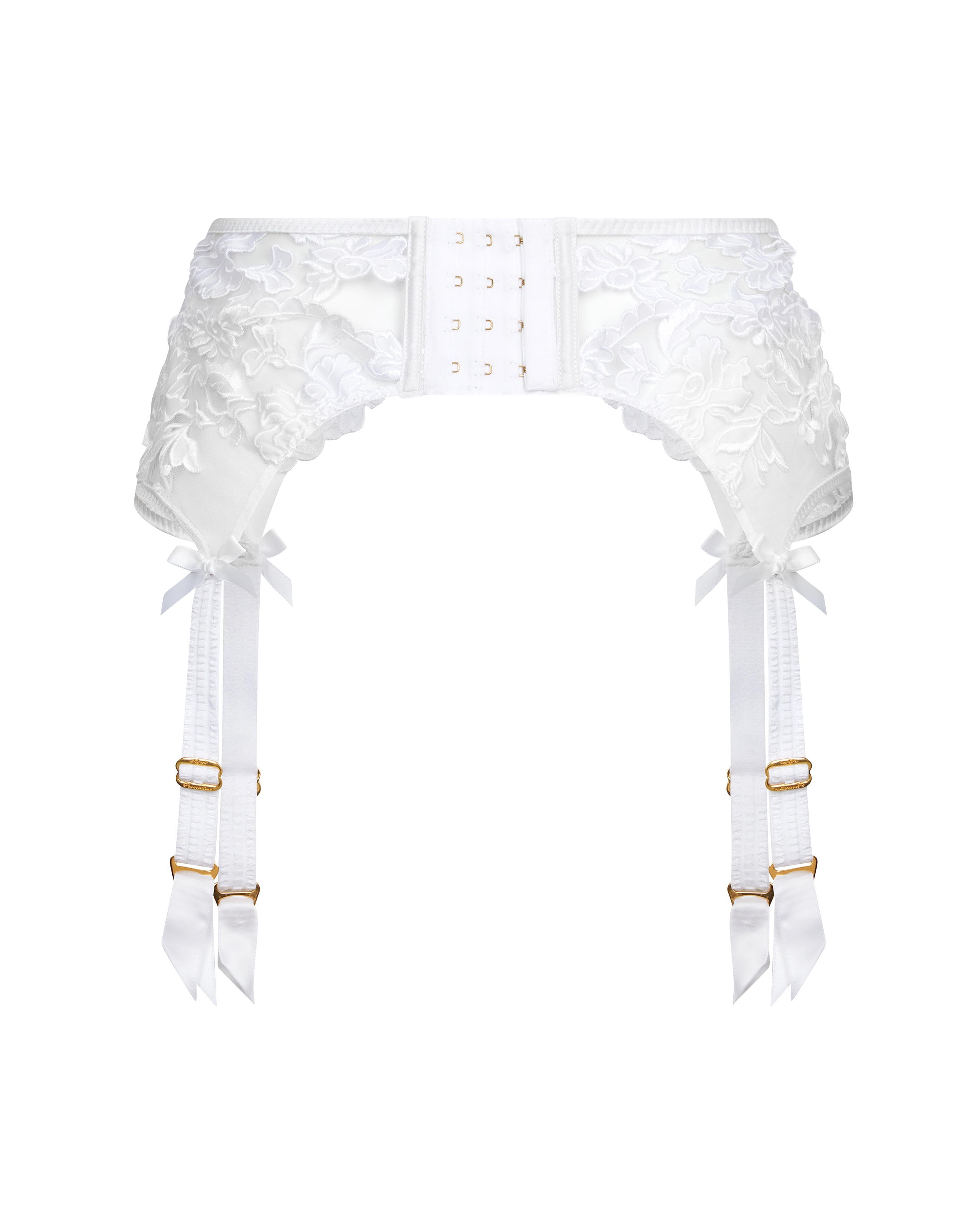 Пояс для чулок Darlia белого цвета сшит из прозрачного тюля с сатиновой аппликацией. Шелковая окантовка швов и позолоченная фурнитура создают изысканный акцент. Объедините с бюстгальтером и трусами Darlia для завершенного образа.