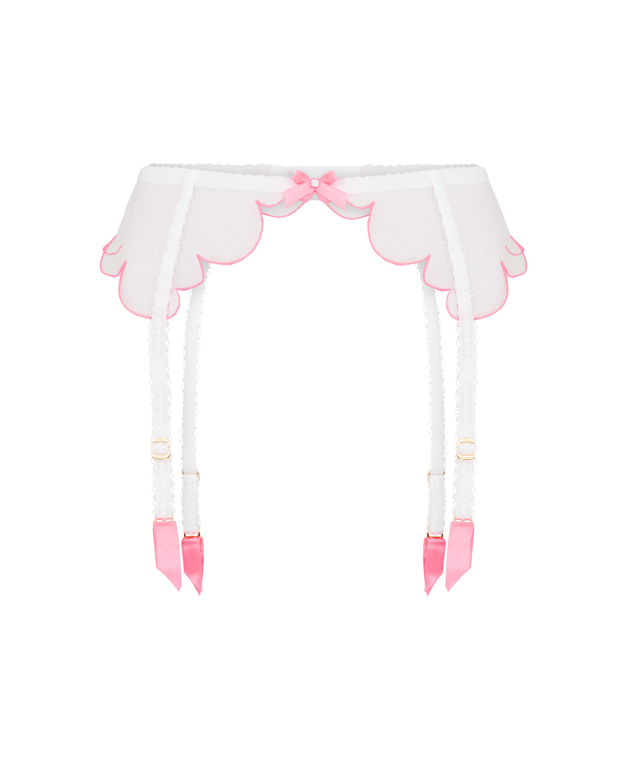 Белый пояс для чулок Lorna сделан из тонкого тюля и оснащен атласными лямками с возможностью регулировки. Золоченая фурнитура и застежки, розовая швейцарская вышивка на фестончатых краях и атласный бант с розой на талии завершают вид. Носите с элементами из серии Lorna для создания элегантного образа.