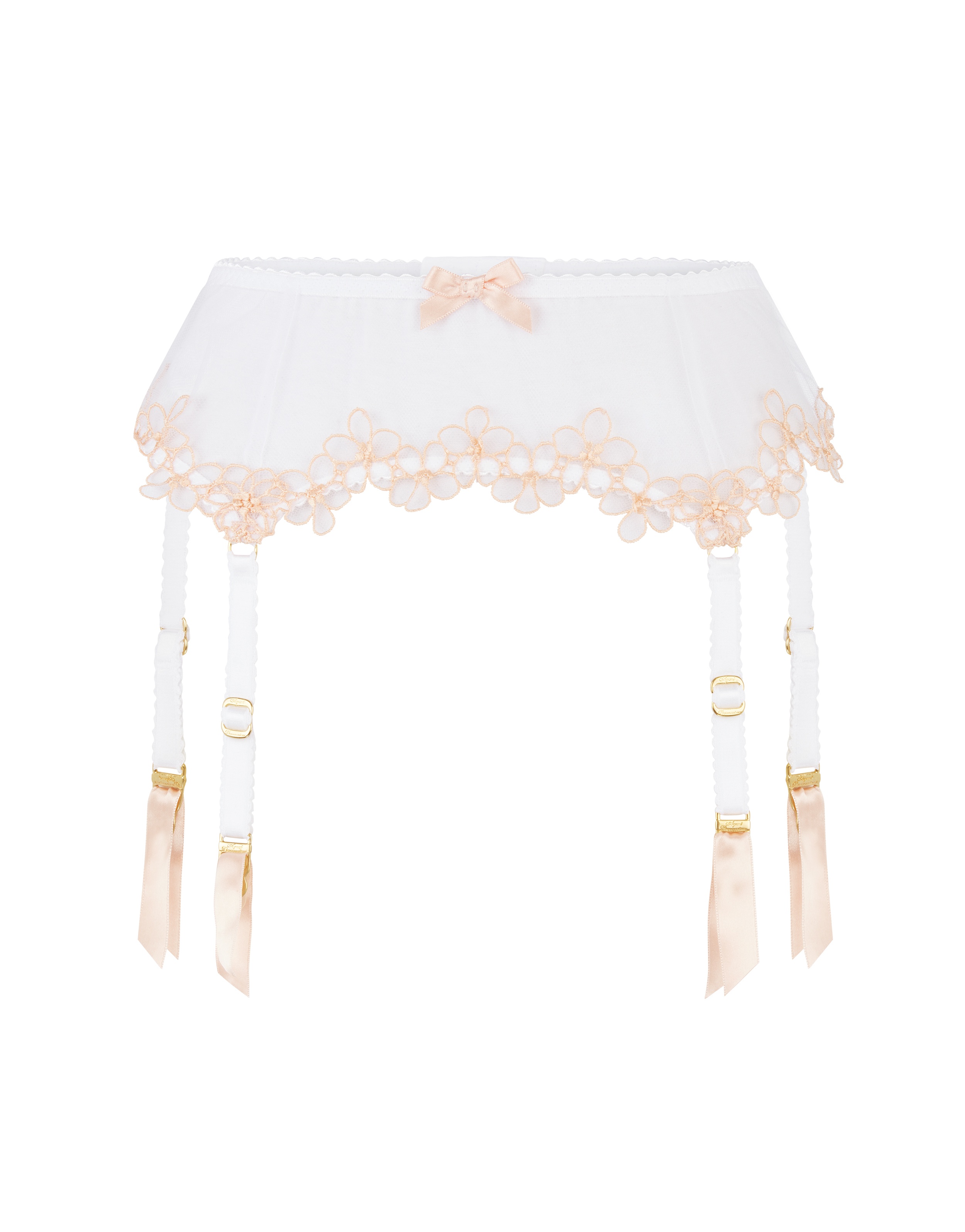 Пояс Maybelle дополнит нежный и романтичный образ для особенного случая. Пояс выполнен из тонкого итальянского тюля цвета слоновой кости и украшен искусно вышитыми цветами по краям. Регулируемые ремешки дополнены золотистой фурнитурой, застежка на крючки сзади.