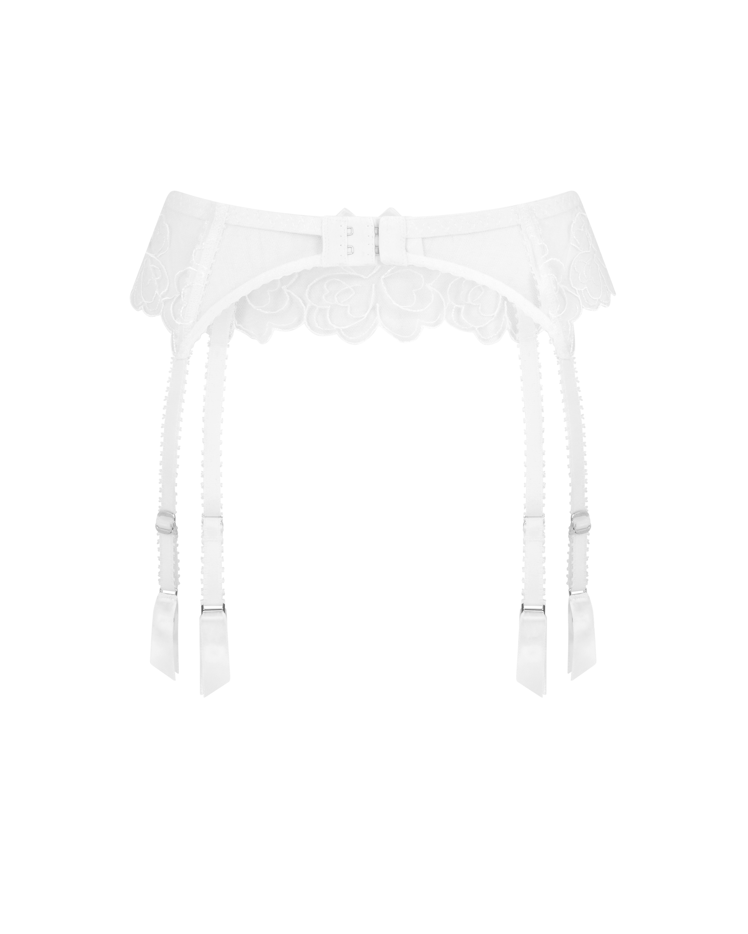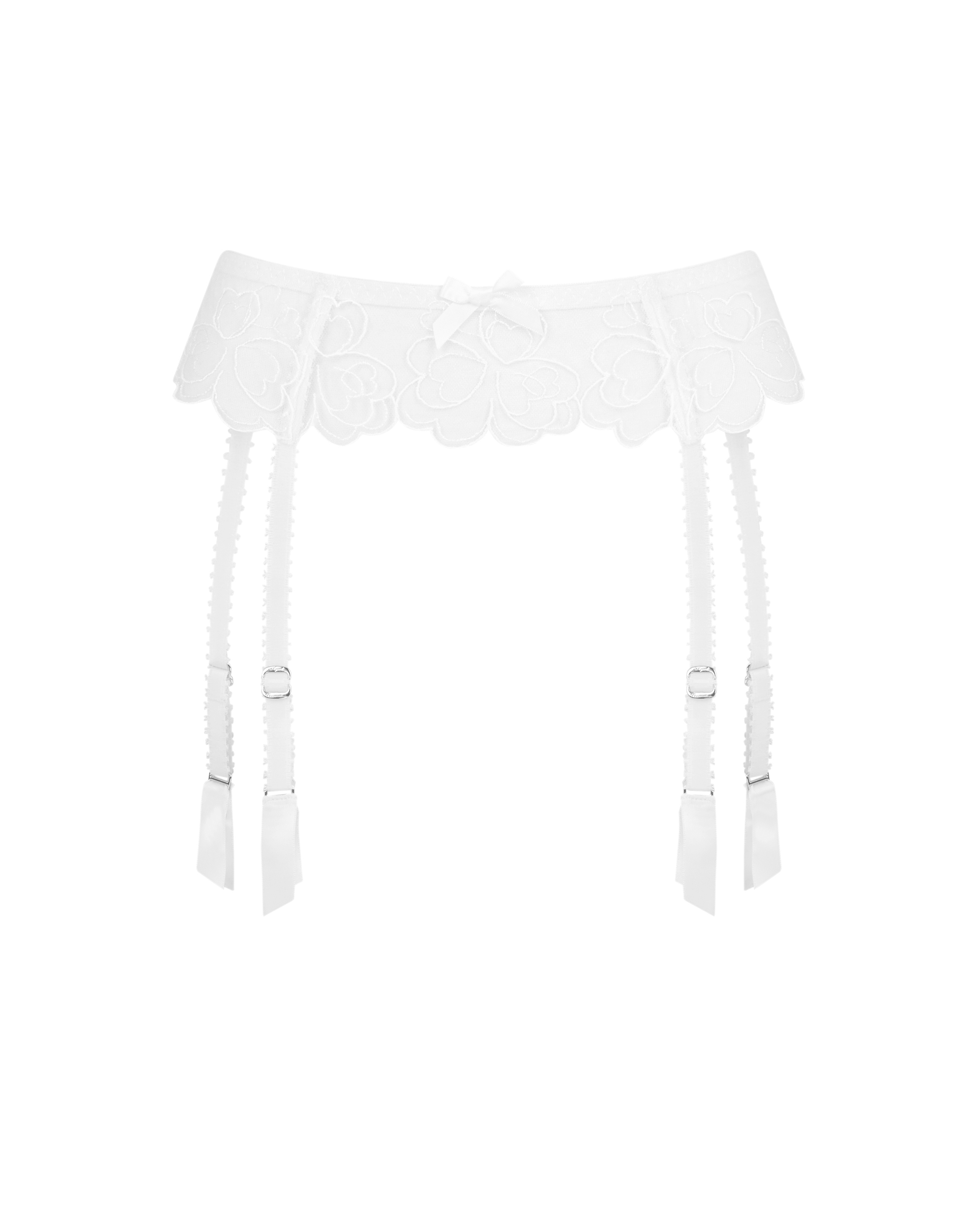Пояс для чулок Maysie белого цвета из прозрачного тюля с вышитыми сердечками. Позолоченная фурнитура, включая зажимы. Завершающий штрих очаровательного комплекта Maysie.