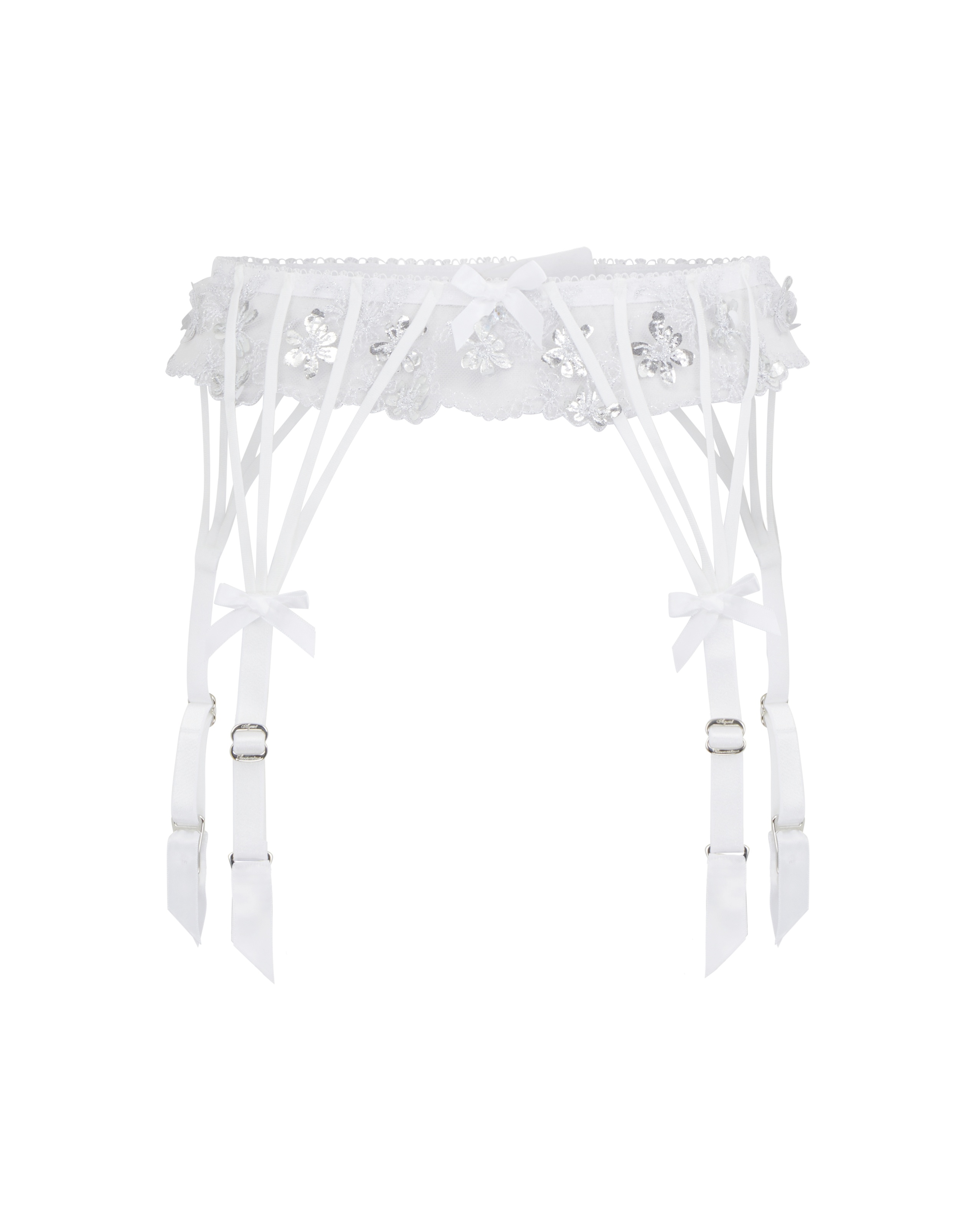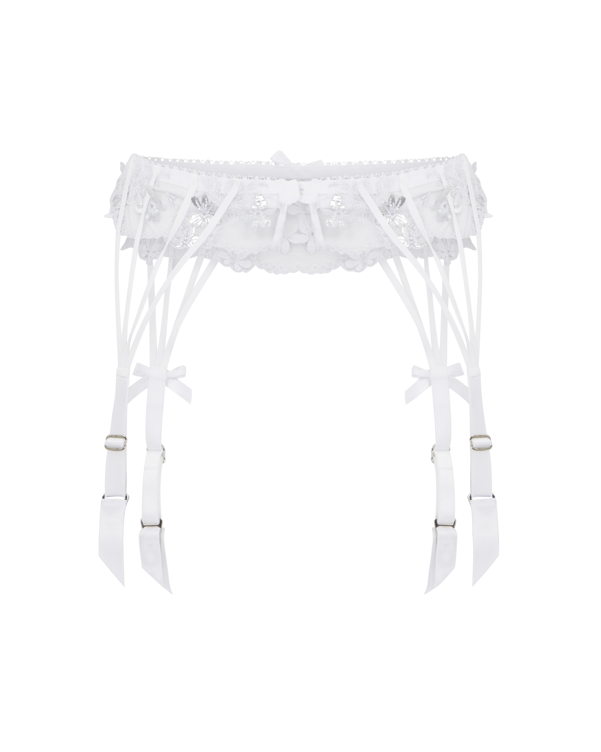 Изготовленный с применением роскошной швейцарской вышивки, белый прозрачный пояс для чулок Skylee является воплощением элегантности. Модель украшена вырезанными лазером 3D цветами с фольгированным покрытием. Детали из шелковых лент придают особый шарм, а декоративные элементы из кристаллов добавляют волшебства. Носите с остальными элементами коллекции Skylee для создания чарующего образа.