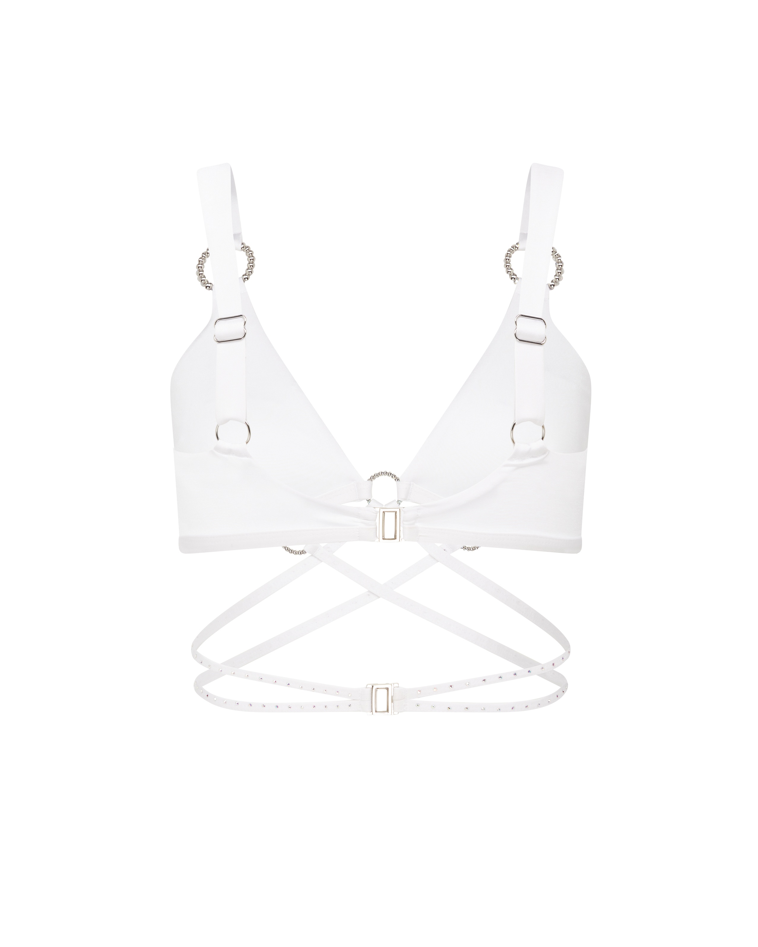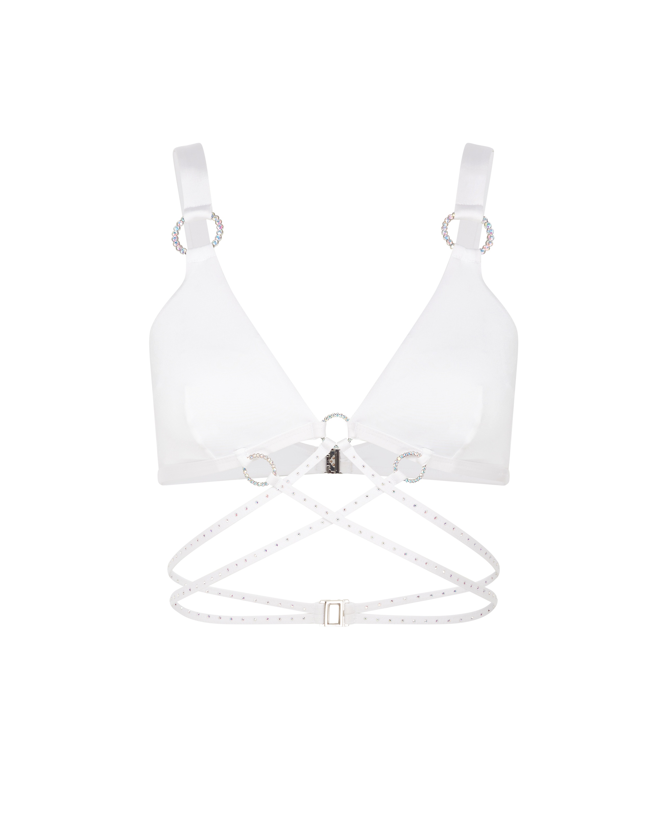 Топ-бикини Tenesee белого цвета выполнен из итальянской купальной ткани. Треугольные чашки с полной подкладкой и боковыми крыльями для дополнительной поддержки. Серебристые кольца с кристаллами северного сияния и мягкие эластичные ремешки, украшенные кристаллами. Сочетайте с соответствующими плавками Tenesee для завершения образа.