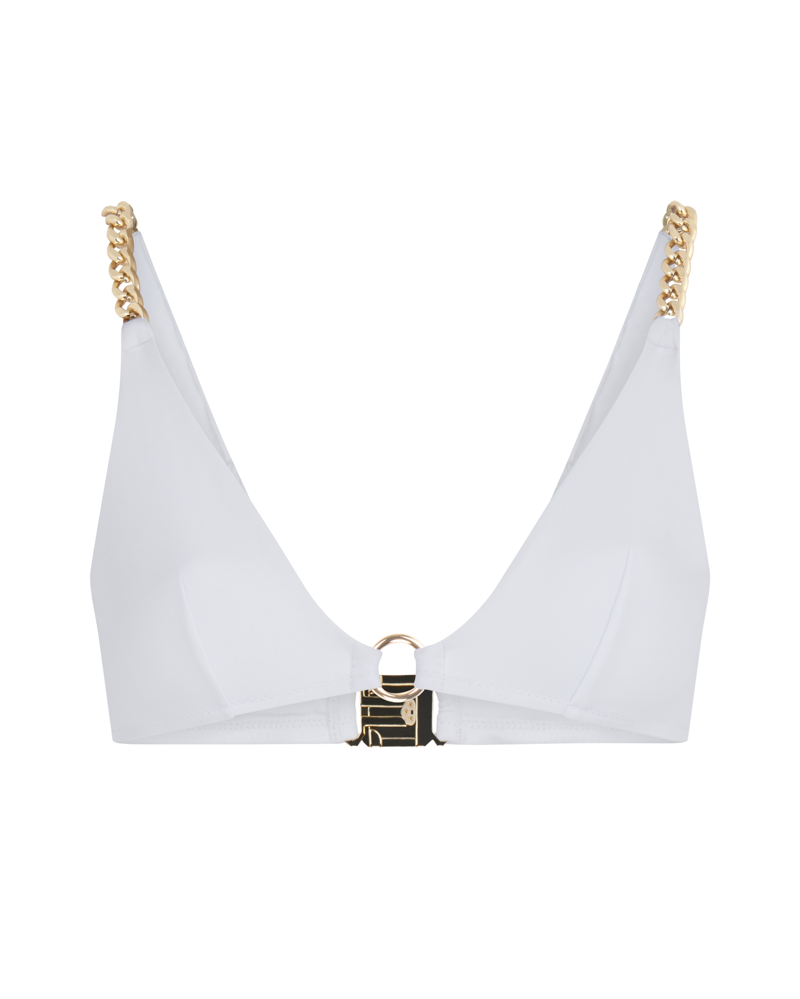 В белом топе купальника Trixy сочетаются утонченность и современный стиль. Модель с мягкими треугольными чашечками выполнена из роскошной матовой итальянской ткани для купания. Акцент в виде массивной цепи добавляет изделию оригинальности. Застежка с фирменной символикой AP на спине обеспечивает надежное закрытие. Дополните образ плавками из той же серии для соблазнительного пляжного образа.