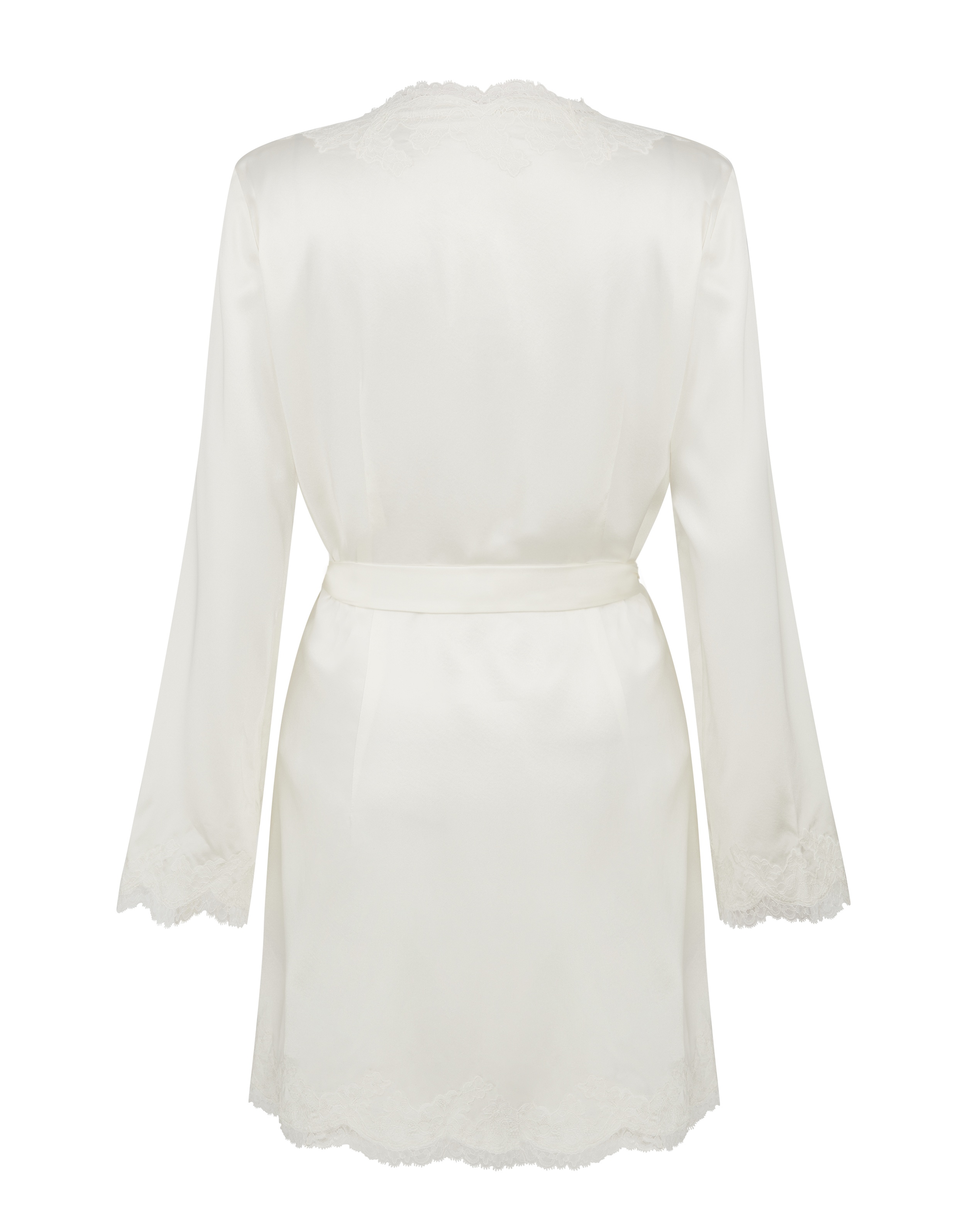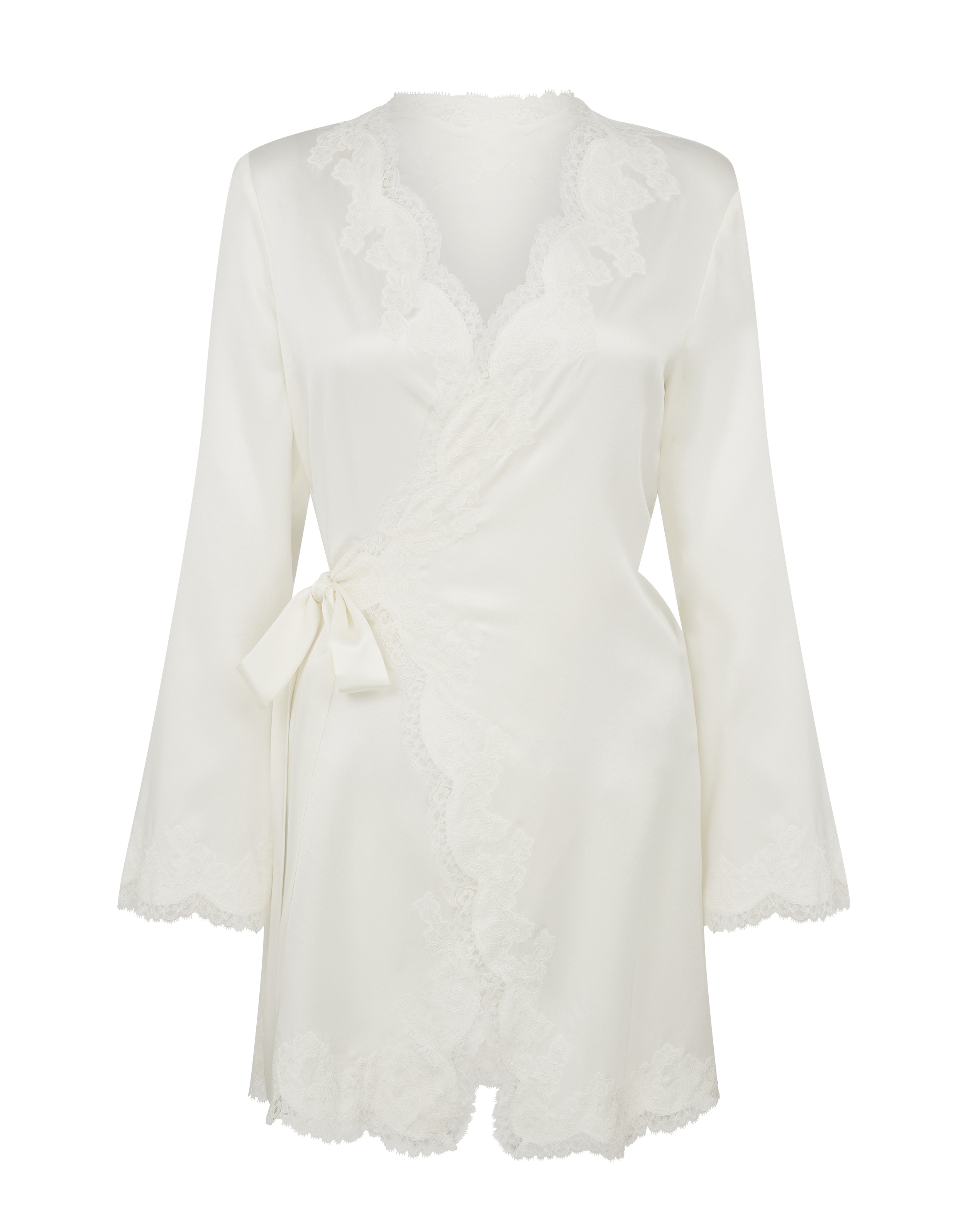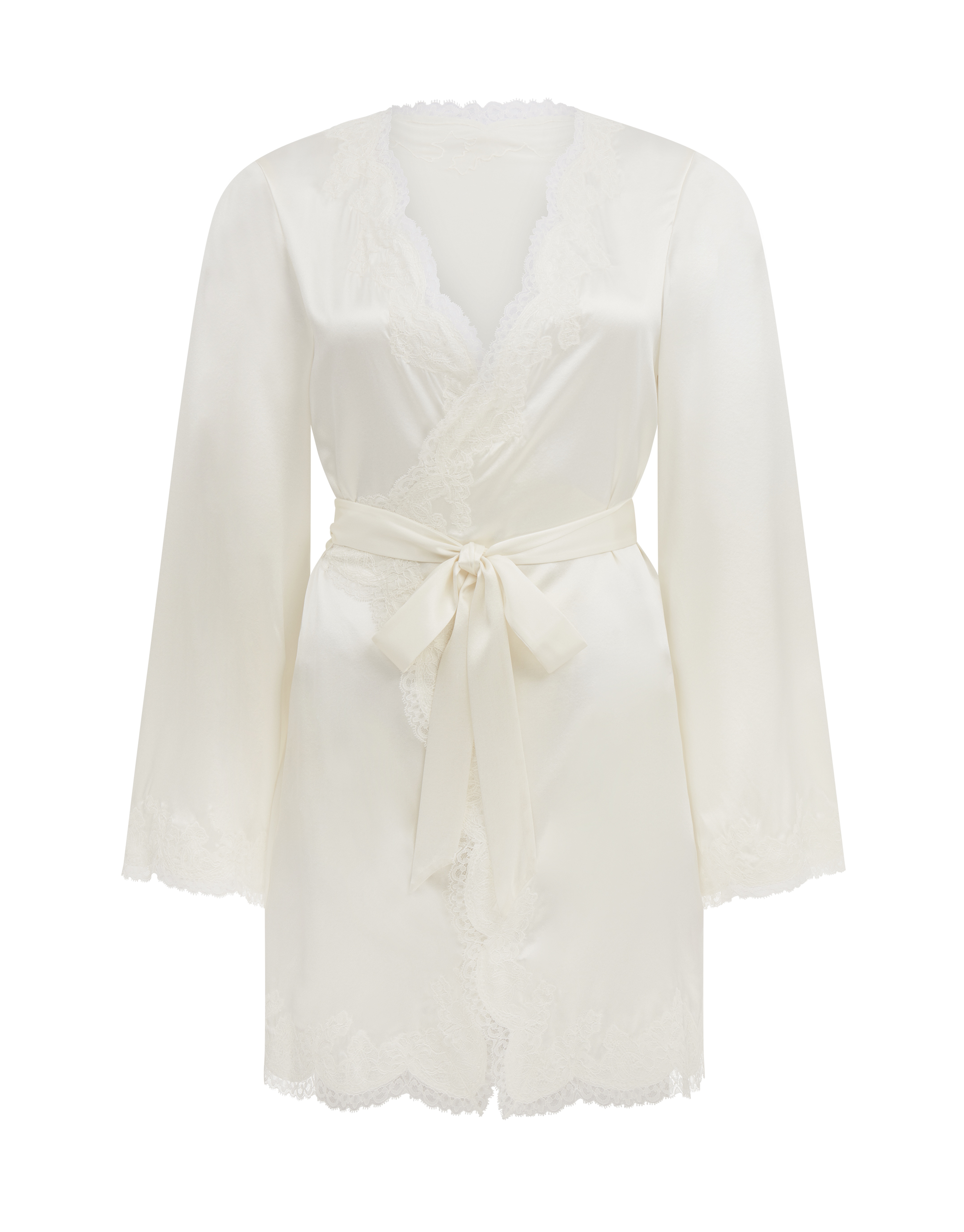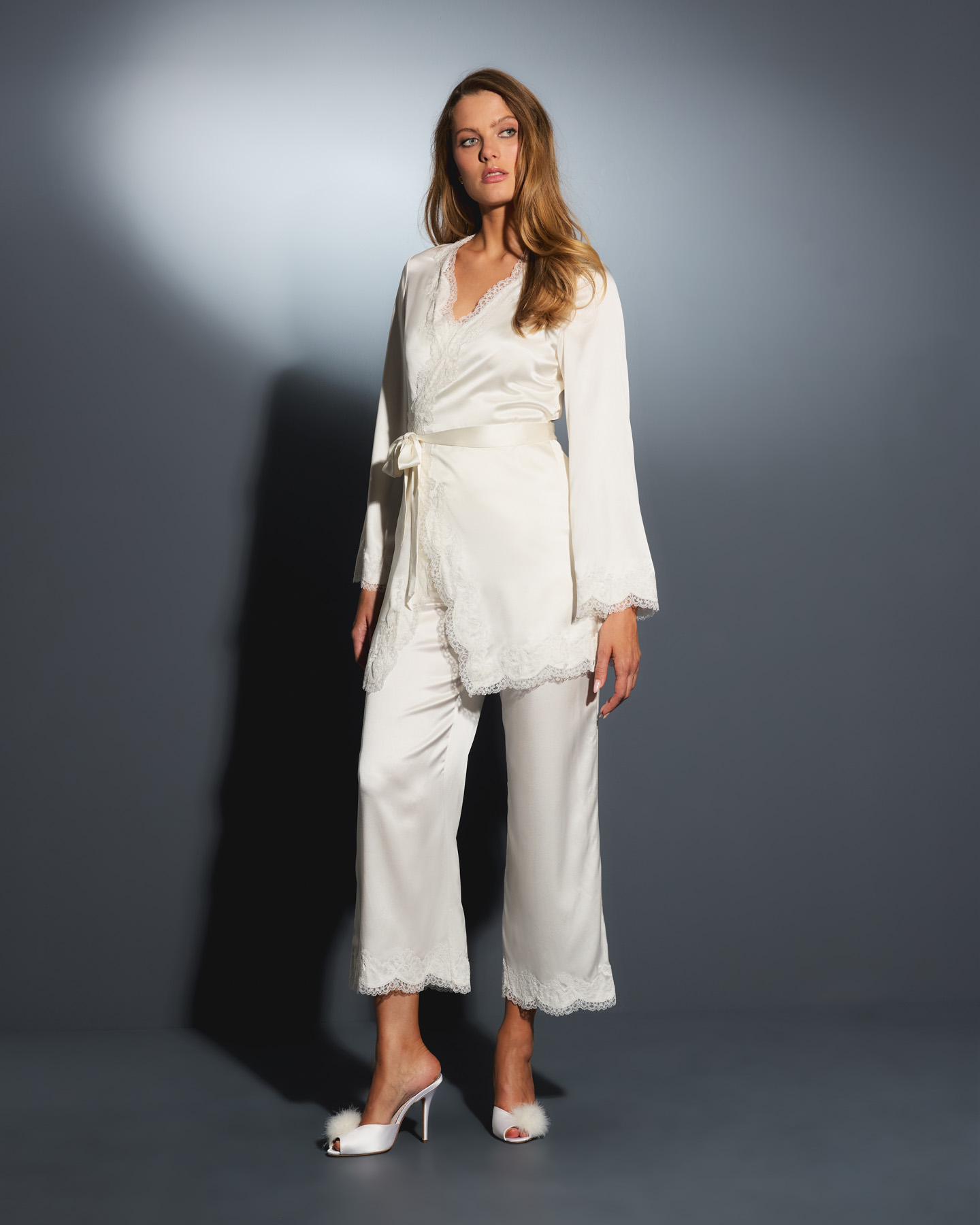 Amelea - роскошная коллекция одежды для дома в винтажном стиле, выполненная в классических цветах Agent Provocateur. Пижамный жакет цвета слоновой кости в стиле 50-х выполнен из шелкового стрейч сатина, который дарит удивительные тактильные ощущения. Модель украшена аппликациями из белого французского кружева. Удлиненный жакет можно носить с брюками или вместо халата. Жакет дополнен затягивающимся шелковым поясом-кушаком. Сочетайте с брюками и топом Amelea.