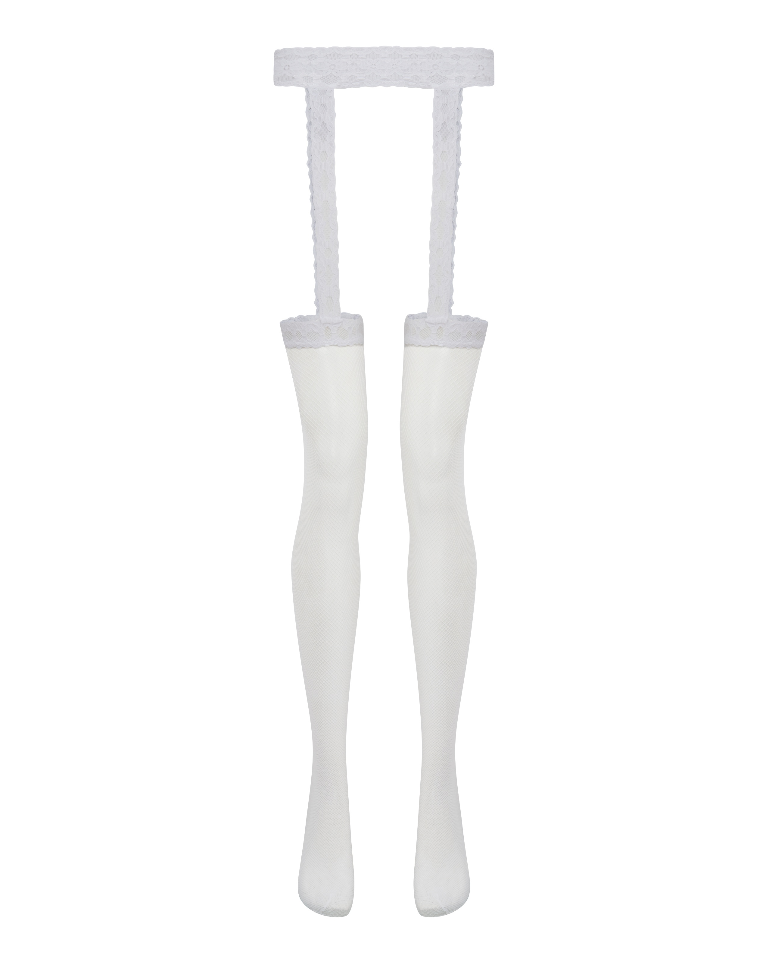 Созданные из соблазнительного белого сетчатого материала, колготки Cyra имеют имитацию подтяжек из эластичного кружева, украшенных нежными атласными бантами. Чтобы образ привлекал внимание, сочетайте с вашим любимым белым комплектом нижнего белья Agent Provocateur, создавая целостный и эффектный ансамбль.