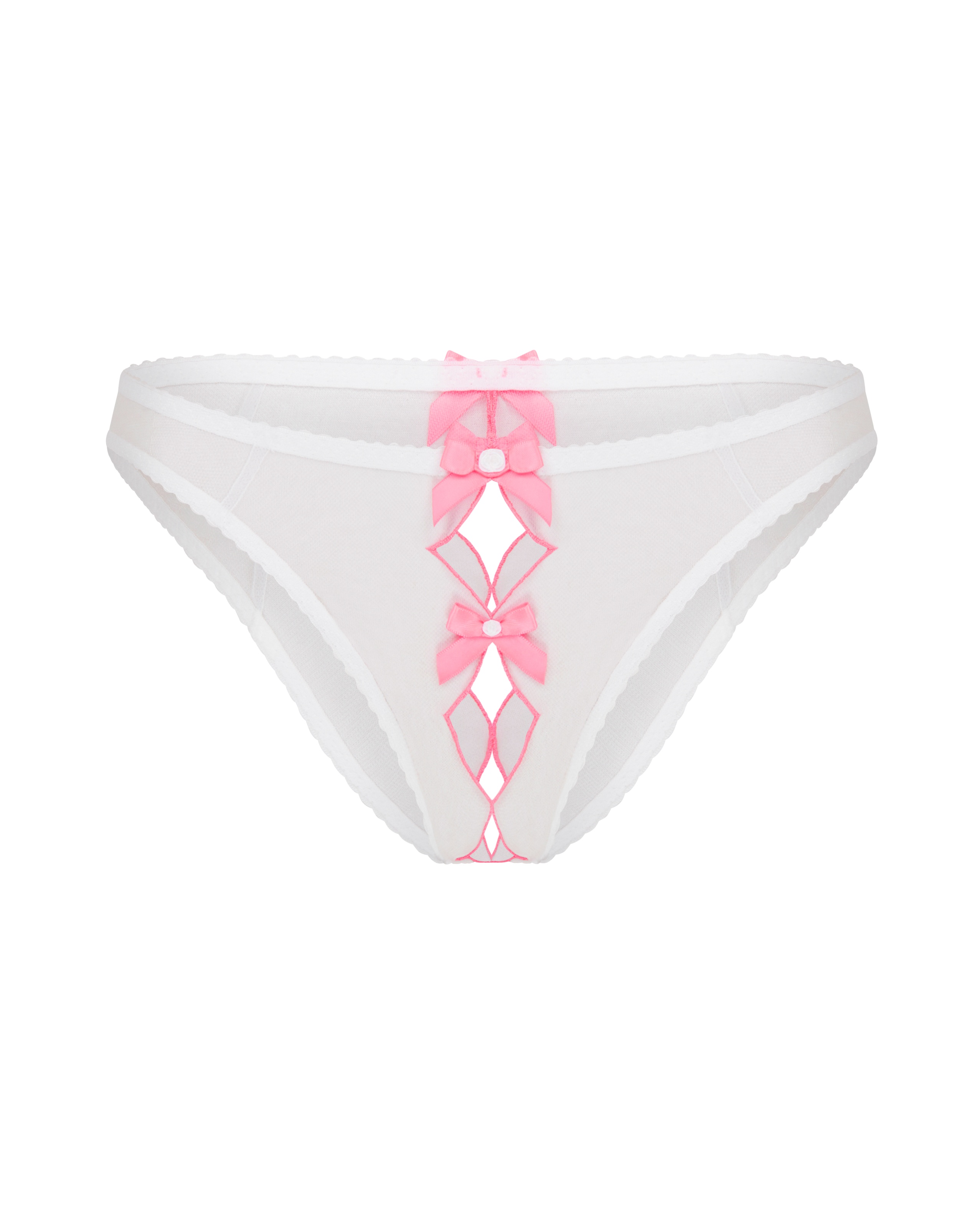 Французские трусы Lorna выполнены из тонкого белого тюля и дополнены открытой ластовицей, добавляющей пикантности. Швейцарская розовая вышивка на фесточатых краях и французские швы подчеркивают роскошный стиль. Носите их с другими элементами серии Lorna для создания соблазнительного ансамбля.
