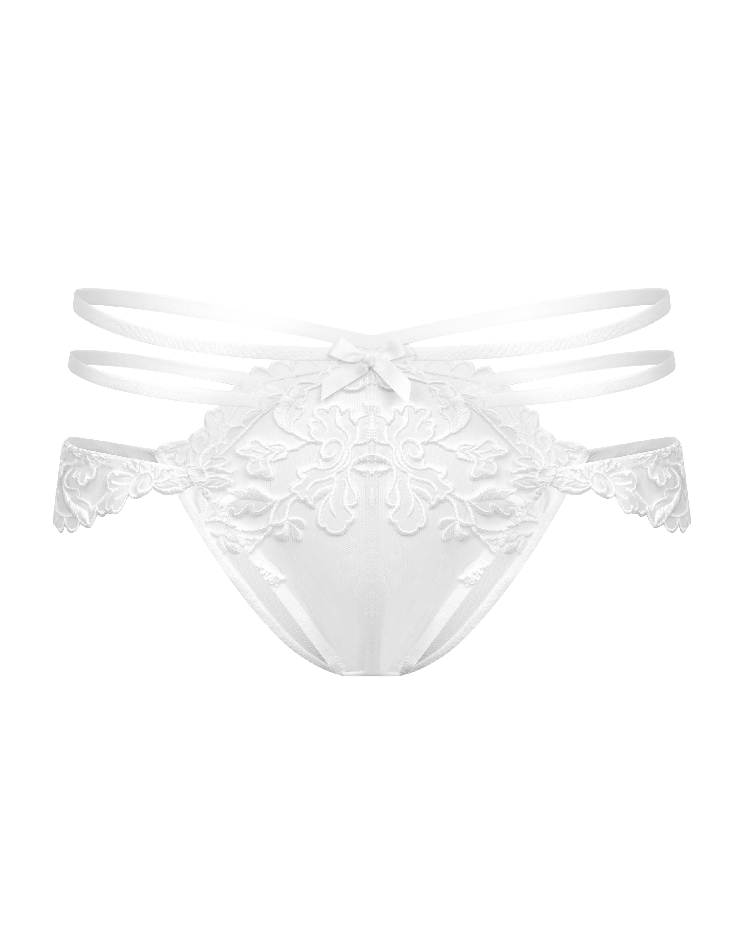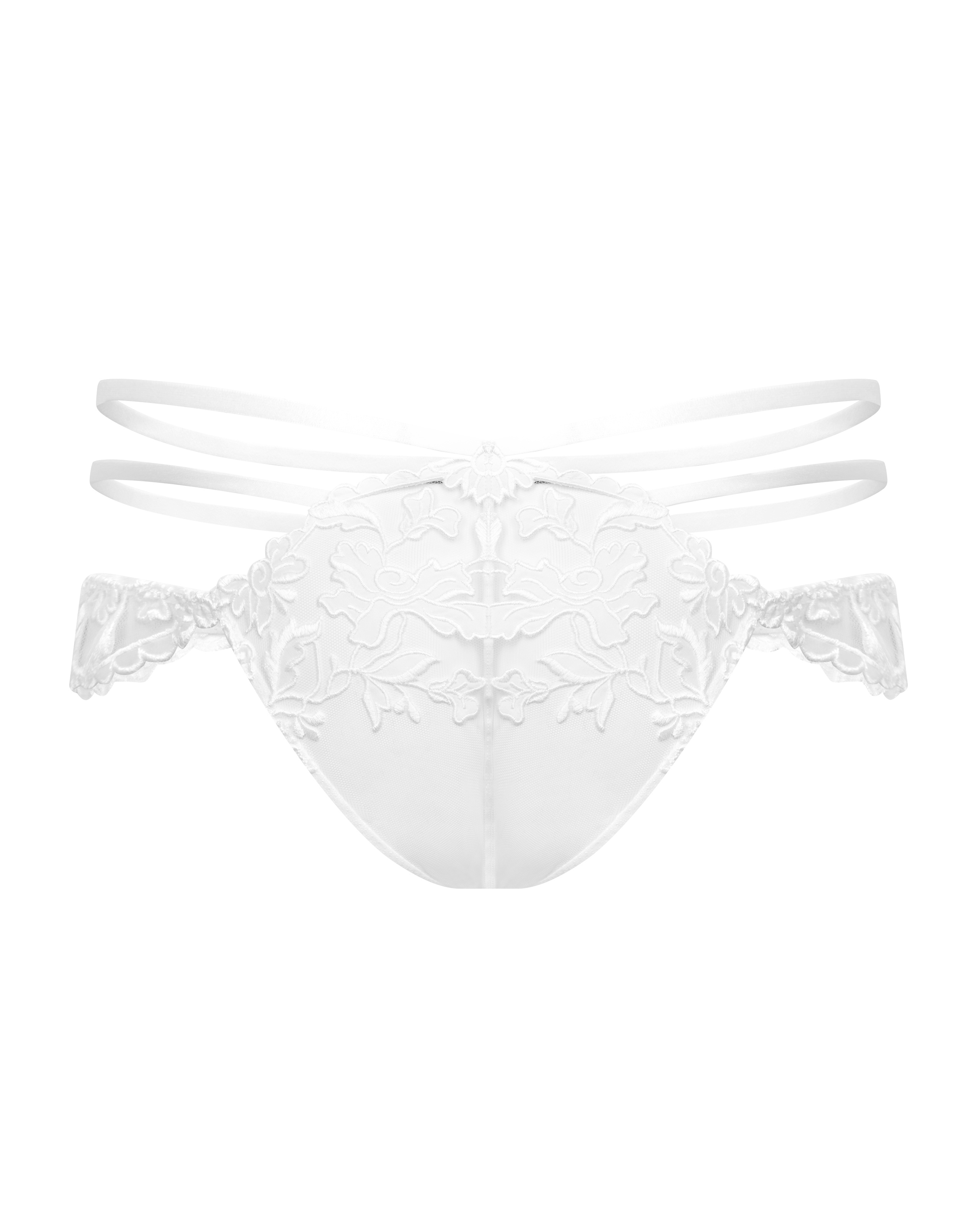 Трусы-брифы Darlia белоснежные: прозрачный тюль с изящной сатиновой аппликацией. Шелковая окантовка швов и шелковая ластовица обеспечивают комфорт и мягкость. Создайте единый нежный образ с комплектом Darlia.