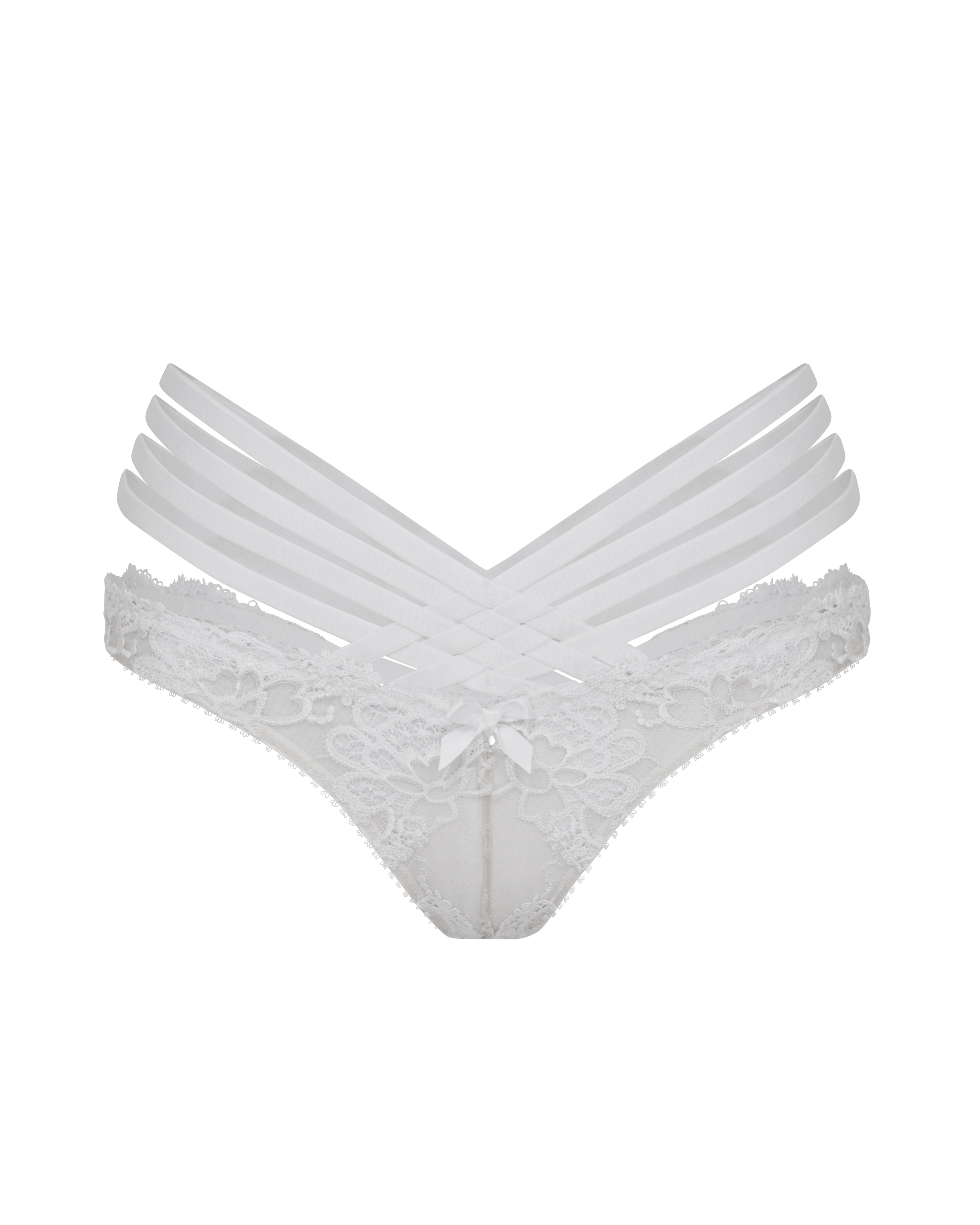 Классические трусы Dioni белого цвета украшены швейцарской лазерной вышивкой и ремешками, очерчивающими силуэт. Атласный бант и подвеска с кристаллом Preciosa® завершают дизайн. Эта модель раскрывает свой потенциал в обрамлении коллекции Dioni.