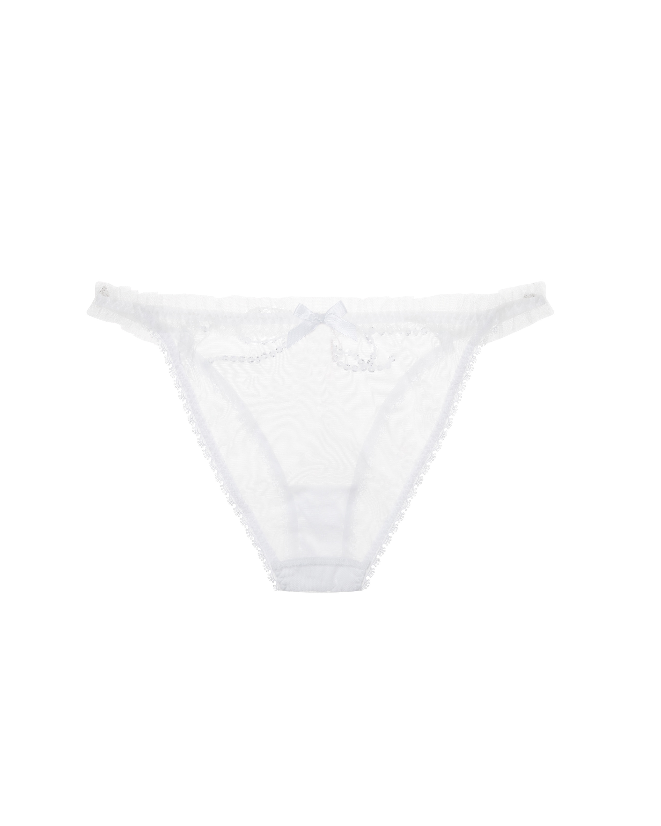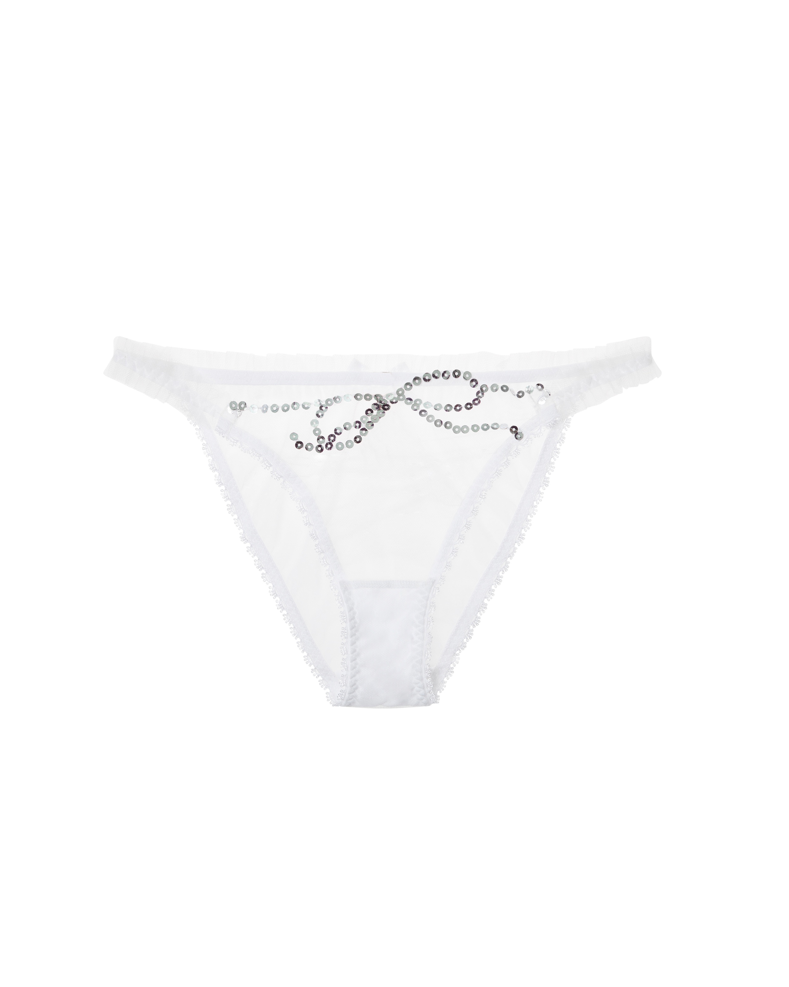Белые классические трусы Melle выполнены из прозрачного итальянского тюля с сияющими серебристыми пайетками. Рюши по бокам и на спинке, а также изящная кружевная отделка по краям придают особую нежность. Сочетайте с другими элементами коллекции Melle для создания романтичного образа.