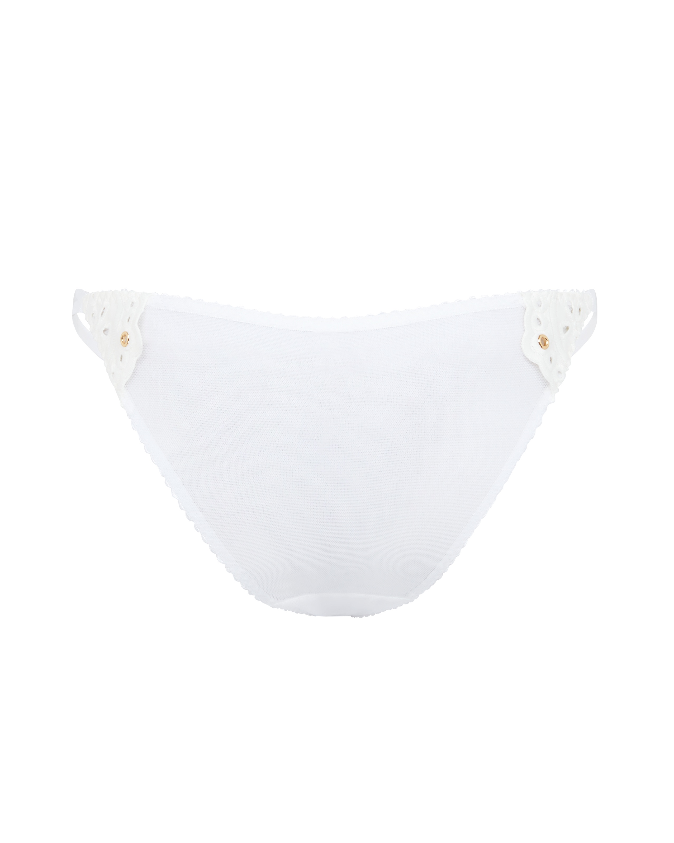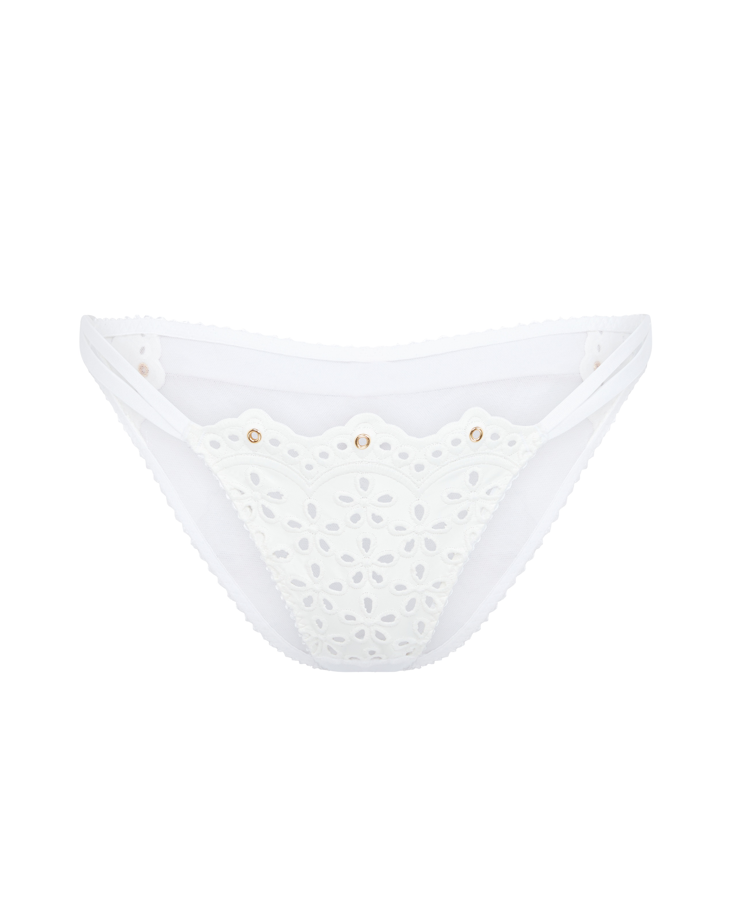 Классические трусы Nicoletti белого цвета украшены инновационной цветочной вышивкой броше на глянцевом ПВХ с изящными прорезями. Контрастные золотистые люверсы и двойные бретели по бокам сочетаются с прозрачной тюлевой спинкой. Дополните ансамбль коллекцией Nicoletti для смелого образа.