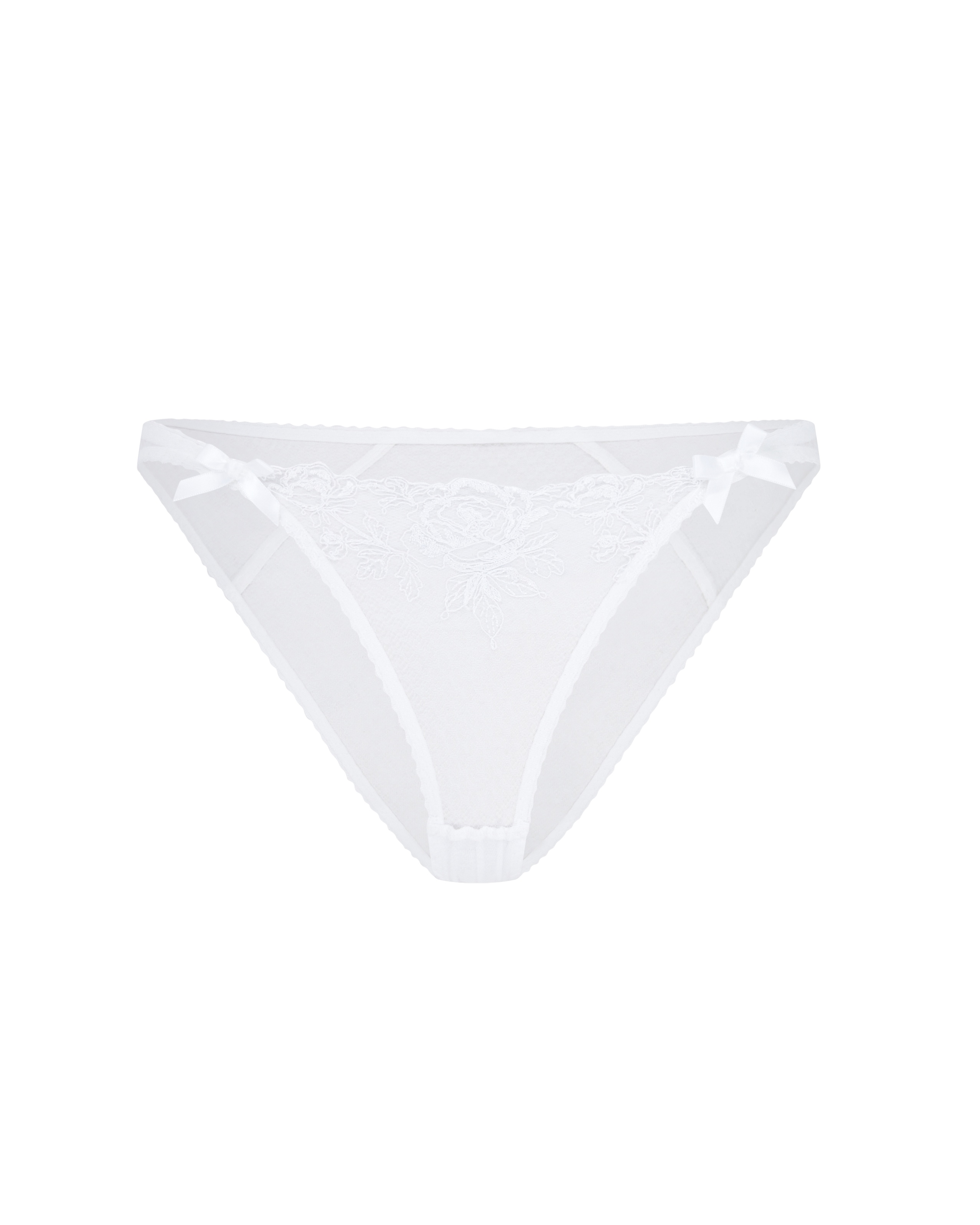В классических трусах Rosia цветочная вышивка с сетчатой основой сочетается с шелковыми окантовками и миниатюрными бантами. Завершите образ бюстгальтером и поясом этой коллекции.