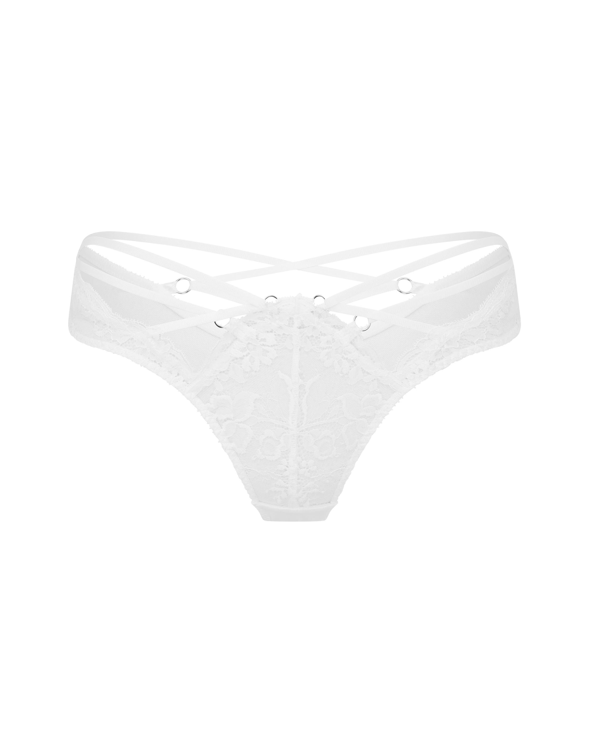 Главной идеей брифов Essie стало сочетание нежного кружева с цветочными узорами и мотива шнуровки. Модель в белом цвете, а значит станет прекрасным вариантом для свадебного образа в паре с бюстгальтером Essie.