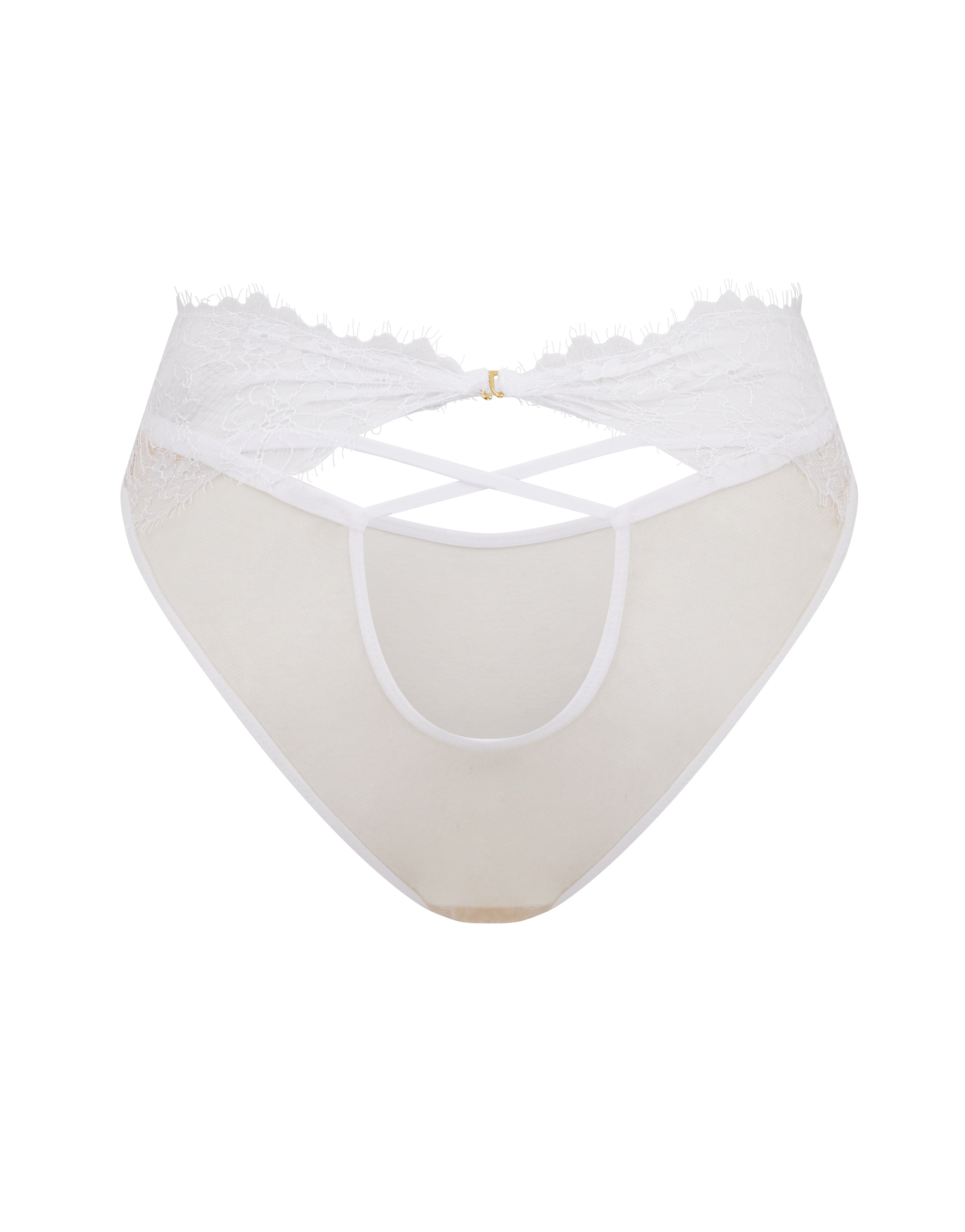 Трусики Palma — идеальный компаньон для бюстгальтера из этой коллекции для составления женственного свадебного будуара. Для создания модели мастера использовали тонкий белый тюль. Верхнюю панель выполнили из резного кружева с ресничным краем. Окантовка срезов сделана эластичными лентами, не сковывающими движений. Сзади расположен фирменный золотистый крючок, фиксирующий драпировку.