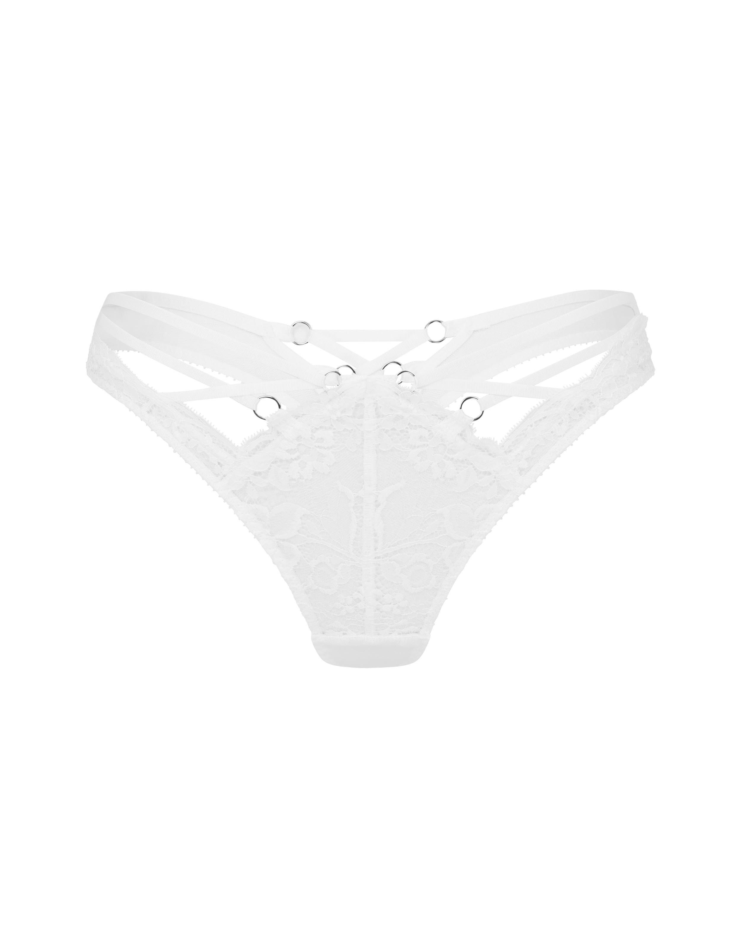Трусики стринг из серии Essie выполнены из тонкого белого кружева с витиеватыми цветочными мотивами. Ключевой деталью декора стала атласная шнуровка на серебристых кольцах спереди и сзади. Эта модель станет идеальным дополнением комплекта с бюстгальтером Essie.