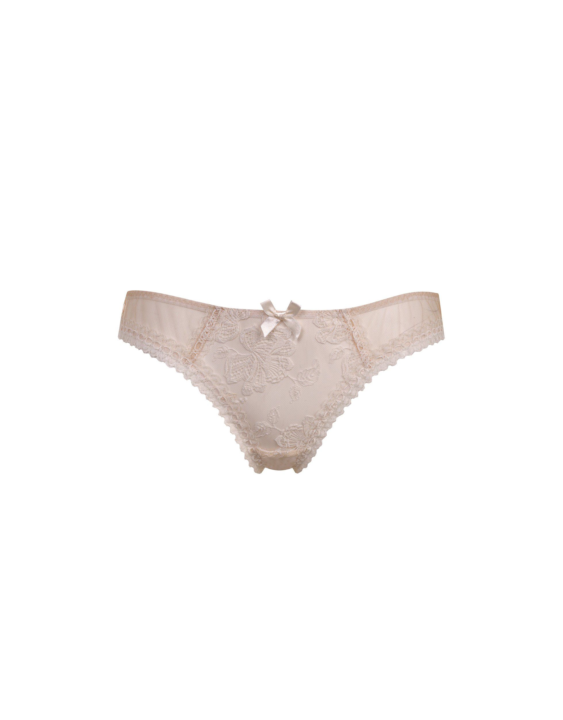 Трусики-стринг из серии Clarabelle, дизайн которой отражает стиль Викторианской эпохи в современном прочтении. Модель сшита из тонкой телесной сетки с фантазийными цветами белого цвета, выполненными в технике швейцарской вышивки. Атласный бант по центру и эластичные окантовки с фестонами по краям. Эта модель подойдет под свадебное платье в паре с другими предметами линейки.