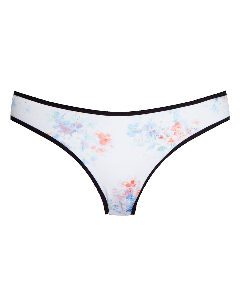 Продемонстрируйте свою романтичную натуру в Aimeline. Белые плавки бикини из неопрена украшены принтом с гортензиями нежного акварельного оттенка. Черная контрастная оторочка завершает образ. Сочетайте с коллекцией Aimeline.