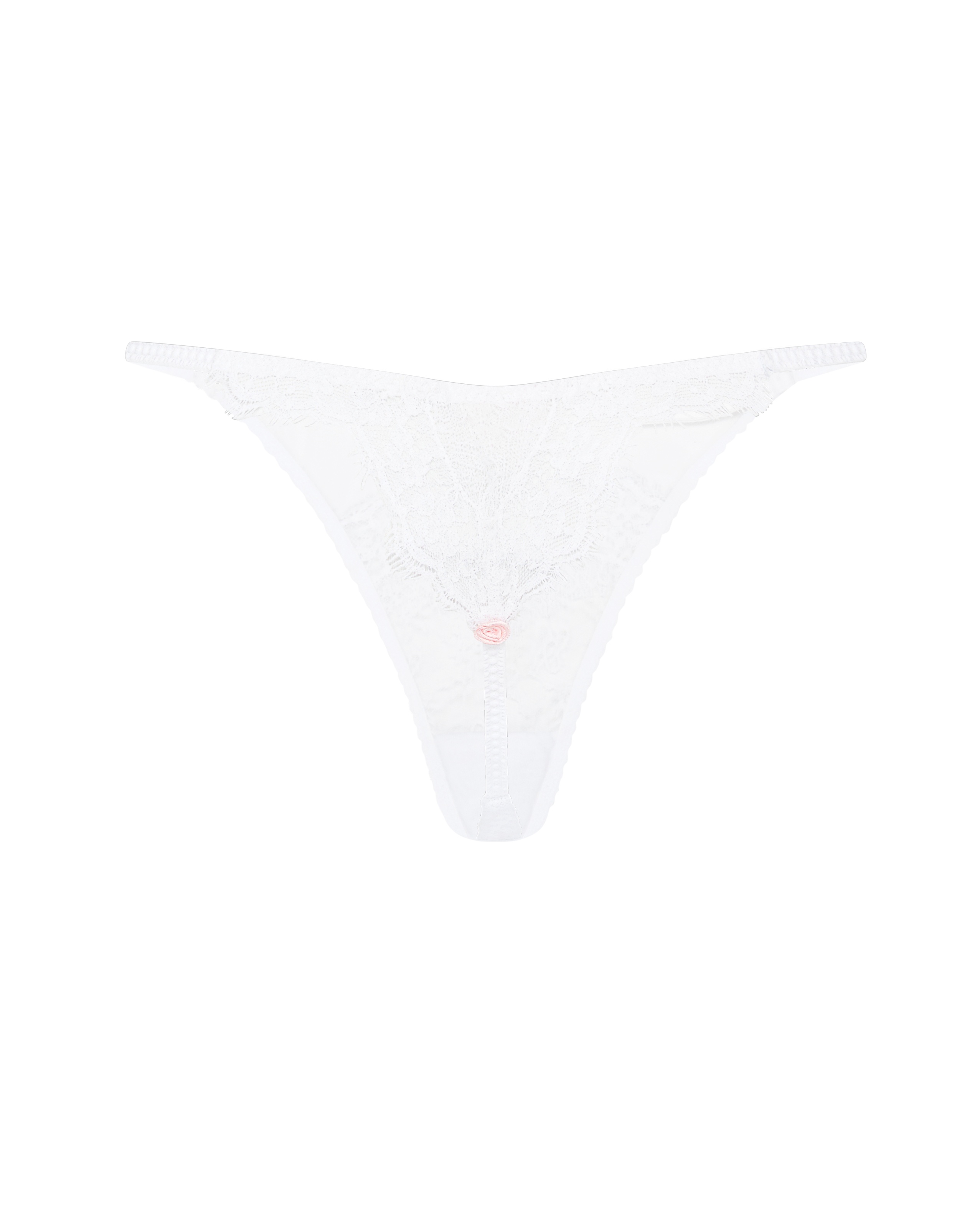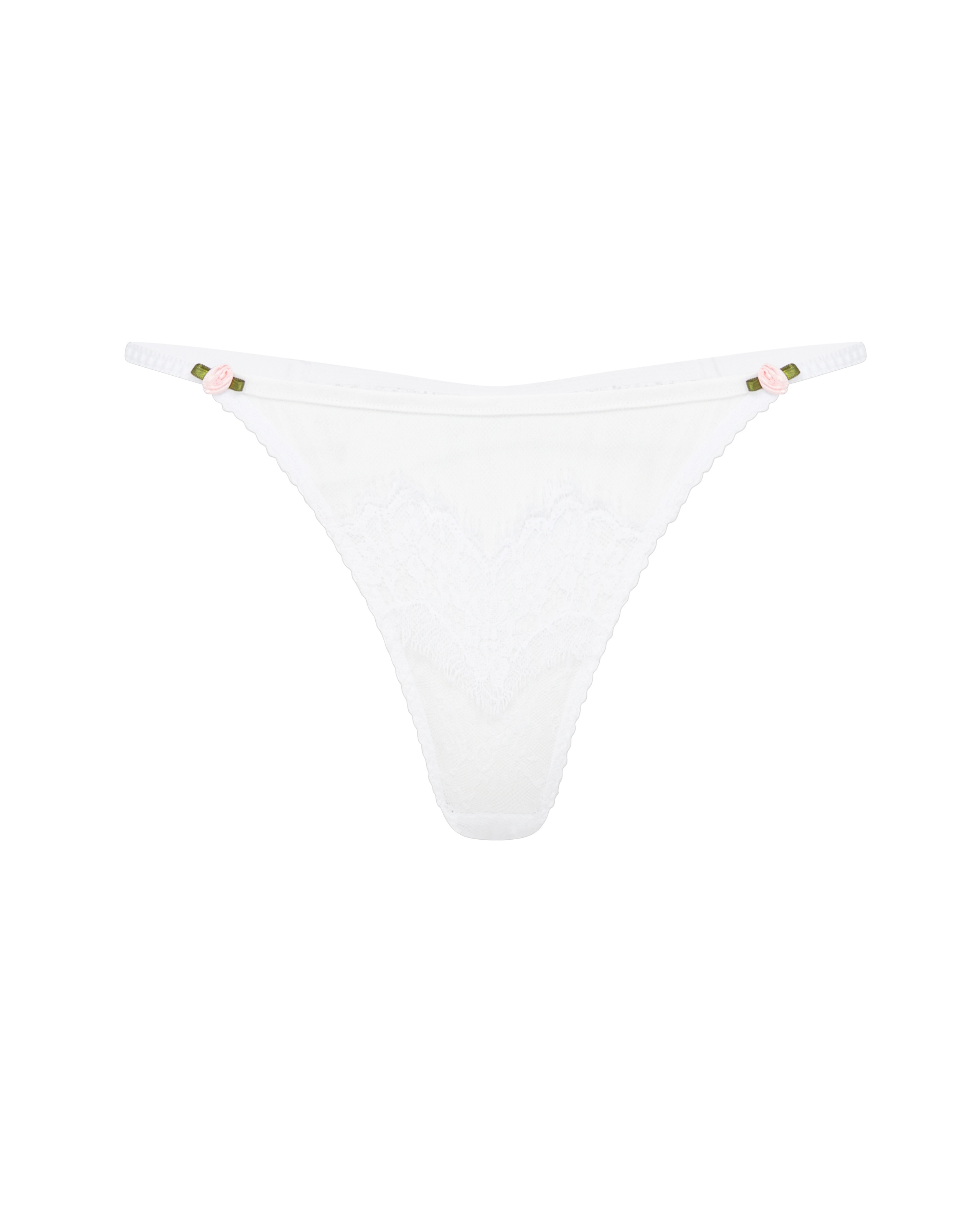 Трусы стринги Clarissa белого цвета с деталями в виде бутонов роз привносят винтажный гламур в яркую современную эстетику AP. Модель сочетает французское кружево Leavers и фирменное кружево с монограммой AP. Коллекция Clarissa создана, чтобы стать вашей новой одержимостью.