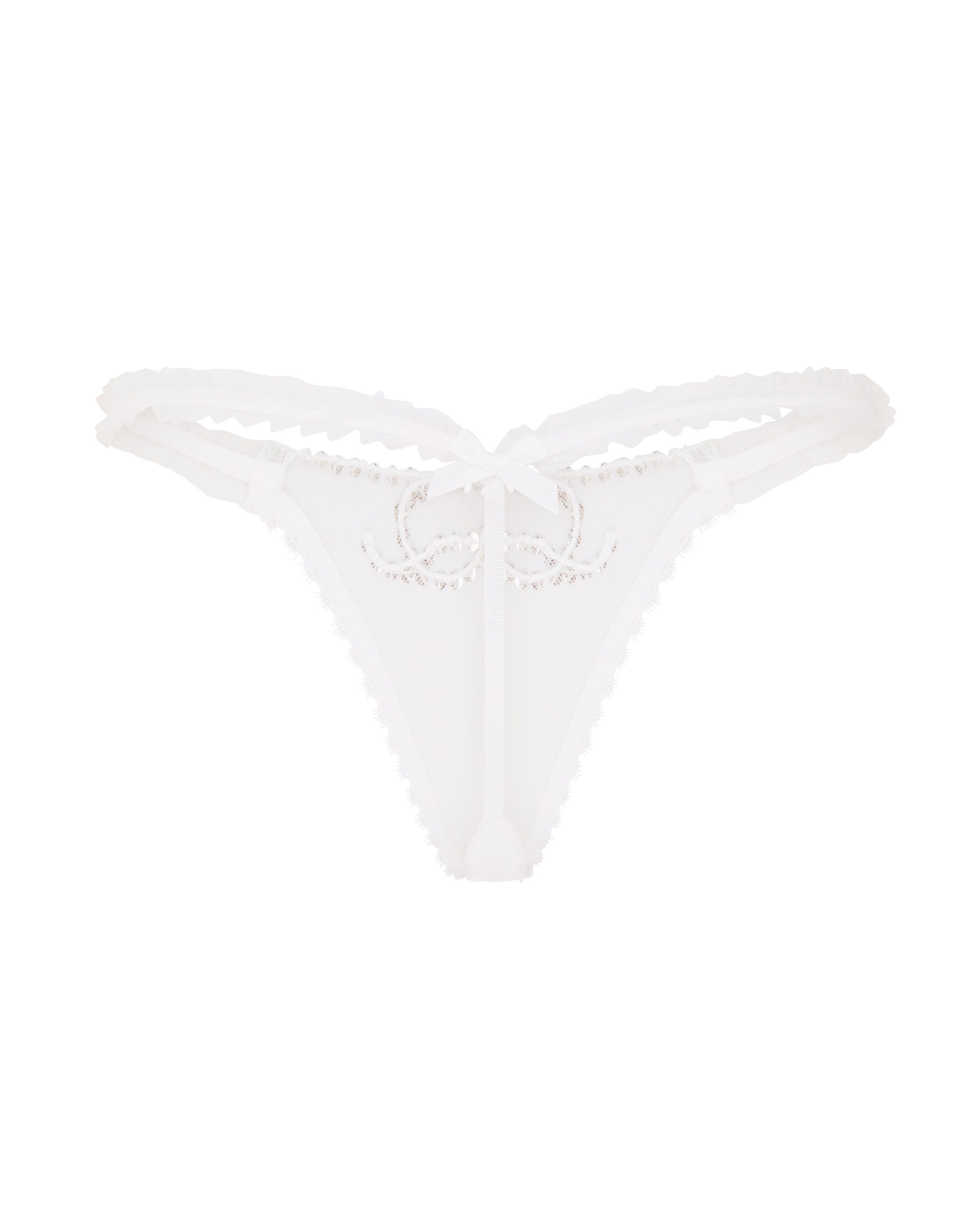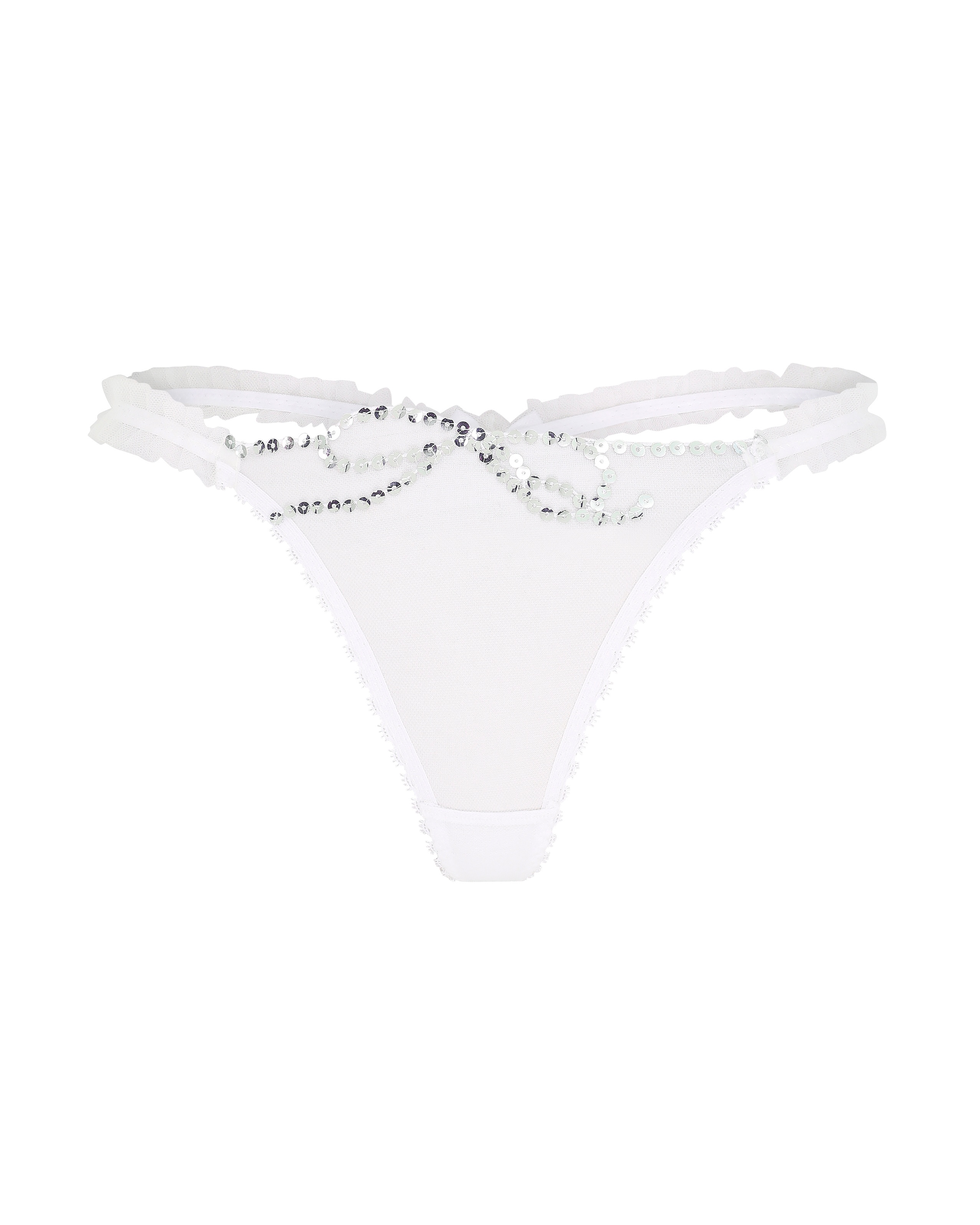 Трусы стринги Melle из прозрачного тюля украшены сверкающими пайетками и нежными рюшами по бокам и сзади. Изящное кружево с ресничками обрамляет края, создавая воздушный образ. Дополните образ другими элементами коллекции Melle для создания идеального комплекта.