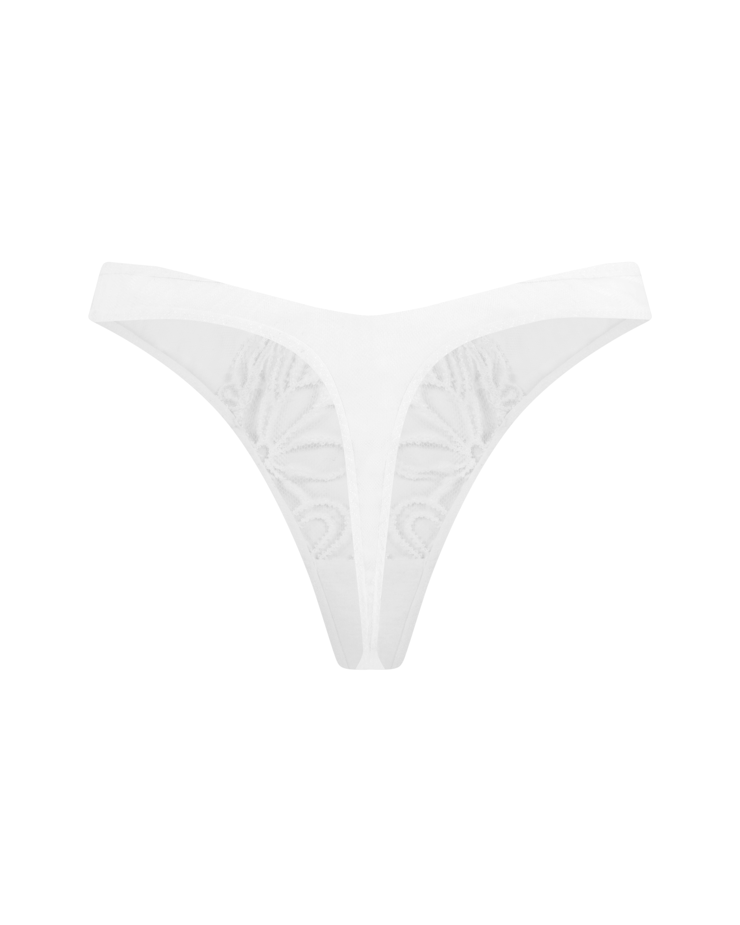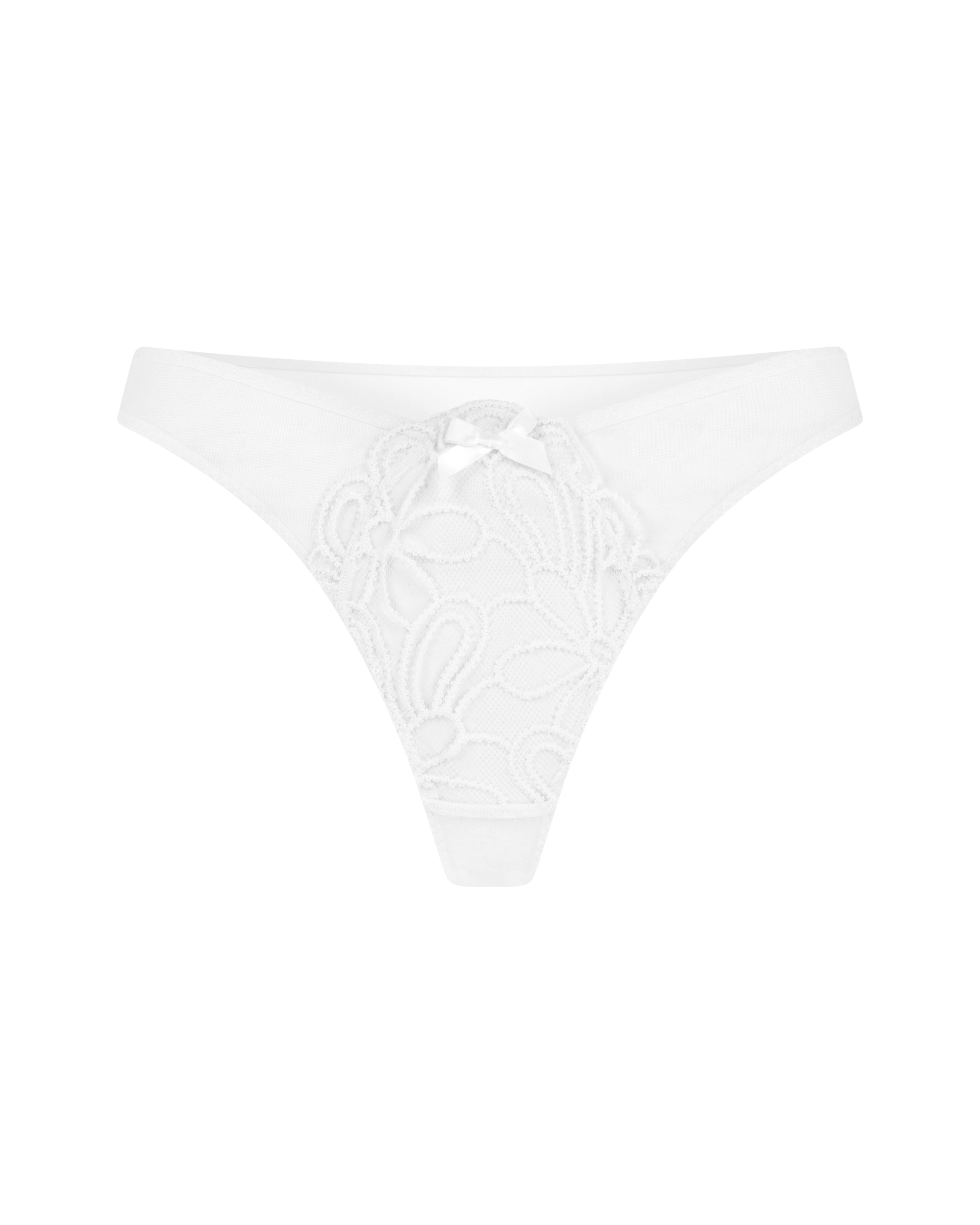 Трусы стринги Nelle белого цвета: прозрачная модель с вышивкой в виде ромашек и соблазнительным итальянским тюлем сзади. Нежные банты как завершающий штрих. Модель, созданная для того, чтобы ее снимали… или оставляли для интриги. Сочетайте с полным комплектом Nelle, чтобы привнести в повседневность томное желание.
