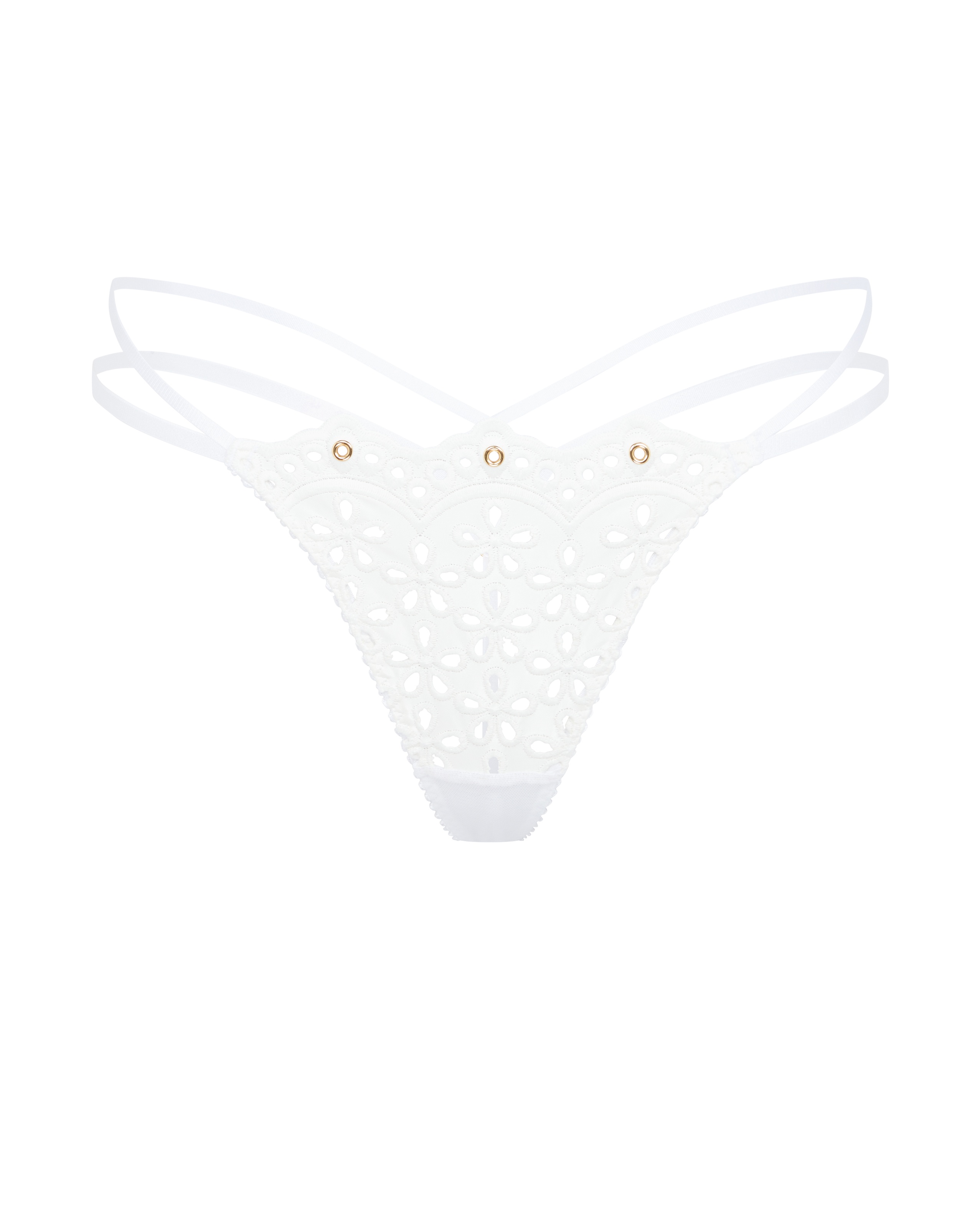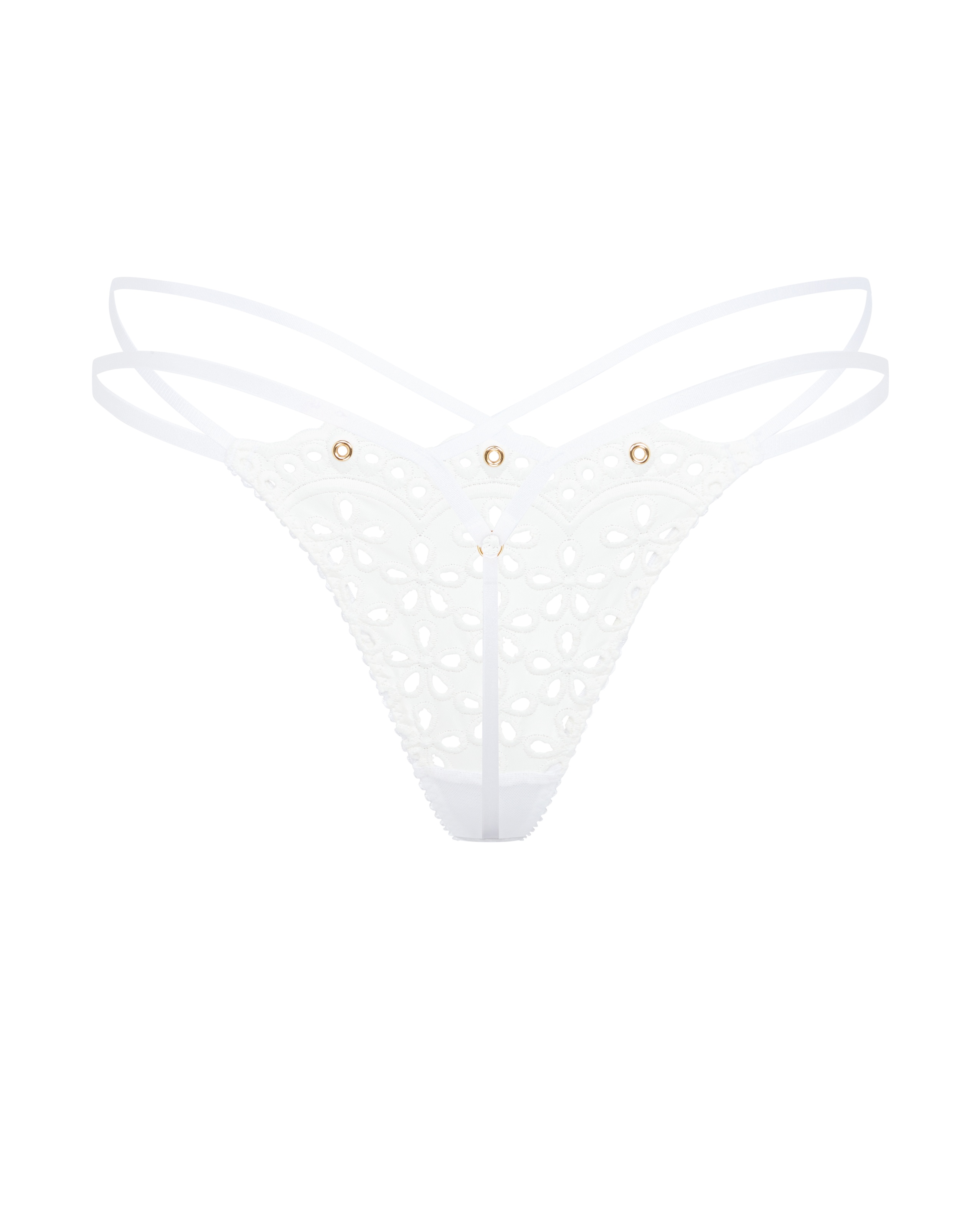 Белые стринги Nicoletti: глянцевый ПВХ с цветочной вышивкой броше и ажурными прорезями. Контрастные детали из золотистых люверсов и двойные бретели по бокам завершают дерзкий дизайн. Создайте гармоничный образ с комплектом Nicoletti.