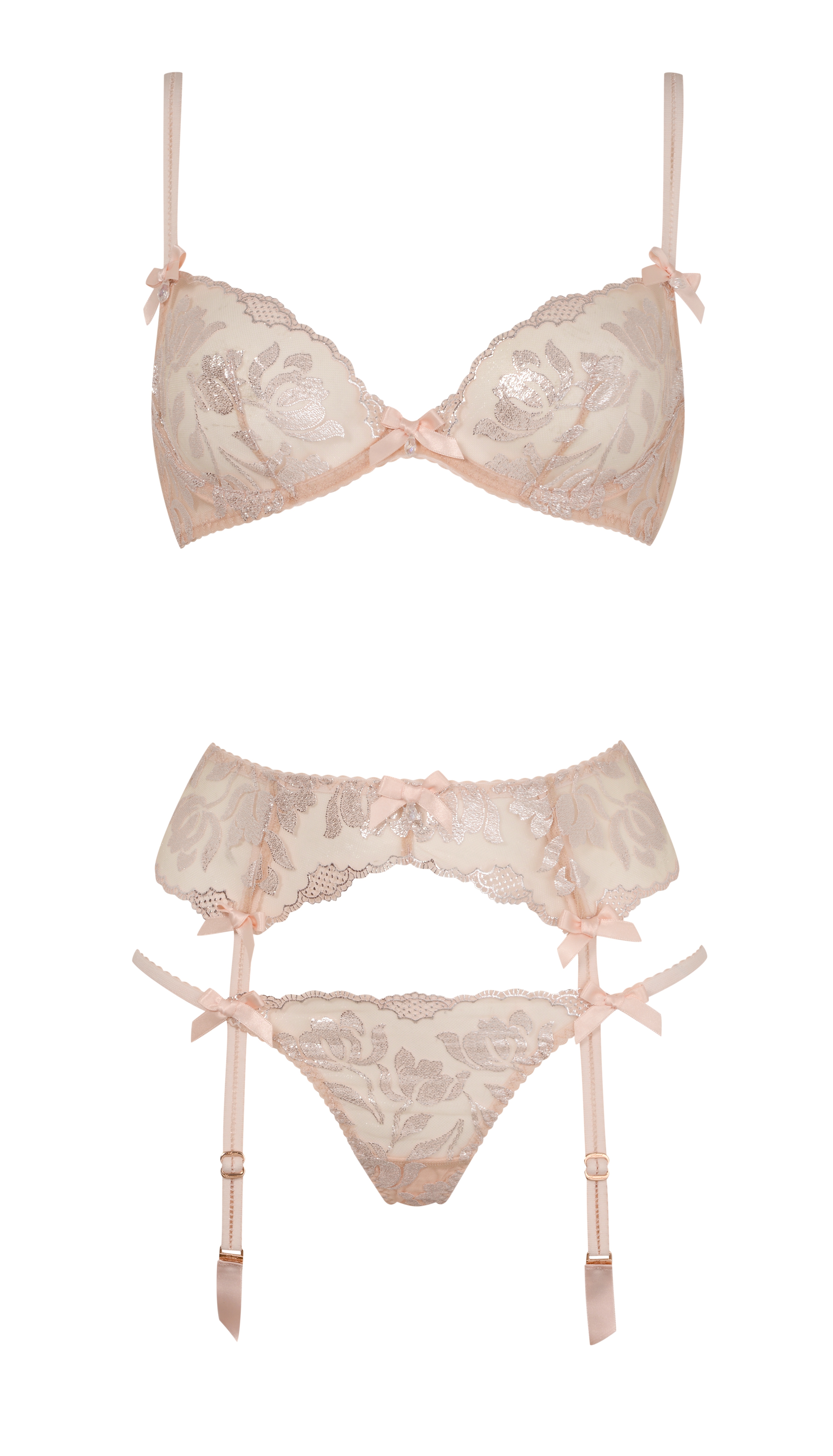 Очаровательная Sparkle - это женственные цветочные узоры в современной интерпретации. Милый и сексуальный пояс из прозрачного тюля украшает цветочная вышивка персикового цвета и серебряное покрытие с эффектом металлик. Шелковые бантики с подвесками из кристаллов и пажи того же оттенка дополняют образ.