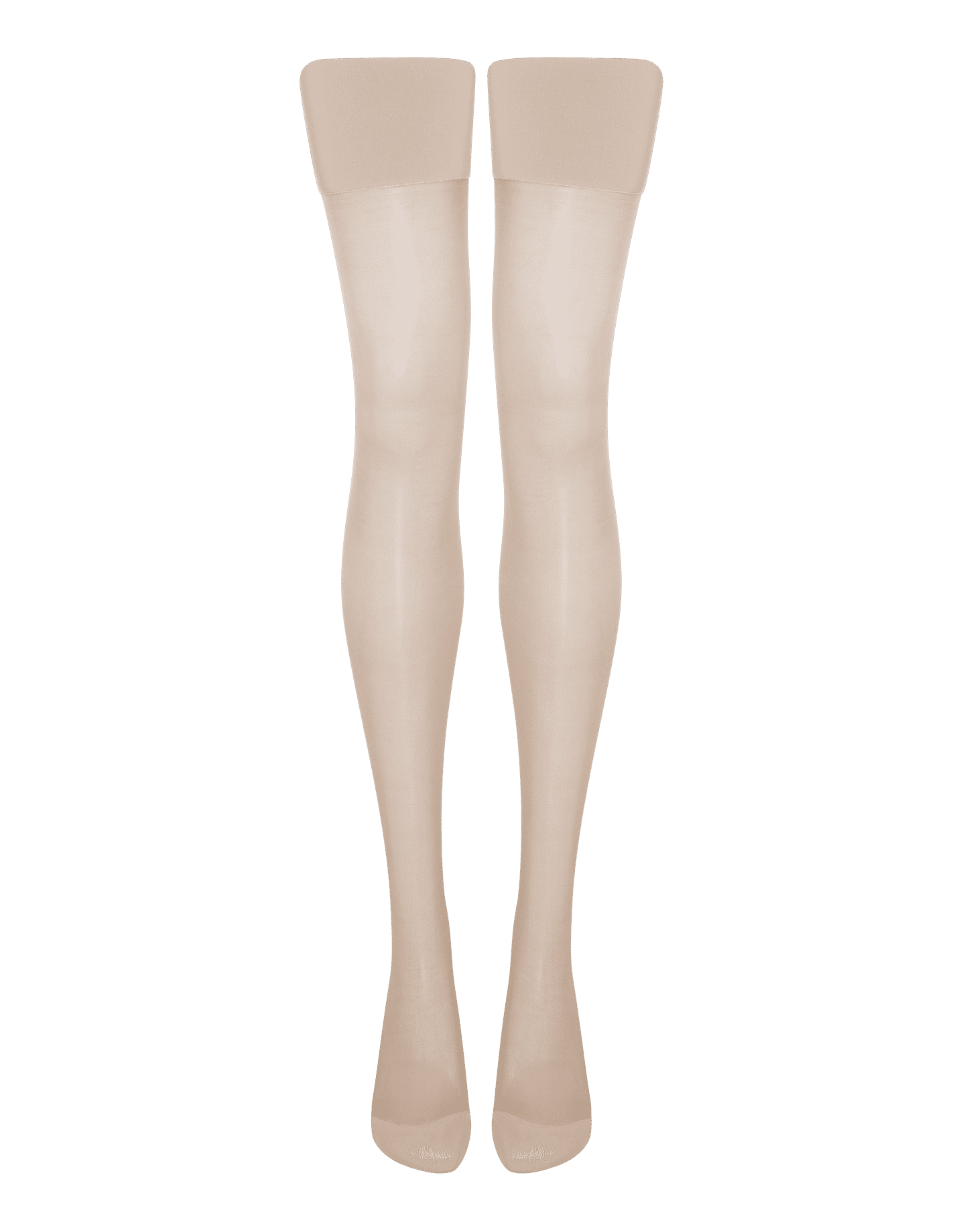 Тонкие чулки цвета шампанского Amber выполнены из нейлона с незначительным сатиновым блеском. Плотность 15 ден, плотные широкие манжеты для крепления к поясу для чулок, укрепленная носочная часть. Тонкий шов посередине отсылает к моделям в стиле ретро. Изделие сочетается с любым поясом или корсетом Agent Provocateur.
