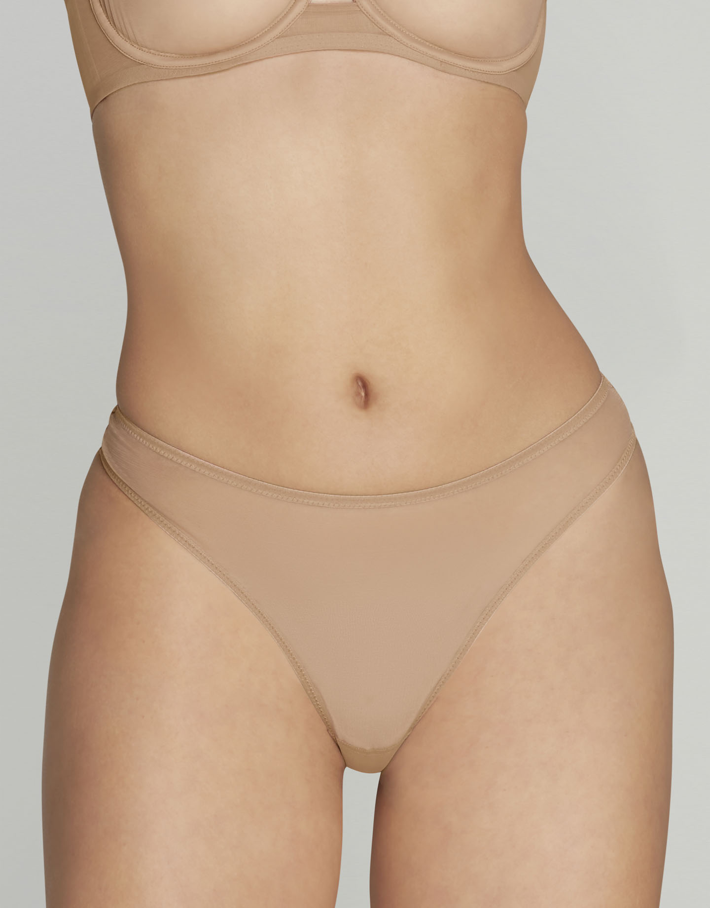 Стринги Lucky на высокой посадке сшиты из бежевой эластичной сетки. Изделие совмещает в себе комфортный повседневный крой и люксовые материалы. Для создания этой модели использован бельгийский эластичный тюль, дублированный в зоне ластовицы хлопком. Тонкие швы обработаны тянущимся швом зигзаг.