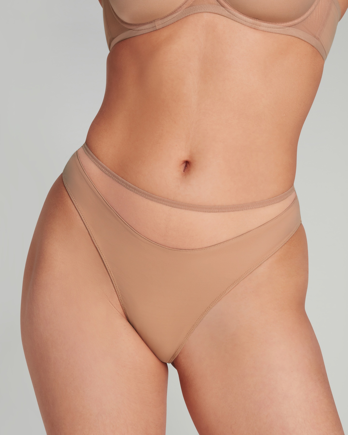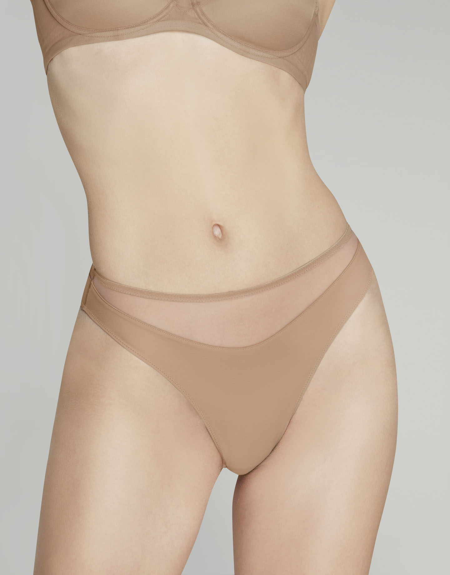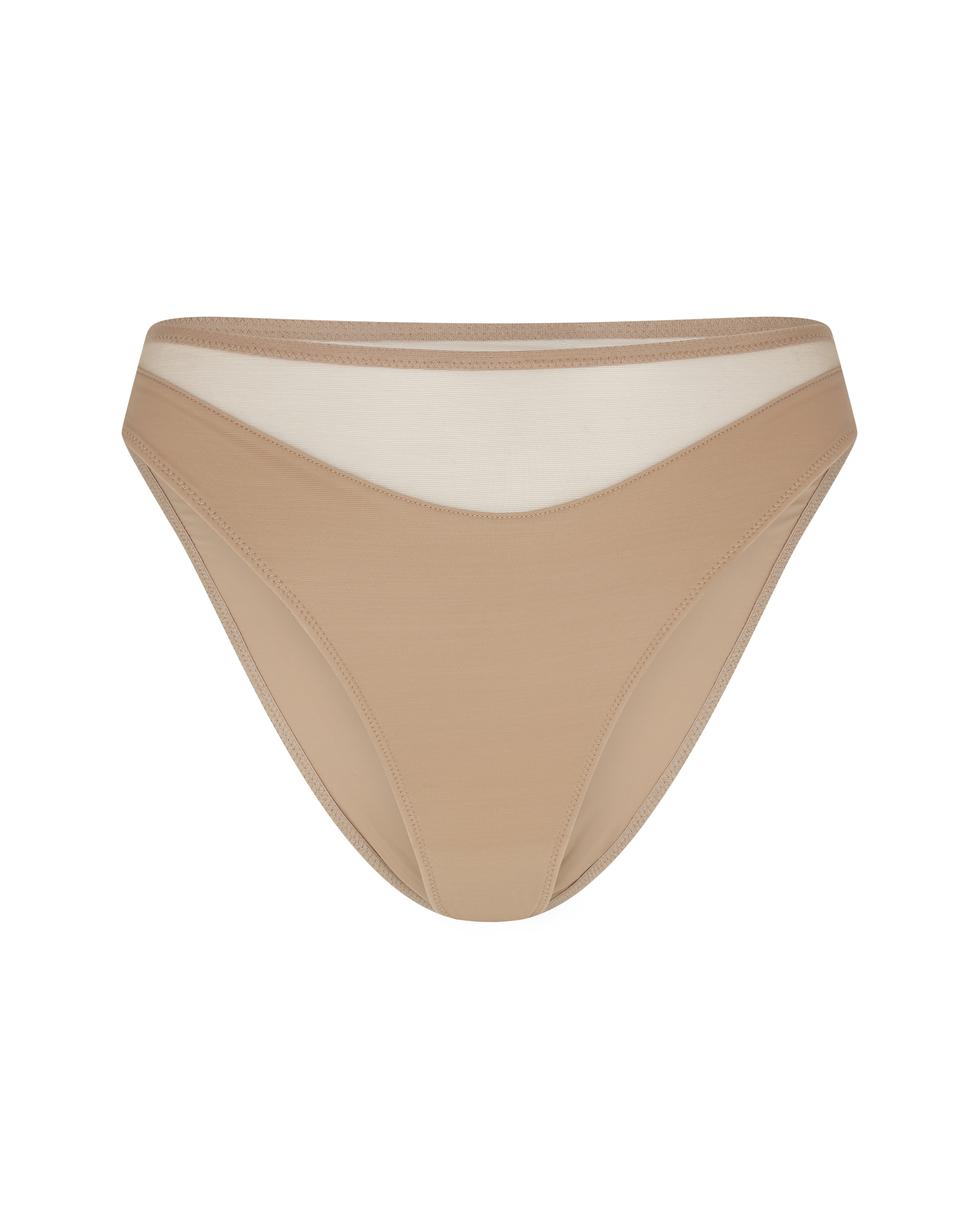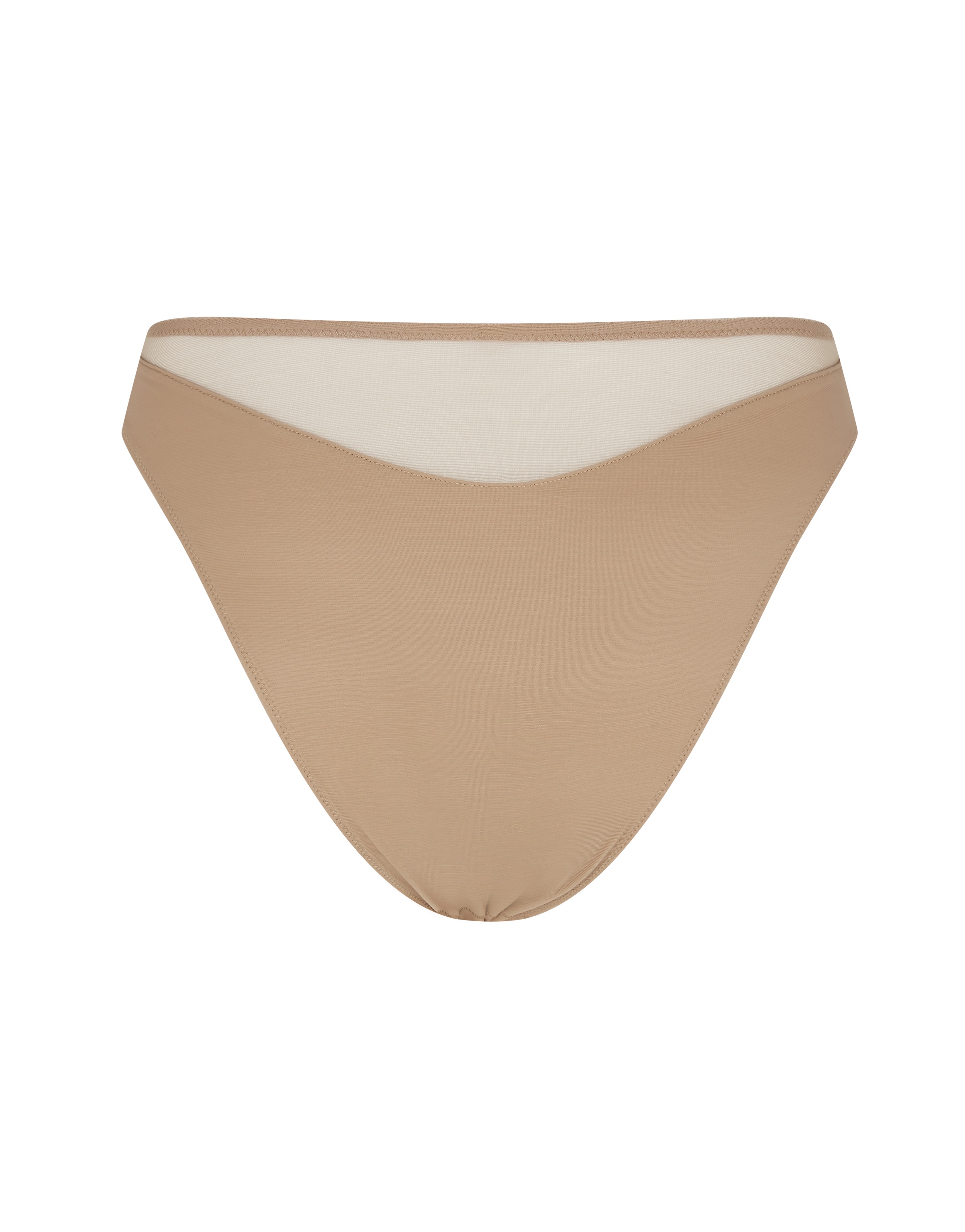 Бежевые трусики классического кроя из коллекции Lucky выполнены из эластичного тюля. Подкладка из мягкой микрофибры не доходит до верха, образуя узнаваемые полукруглые детали. Эффект просвечивающей кожи сквозь тонкий тюль — характерная черта базовой коллекции Agent Provocateur.