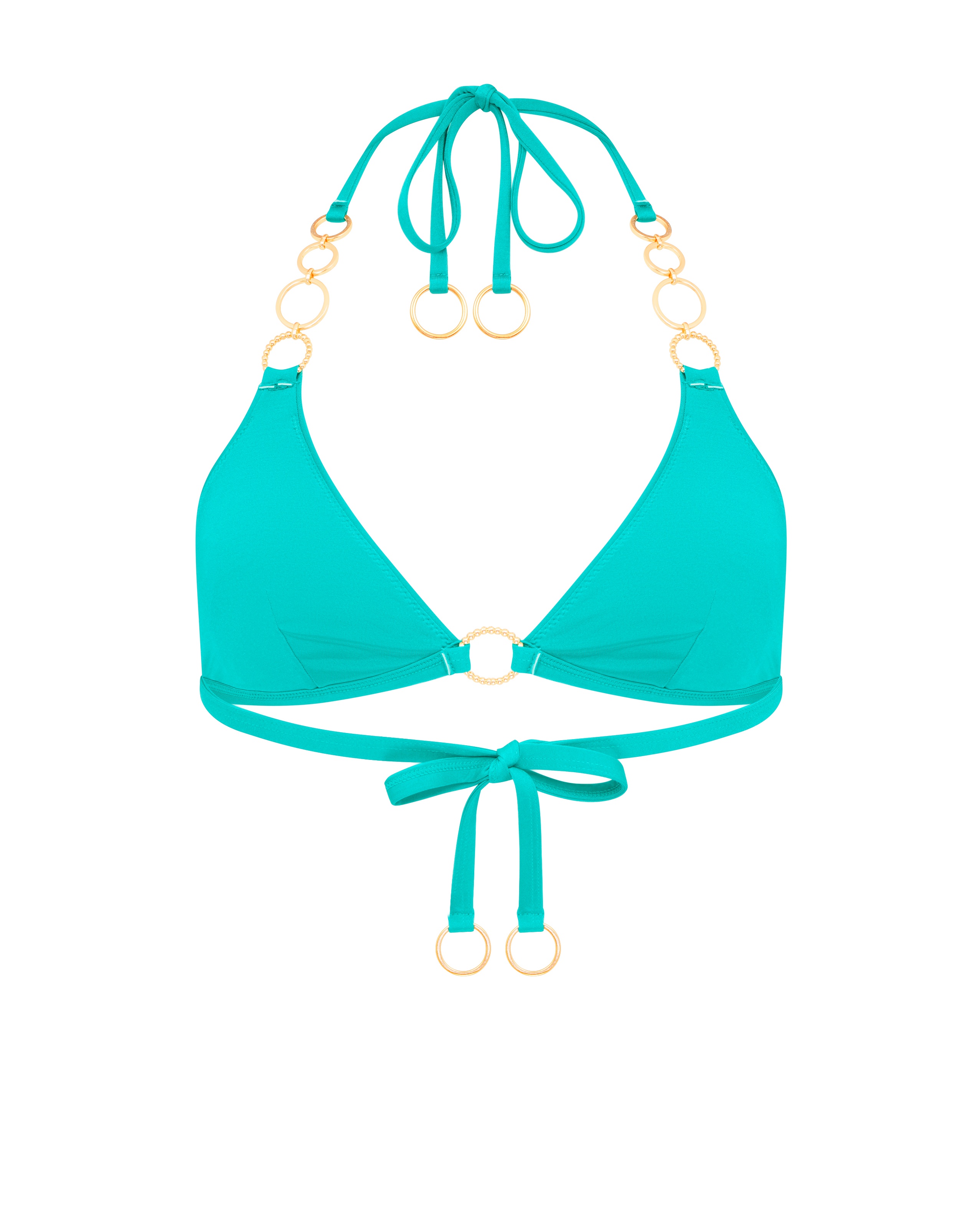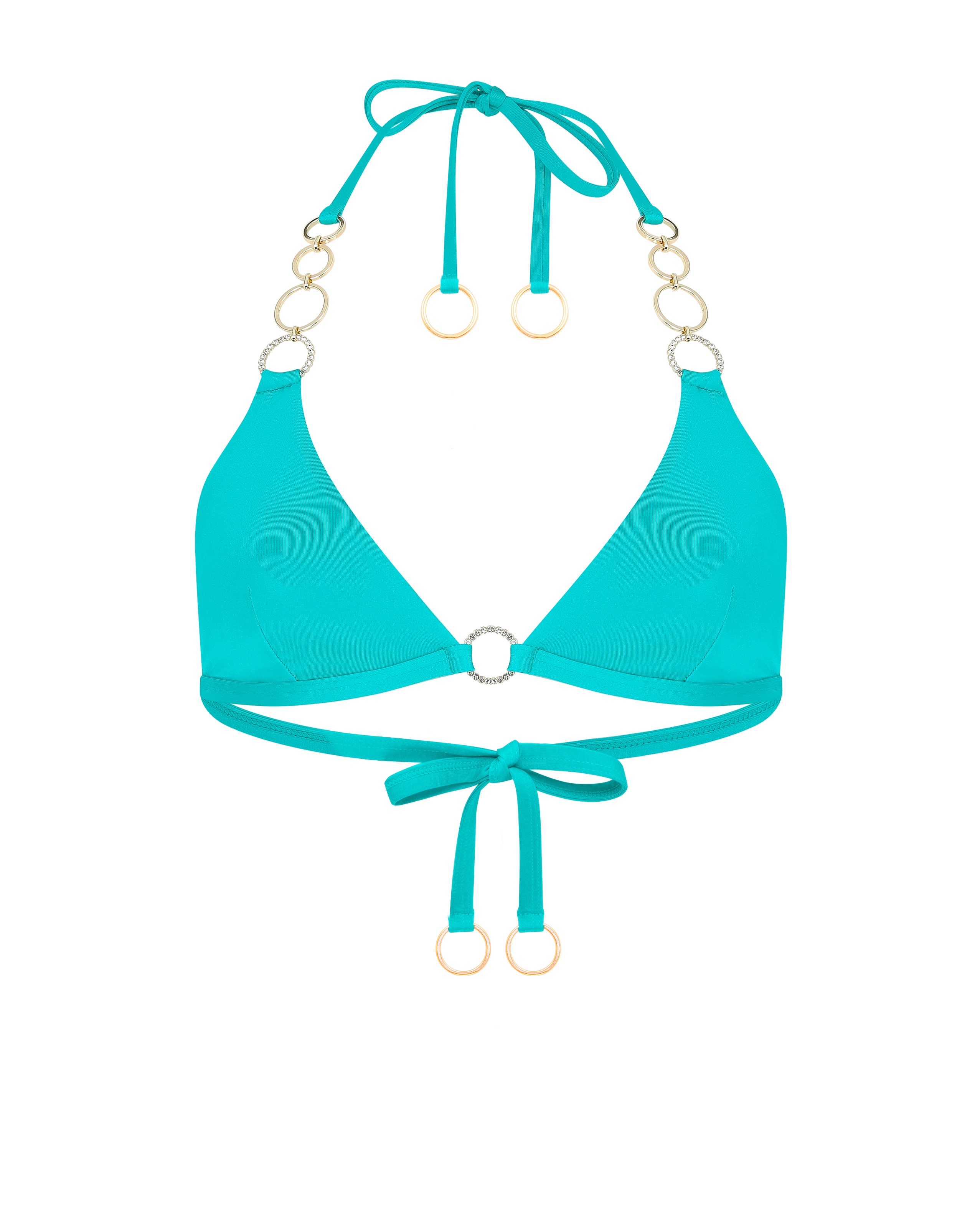 Бирюзовый топ Lustia с треугольными чашками и деталями из кристаллов, устойчивыми к жаре и воде. Носите его с плавками из этой коллекции для идеального летнего дуэта.