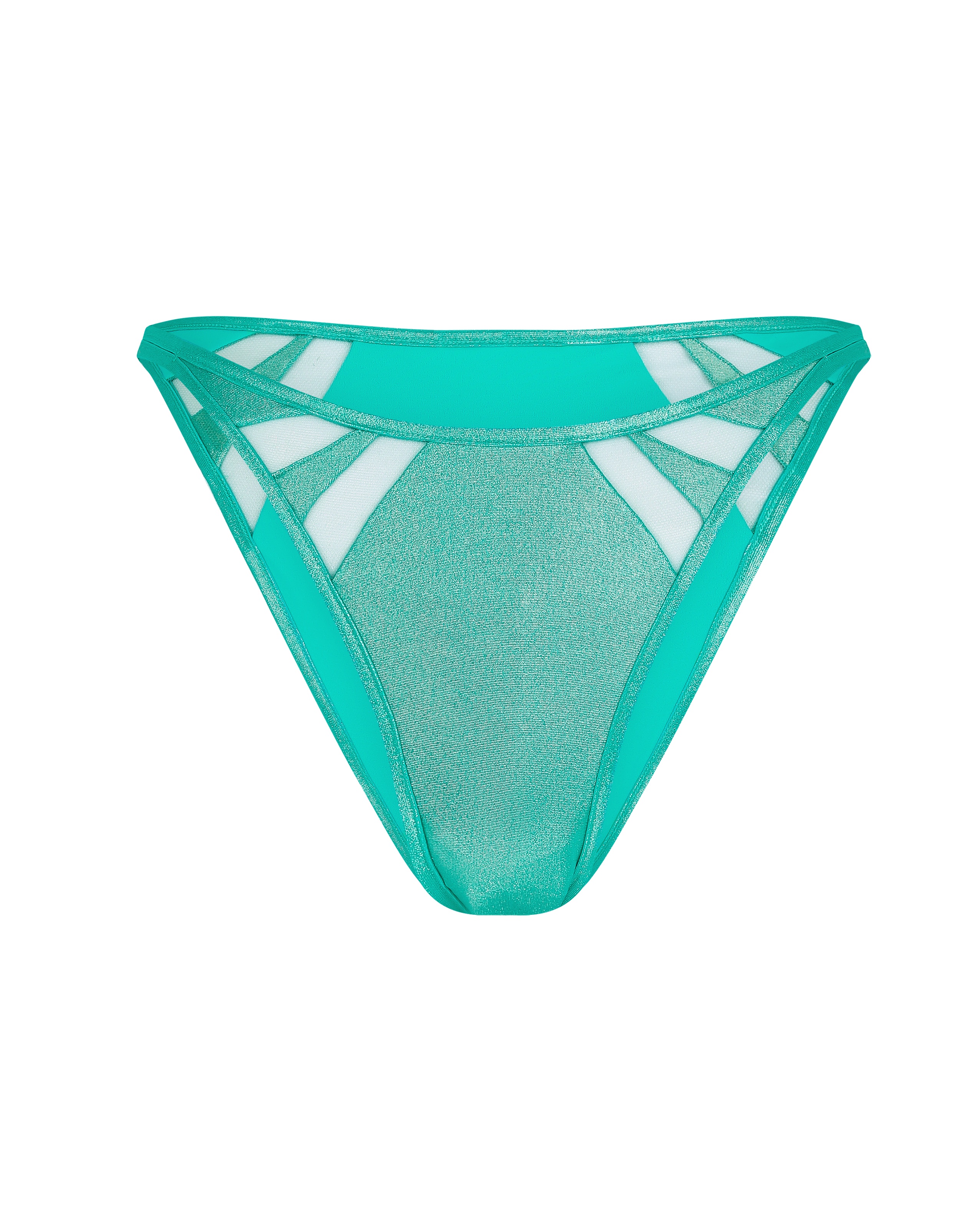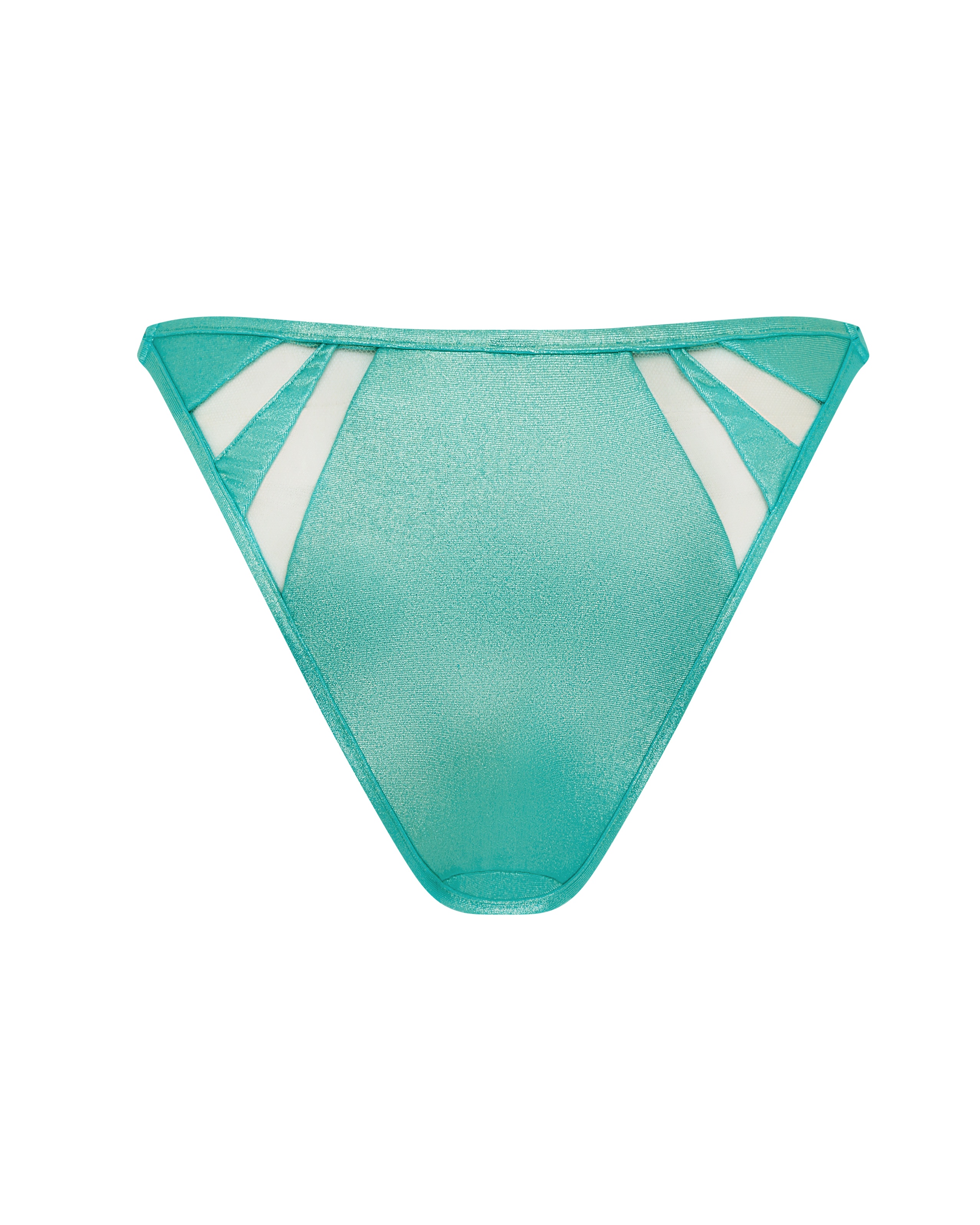 В коллекции Tora бирюзового цвета представлены плавки с низкой посадкой из эластичной ткани с прозрачными вставками из тюля. Комбинируйте с топом из этой же коллекции.