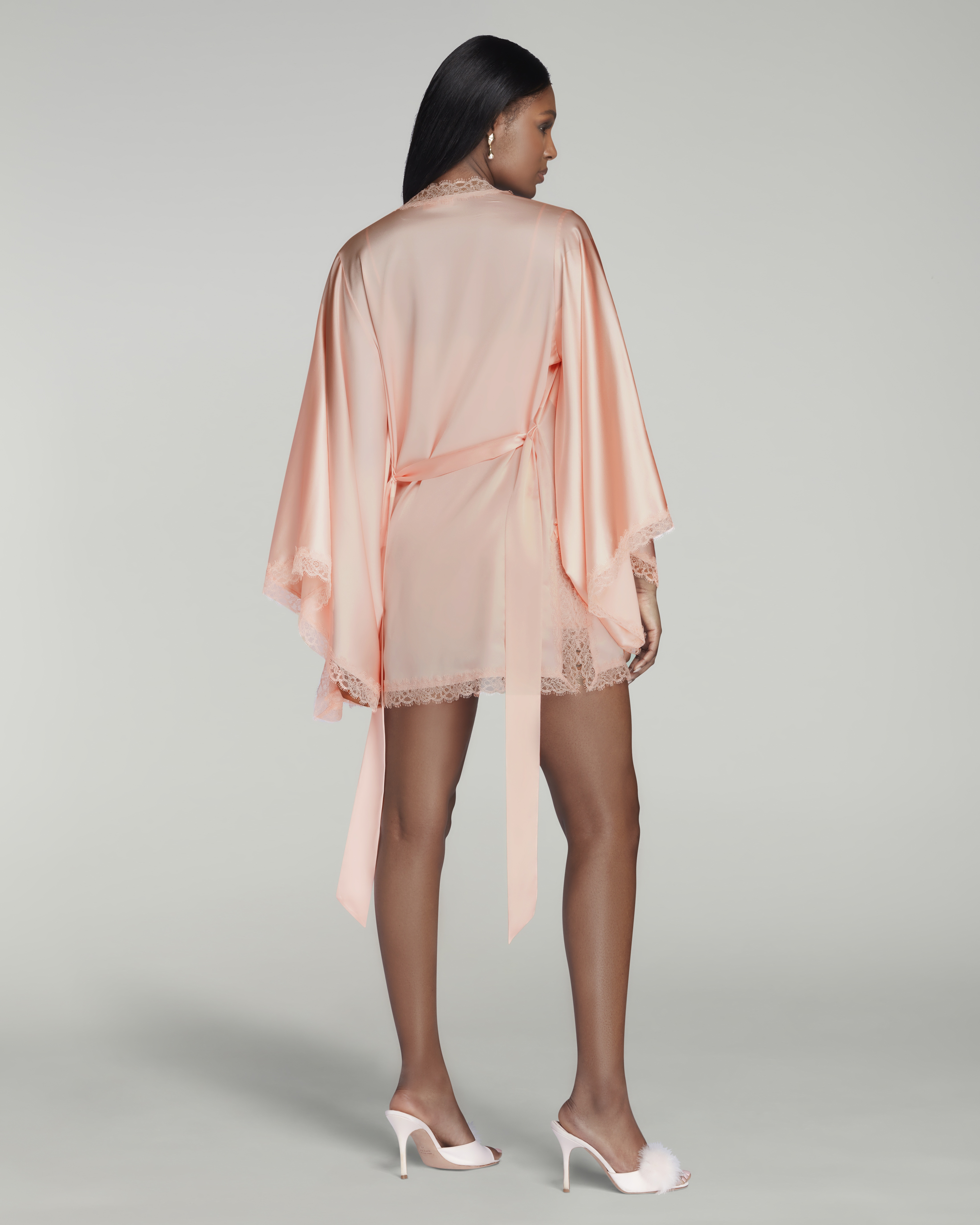 Создайте изысканный и нежный образ в халате Gisele, дополняя его сорочкой из этой же линейки. Халат покроя кимоно с характерными широкими рукавами сшит из струящегося шелка и украшен тонким полупрозрачным кружевом. Пояс в комплекте.