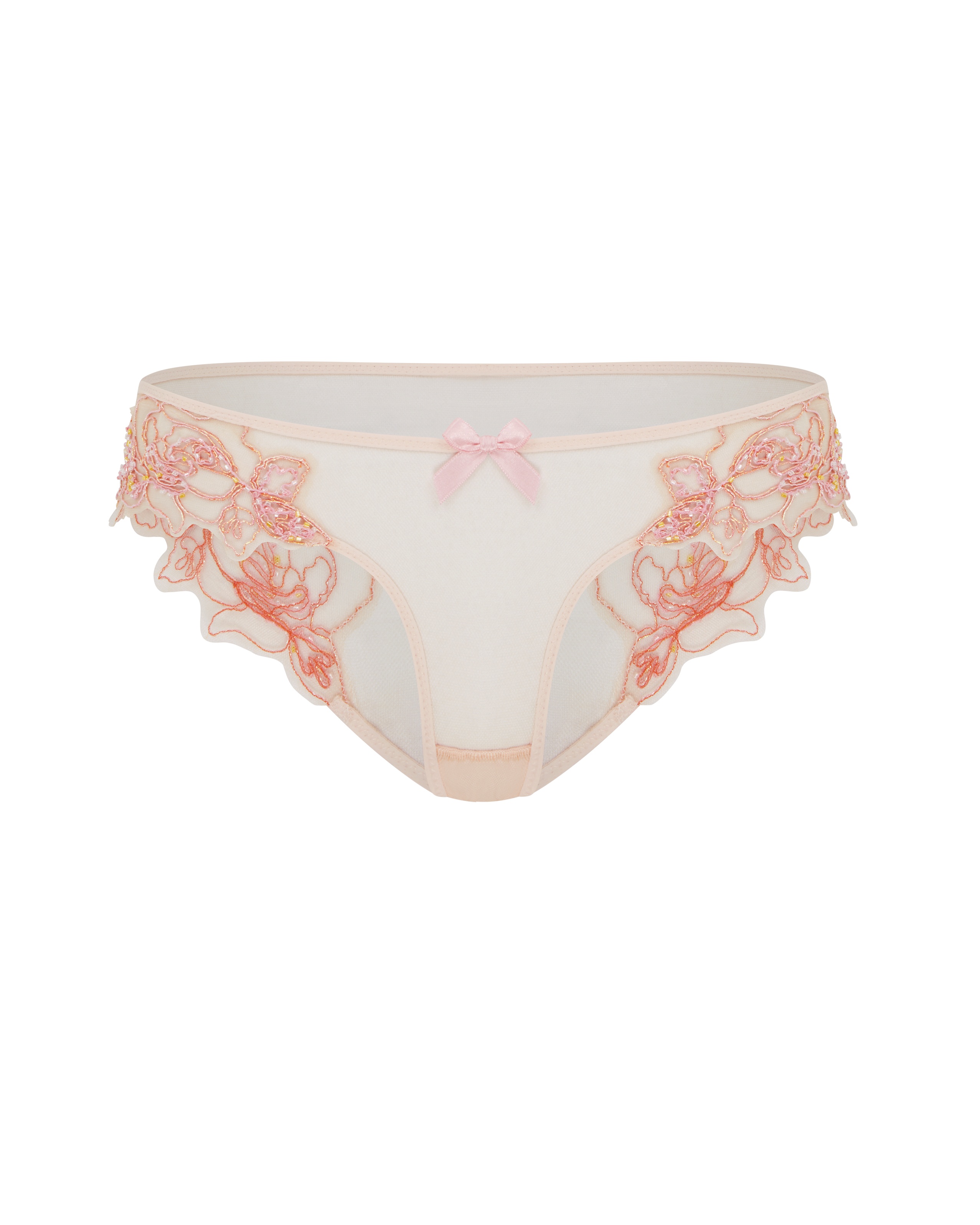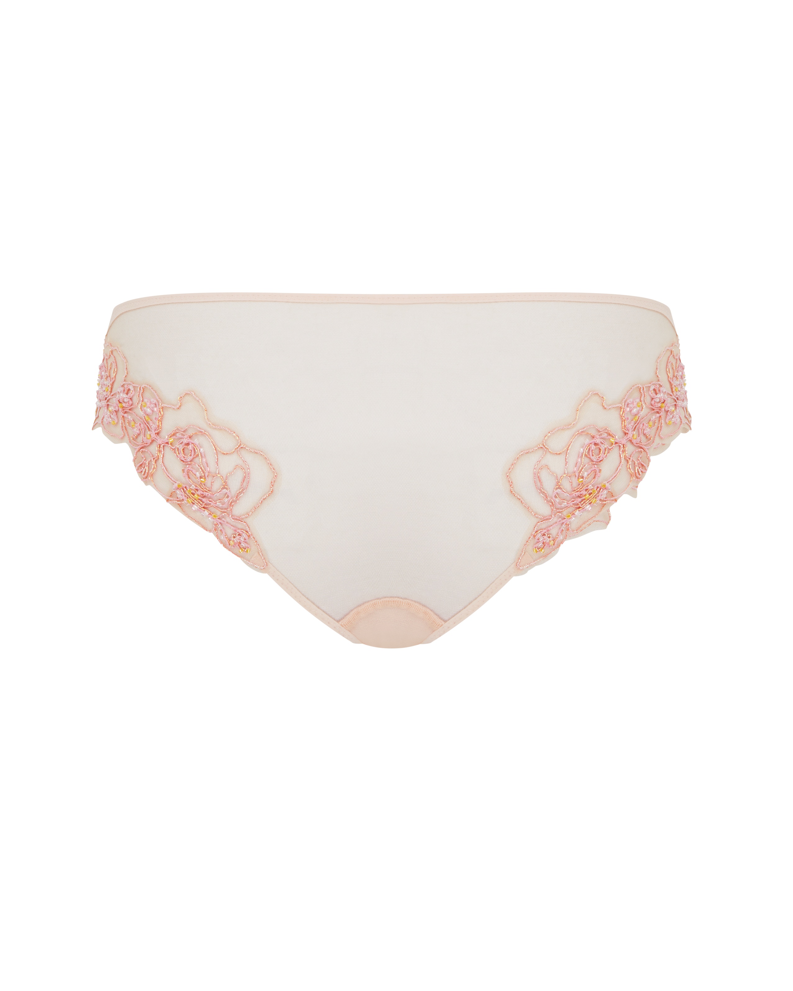 Трусы брифы Lindie в светло-розовом цвете дополнят романтический образ для особых случаев в паре с бюстгальтером и поясом для чулок из этой же линейки. Модель выполнена из тонкого, просвечивающего кожу тюля с изысканной вышивкой. Контуры цветов расшитые вручную бисером, что создает сверкающий эффект.