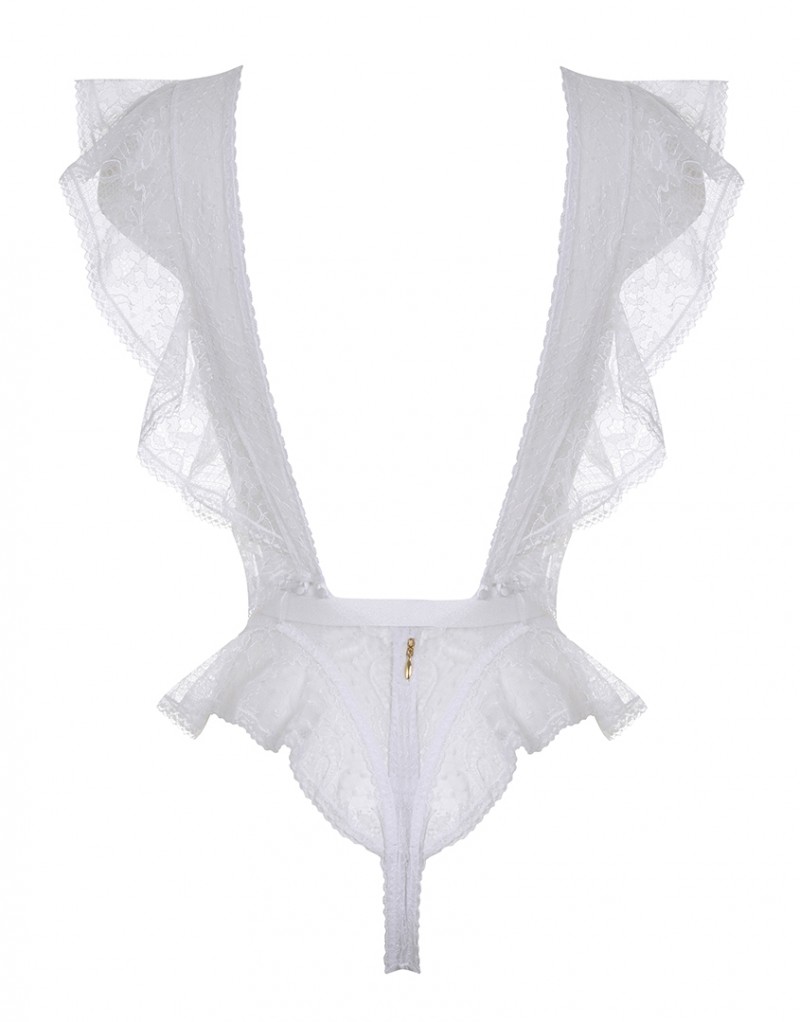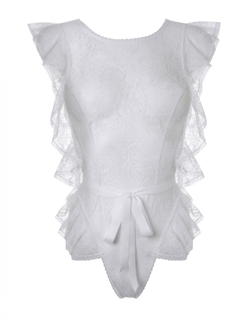 Незабываемо красивая кокетка Fee - модель из полупрозрачного белого кружева, которая соблазнительно обнажает тело. Боди с глубоким вырезом на спине, напоминающее сексуальный передник, украшено оборками на плечах и вдоль бедер. Отстегивающийся пояс из крепдешина завершает образ. - Модель из свадебной коллекции Fee - Боди со стрингами и глубоким вырезом на спине застегивается на потайную молнию сзади Материалы и уход: Основной материал: 60% полиамид, 40% эластан. Подкладка: 60% полиамид, 40% эластан. Черная вышивка: 100% хлопок. Блестящая вышивка: 100% полиэстер. Рекомендована ручная стирка.