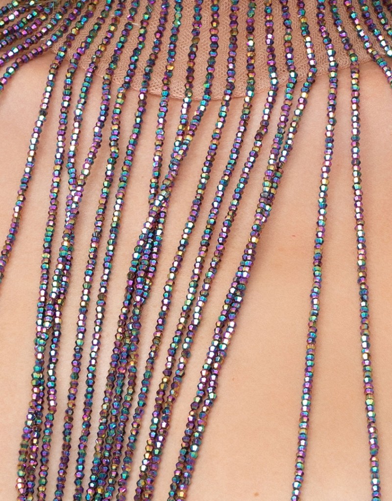 Украсьте себя драпировками из сверкающих кристаллов для ослепительного и восхитительного обнажения. Новая версия нашего боди-бестселлера выполнена из нанизанных вручную блестящих пурпурных бусин. Вышитый воротник, ниспадающие каскадом от груди к талии мерцающие нити и декоративная юбка, длина которой регулируется по вашему желанию, завершают образ. Детали: единый размер. Трусики и накладки на грудь продаются отдельно.