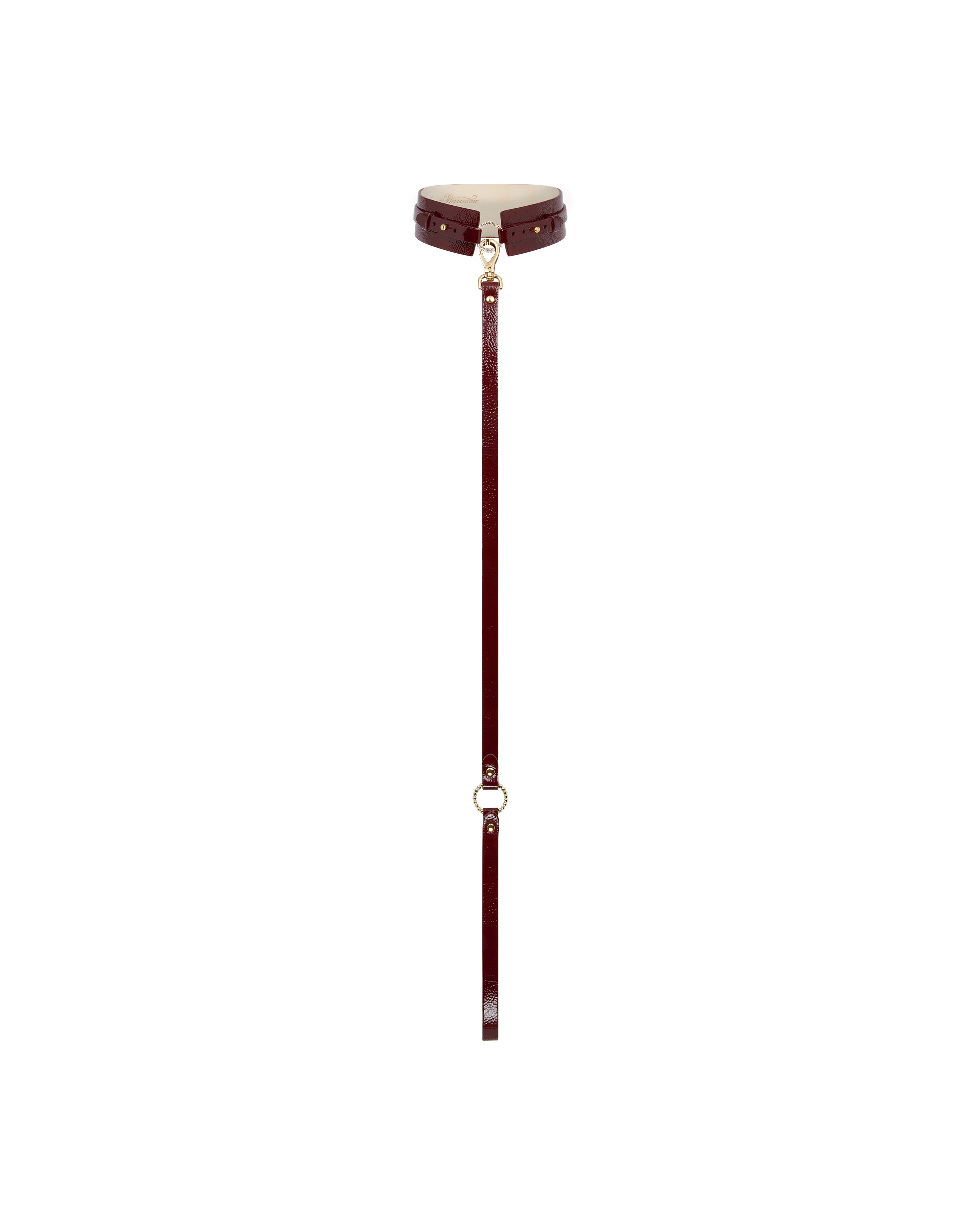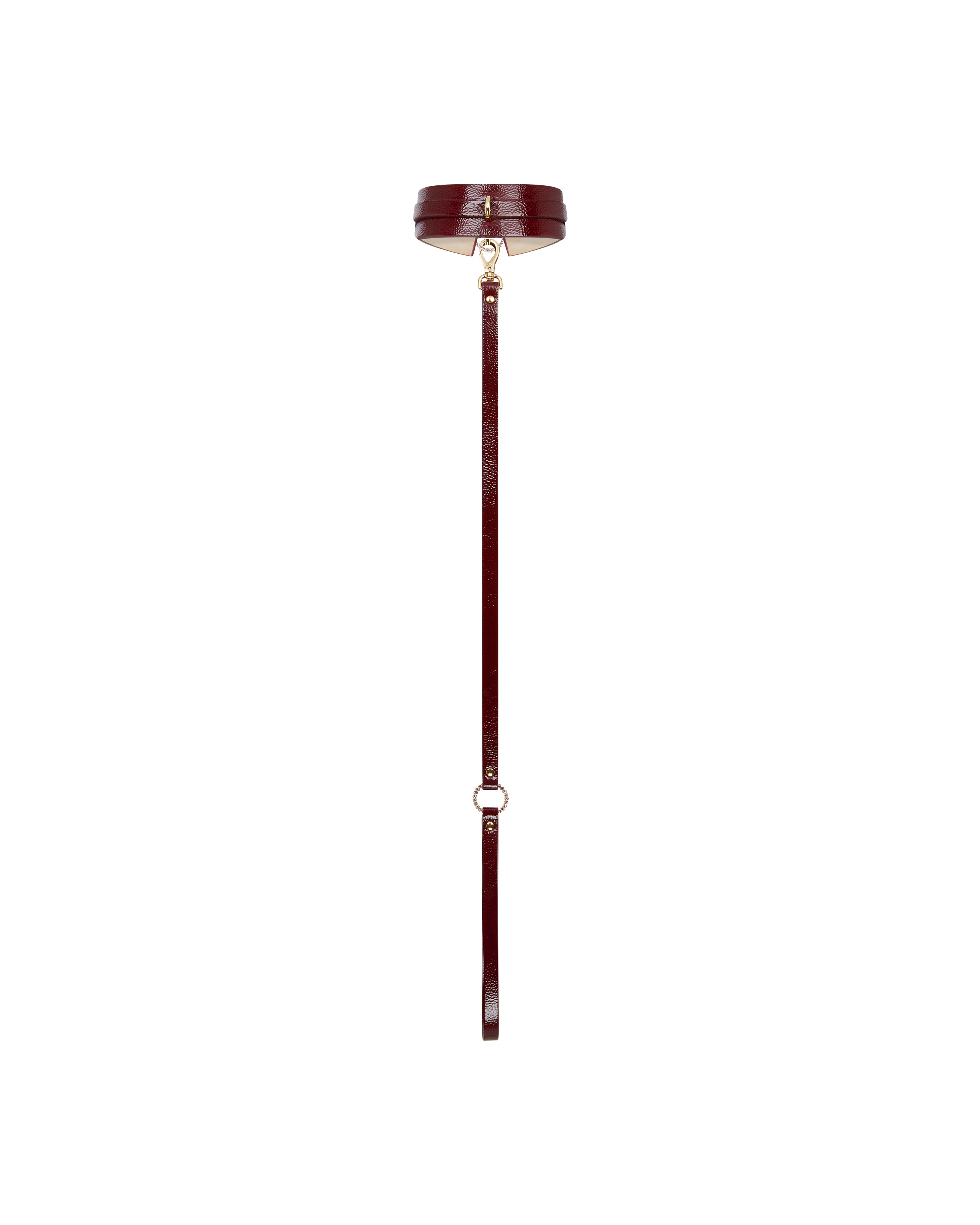 Чокер Darlina из лакированной фактурной кожи дополнен мягкой подкладкой и золотистой фурнитурой. Съемный поводок добавляет вариативности.